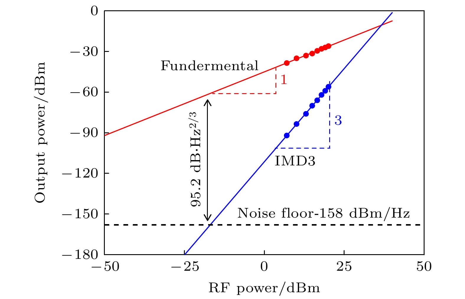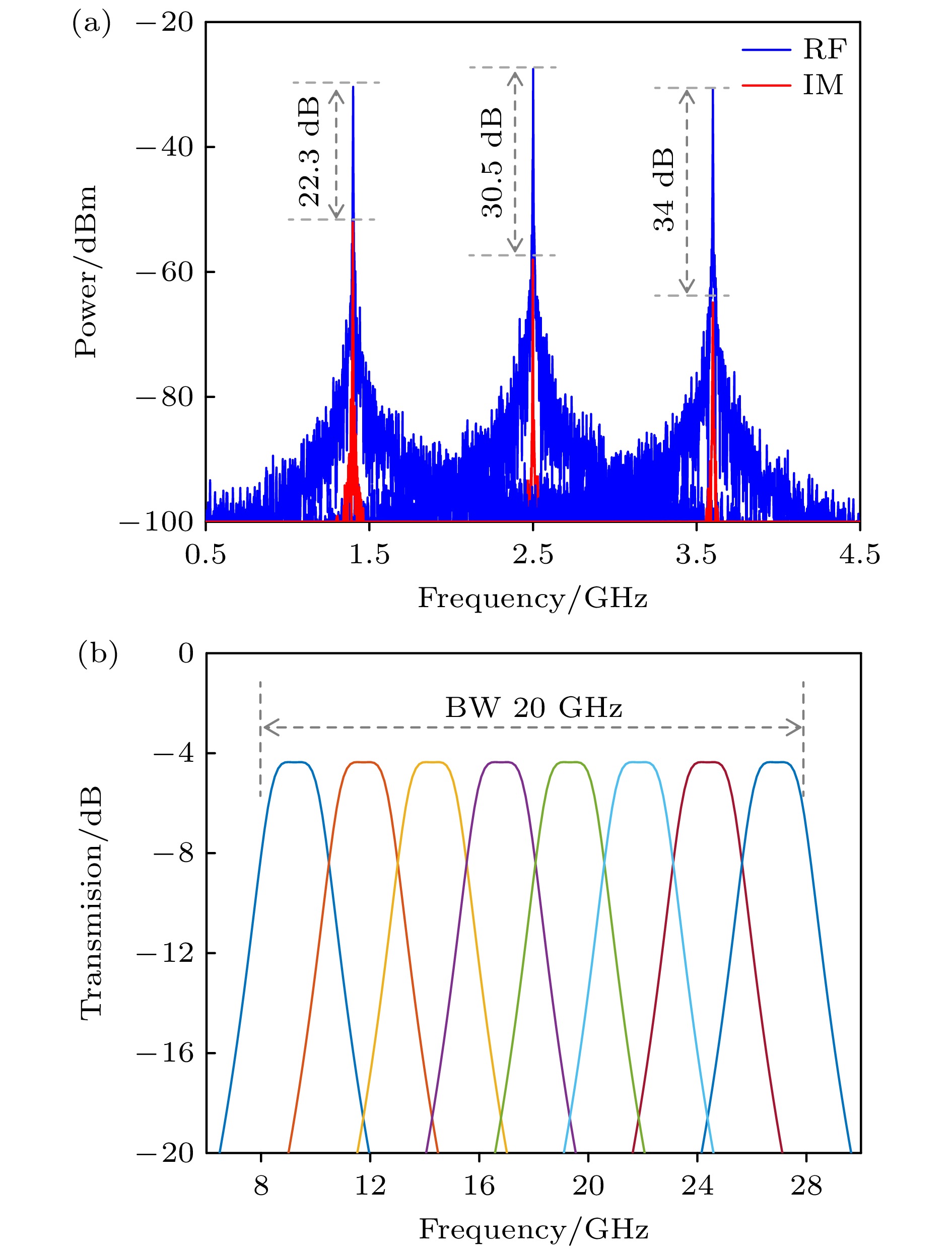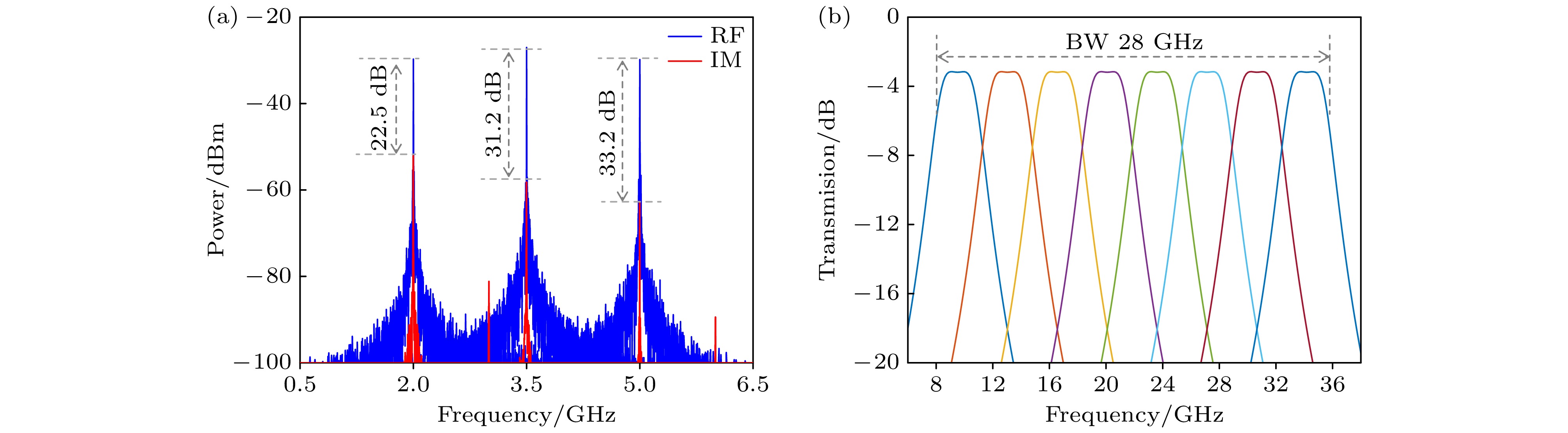Power coupling ratios 3 dB BW/GHz ER/dB SF FSR/GHz IL/dB k1 = 0.0970; k2 = 0.0087; k3 = 0.0970 2.25 48 3.08 57.2 4.4 k1 = 0.113; k2 = 0.012; k3 = 0.113 2.62 46 3.14 57.2 4.0 k1 = 0.147; k2 = 0.014; k3 = 0.147 3.12 42 3.1 57.2 3.2 表 2 微波光子信道化接收器性能比较. WBW为工作带宽, CBW为信道带宽, IMRR为图像抑制比