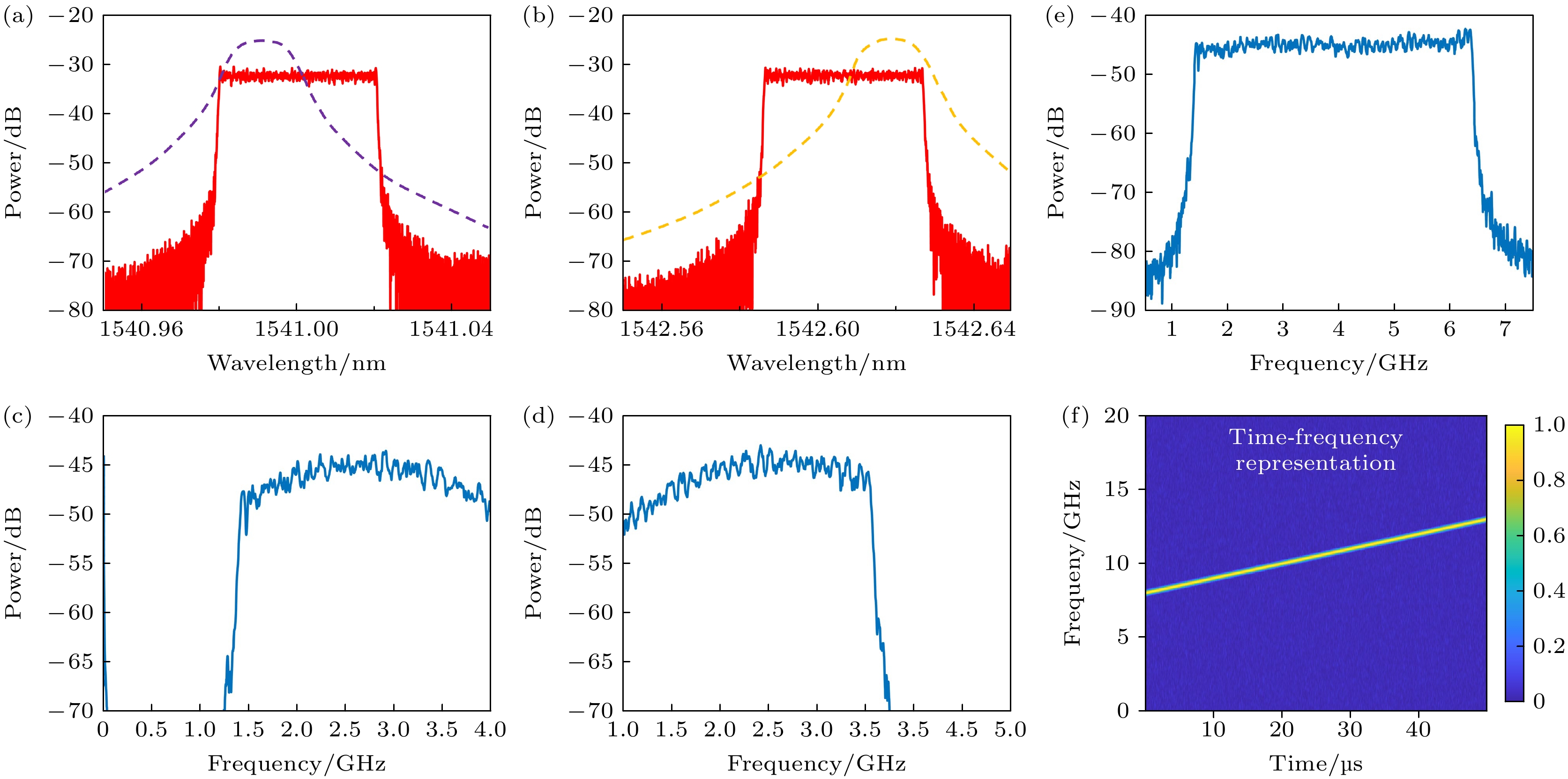 Fig. 8. (a), (b) Filtering and slicing of the LFM signal using two CROW optical filters; (c), (d) electrical spectra after down-conversion through mixing between two signal comb lines and the local oscillator; (e) the down-converted LFM signal spectrum in the frequency domain and (f) its up-converted time-frequency diagram.