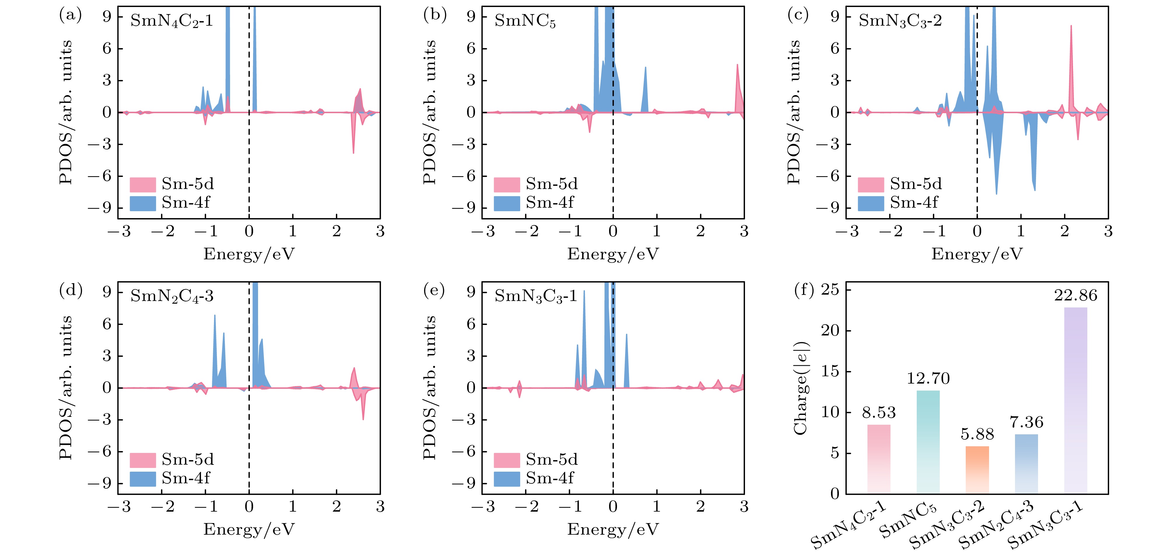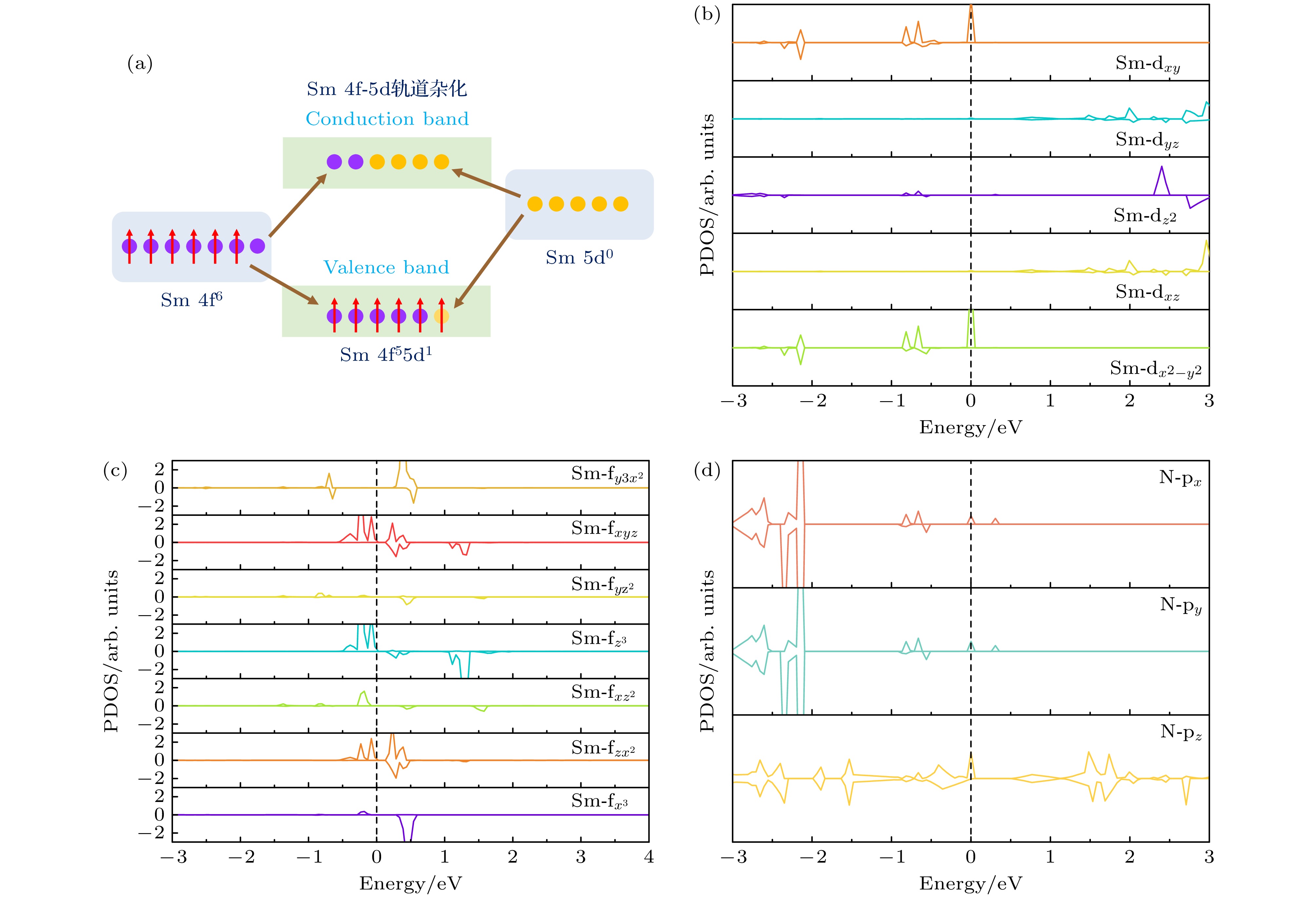 图 6 (a) Sm 4f-5d轨道杂化示意图; (b) SmN3C3-1中Sm 5d轨道的5种分轨道的投影态密度; (c) SmN3C3-1中Sm 4f轨道的7种分轨道的投影态密度; (d) SmN3C3-1中N 2p轨道的3种分轨道的投影态密度