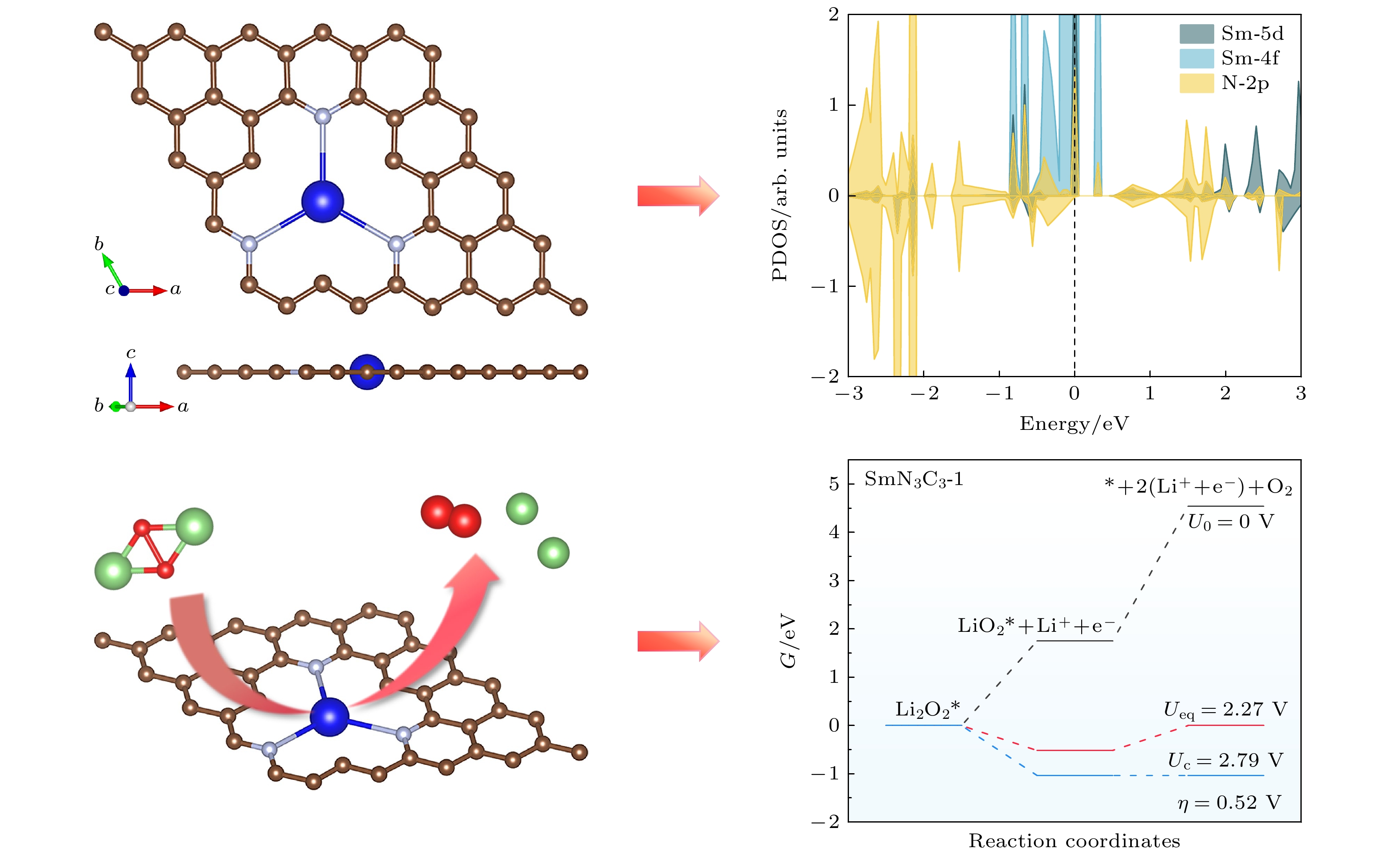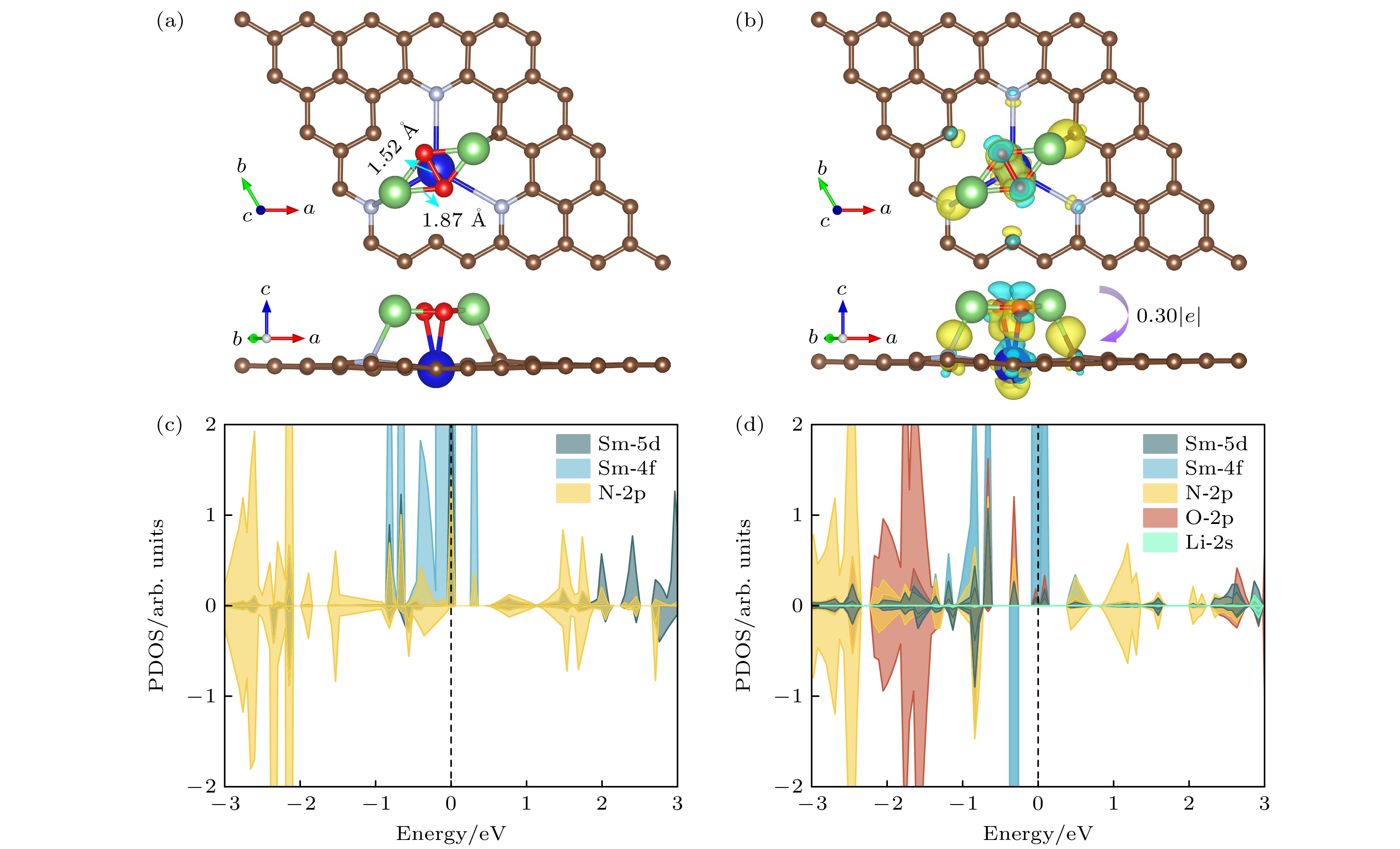 Fig. 4. (a) Top and side views of Li2O2 molecule adsorption on SmN3C3-1 (SmN3C3-1-Li2O2), green and red small balls represent Li and O atoms, respectively; (b) charge density difference of SmN3C3-1-Li2O2, arrow indicates the direction of charge transfer, yellow and blue represent charge accumulation and depletion, respectively; (c), (d) projected density of states of SmN3C3-1 and SmN3C3-1-Li2O2, the isosurface value is set to 0.004 e/Å3.