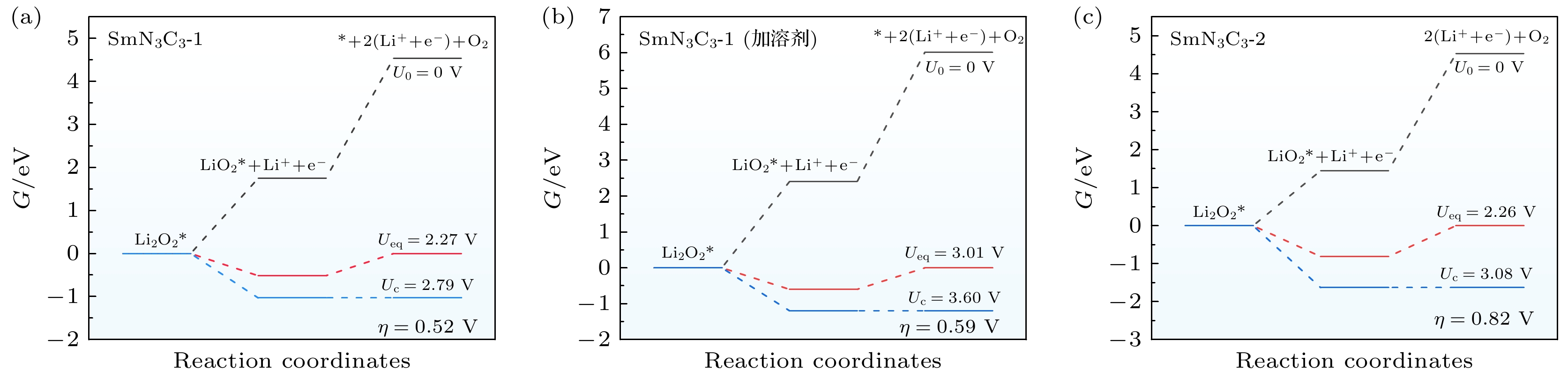图 5 (a), (b) 无溶剂下Li2O2分子和隐式溶剂TEGDM环境下Li2O2分子在SmN3C3-1上解离的吉布斯自由能; (c) Li2O2分子在SmN3C3-2上解离的吉布斯自由能