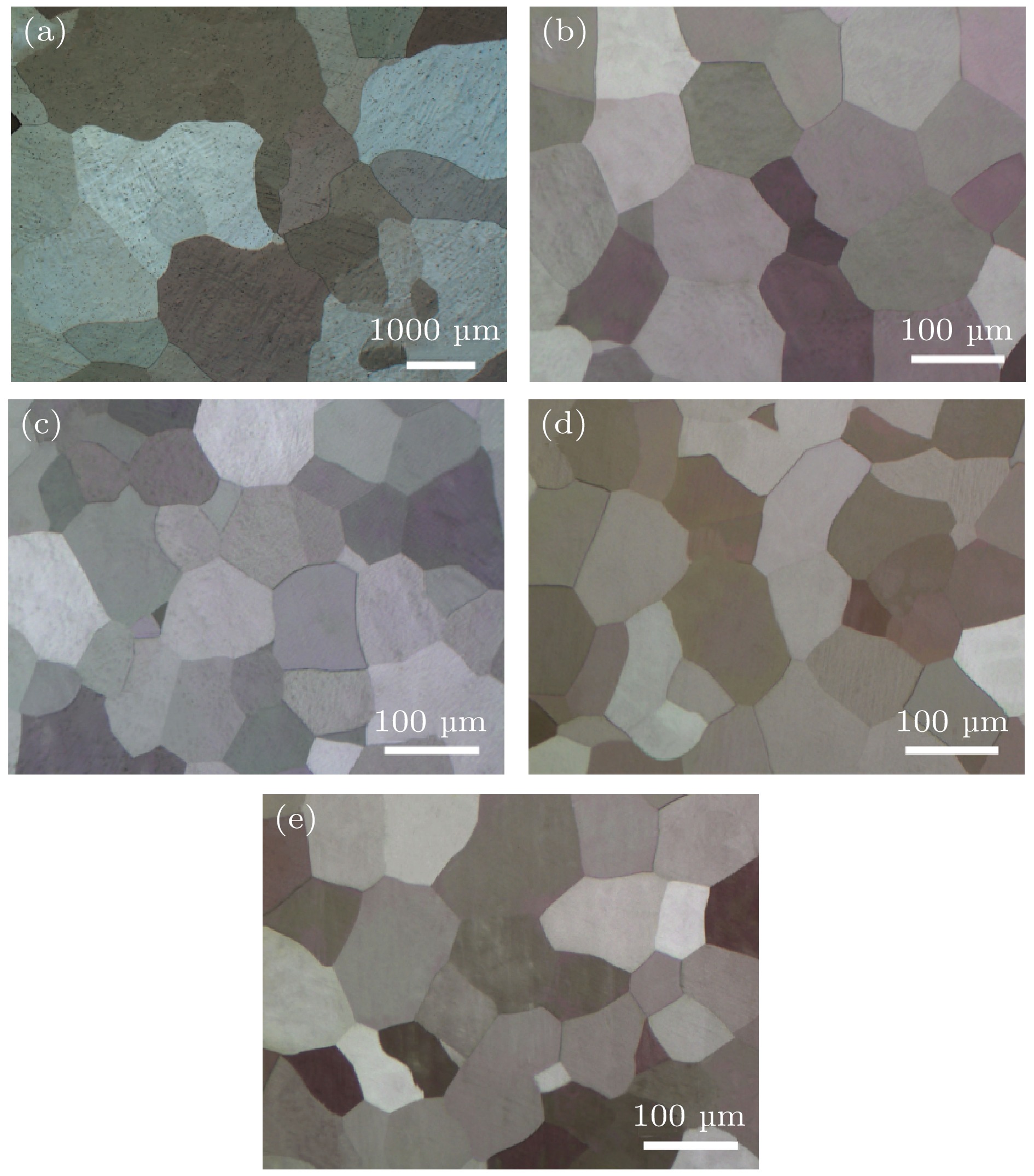 图 1 Al-2.5Mg合金OM图像 (a) 未添加Al-5Ti-1B和La; (b) 添加0.4%Al-5Ti-1B; (c) 添加0.4% Al-5Ti-1B+ 0.02%La; (d)添加0.4%Al-5Ti-1B+0.04%La; (e)添加0.4%Al-5Ti-1B+0.06%La