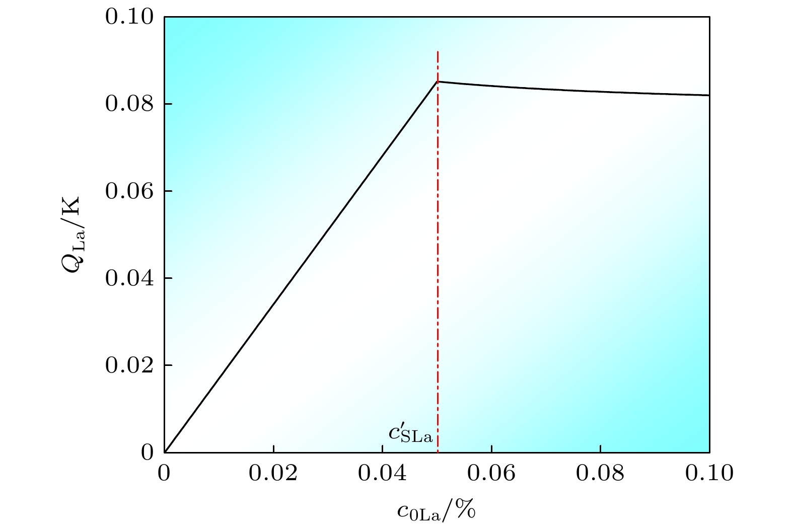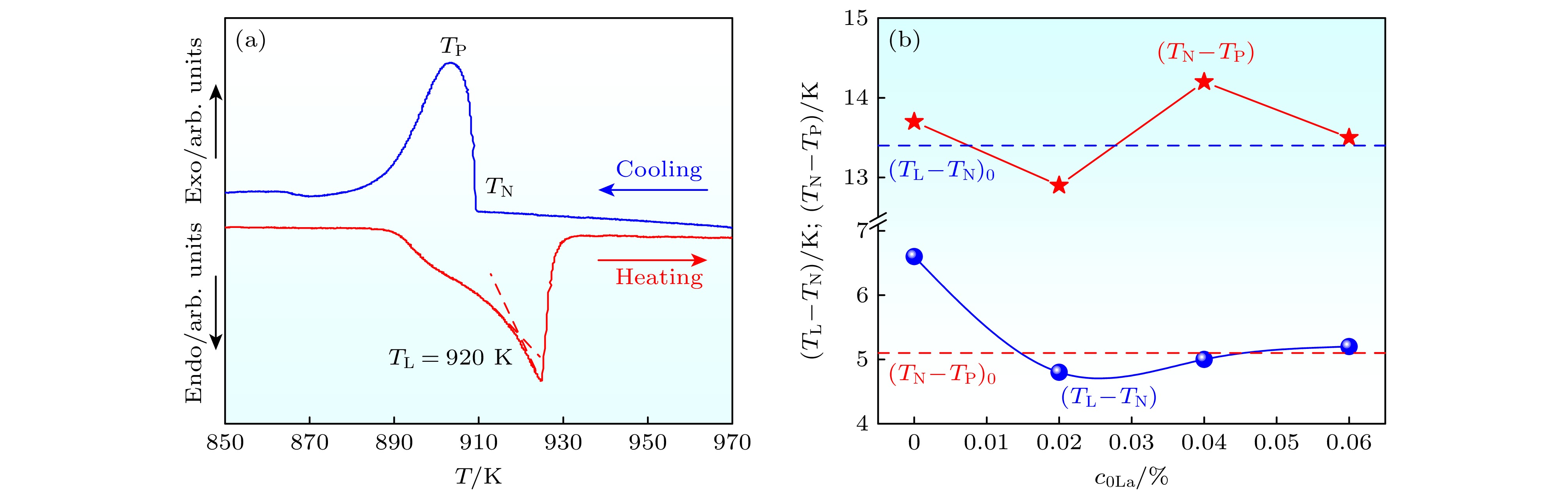 图 3 (a) Al-2.5Mg合金的DTA熔化和冷却曲线; (b) $ \left({T}_{\text{L}}- {T}_{\text{N}}\right) $和$ \left({T}_{\text{N}}-{T}_{\text{P}}\right) $随La添加量($ {c}_{\text{0La}} $)的变化