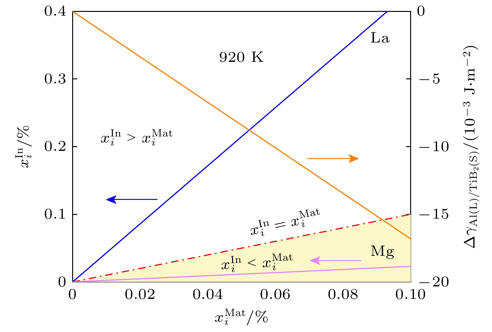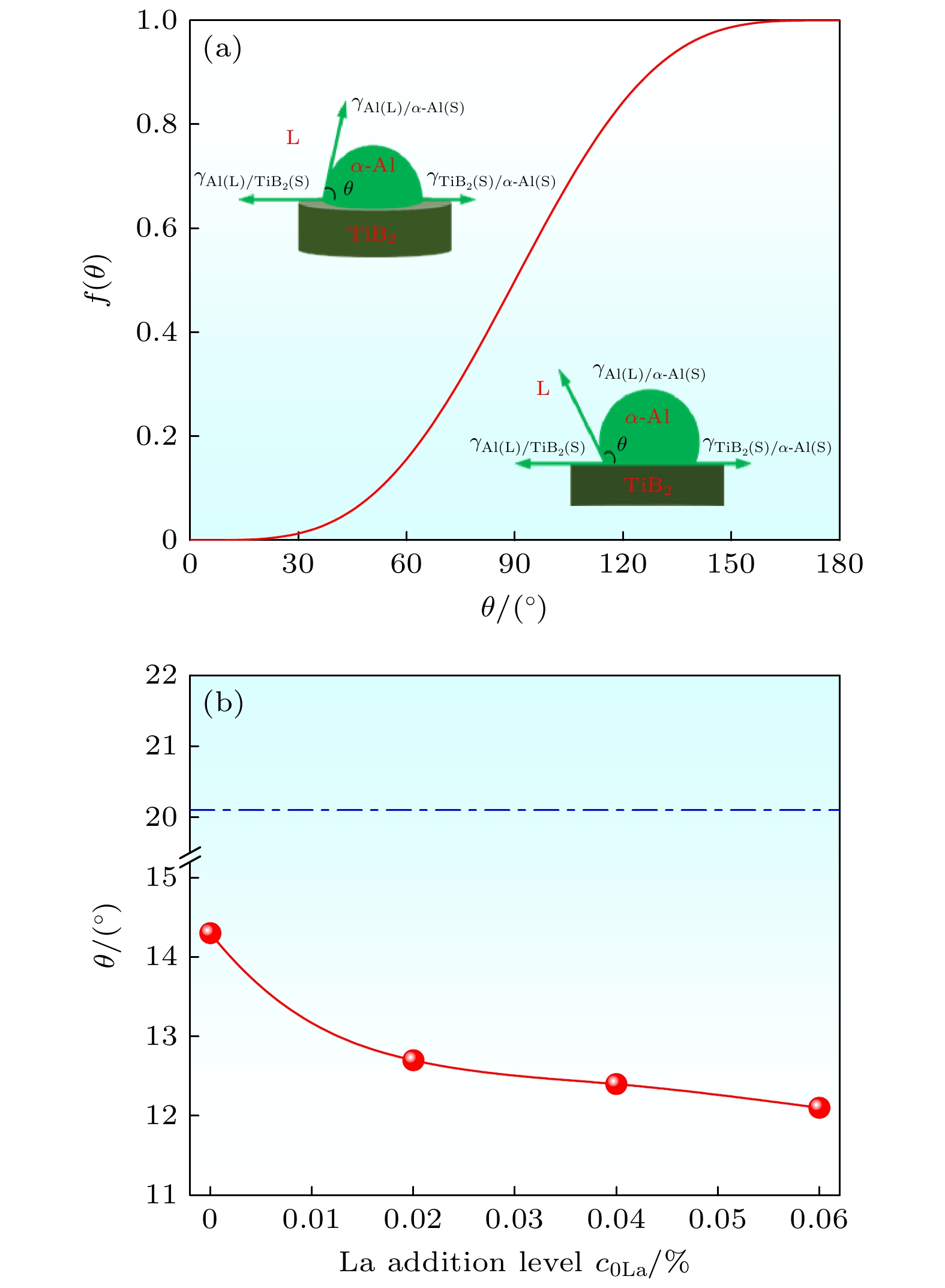 Grain refinement is an effective method to enhance the comprehensive properties of alloys. In industrial production, Al-5Ti-1B master alloys are commonly used to refine the microstructure of aluminum alloys. However, the grain refinement potency of Al-Ti-B master alloys is limited and cannot meet the requirements for high-performance aluminum alloy applications. It has been demonstrated that adding trace amount of micro-alloying element La to the aluminum alloy melt inoculated with Al-5Ti-1B master alloy can further refine the solidification microstructure. Previous research indicates that the addition of 0.06% (weight percent) La is sufficient to achieve an ideal α-Al grain refinement. Our recent experimental results demonstrate that for an Al-Mg alloy of high Mg content inoculated with Al-5Ti-1B master alloy, the optimal addition level of La is about 0.02% (weight percent). Solidification experiments are carried out for Al-Mg alloys inoculated with Al-5Ti-1B master alloy and different addition levels of micro-alloying element La. It is demonstrated that the trace addition of micro-alloying element La shows a further grain refinement effect on Al-Mg alloy and reduces the nucleation undercooling of α-Al. A model is proposed for the segregation behavior of micro-alloying element La at the interface between the Al alloy melt and TiB2. The mechanism of the enhancement in the efficiency of TiB2 particles to nucleate α-Al by micro-alloying element La is clarified. The calculation results indicate that La shows a strong segregation tendency toward the interface between the Al melt and TiB2 particles, thus reducing the interfacial energy and contact angle between TiB2 and α-Al, enhancing the efficiency of TiB2 to nucleate α-Al, and further refining α-Al grains. -