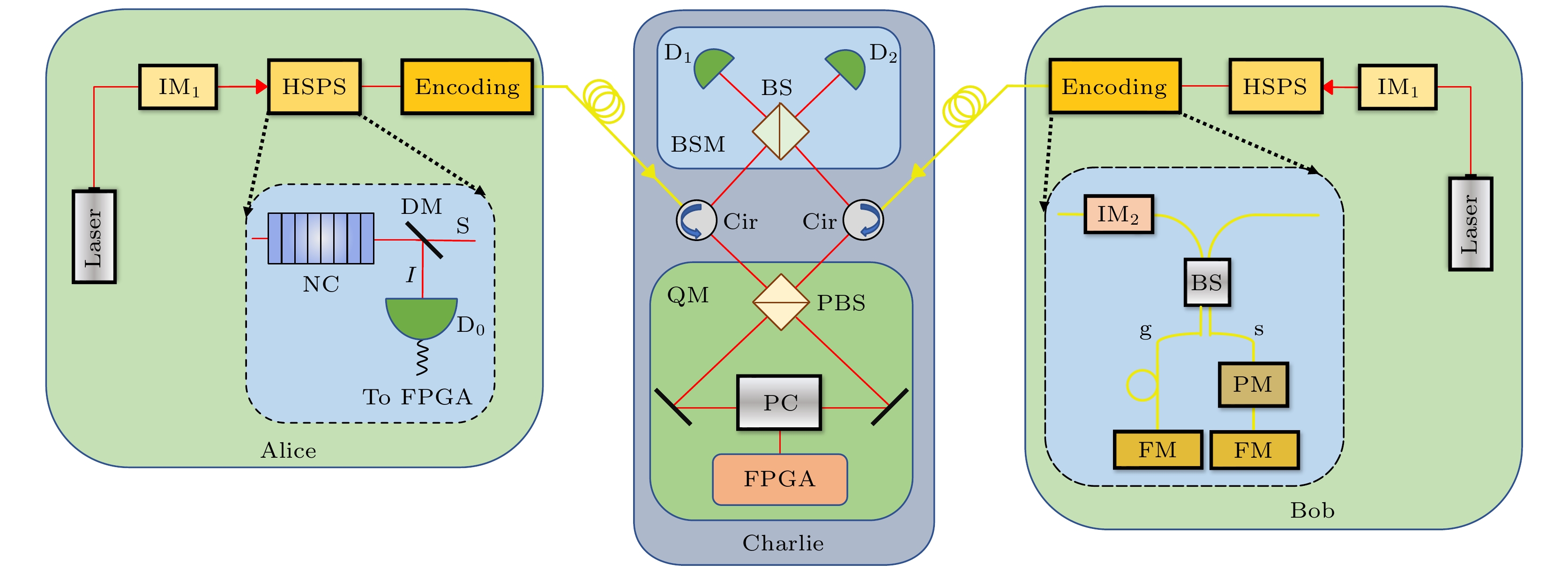 图 1 基于量子存储辅助的MDI-QKD系统装置示意图, 其中IM为强度调制器, NC为非线性晶体, DM为二色镜, PM为相位调制器, FM为法拉第反射镜, Cir为环形器, D0, D1, D2为单光子探测器, PC为泡克耳斯盒, BS为光束分离器, PBS为偏振光束分离器, BSM代表贝尔态测量装置, FPGA代表现场可编程逻辑门阵列
