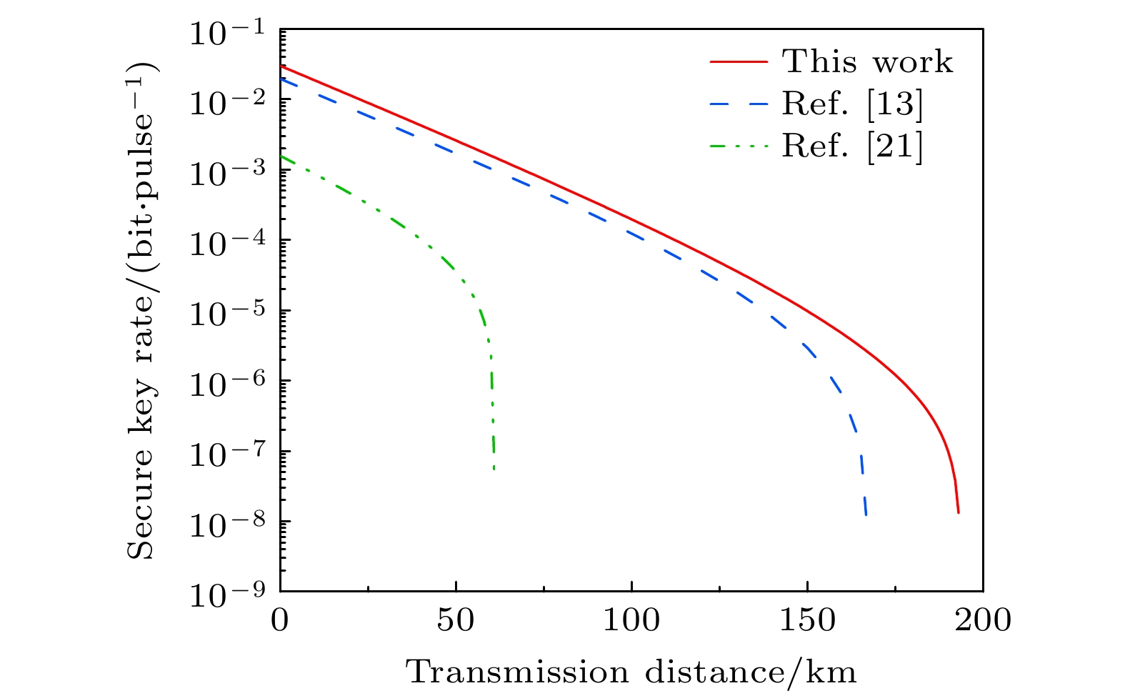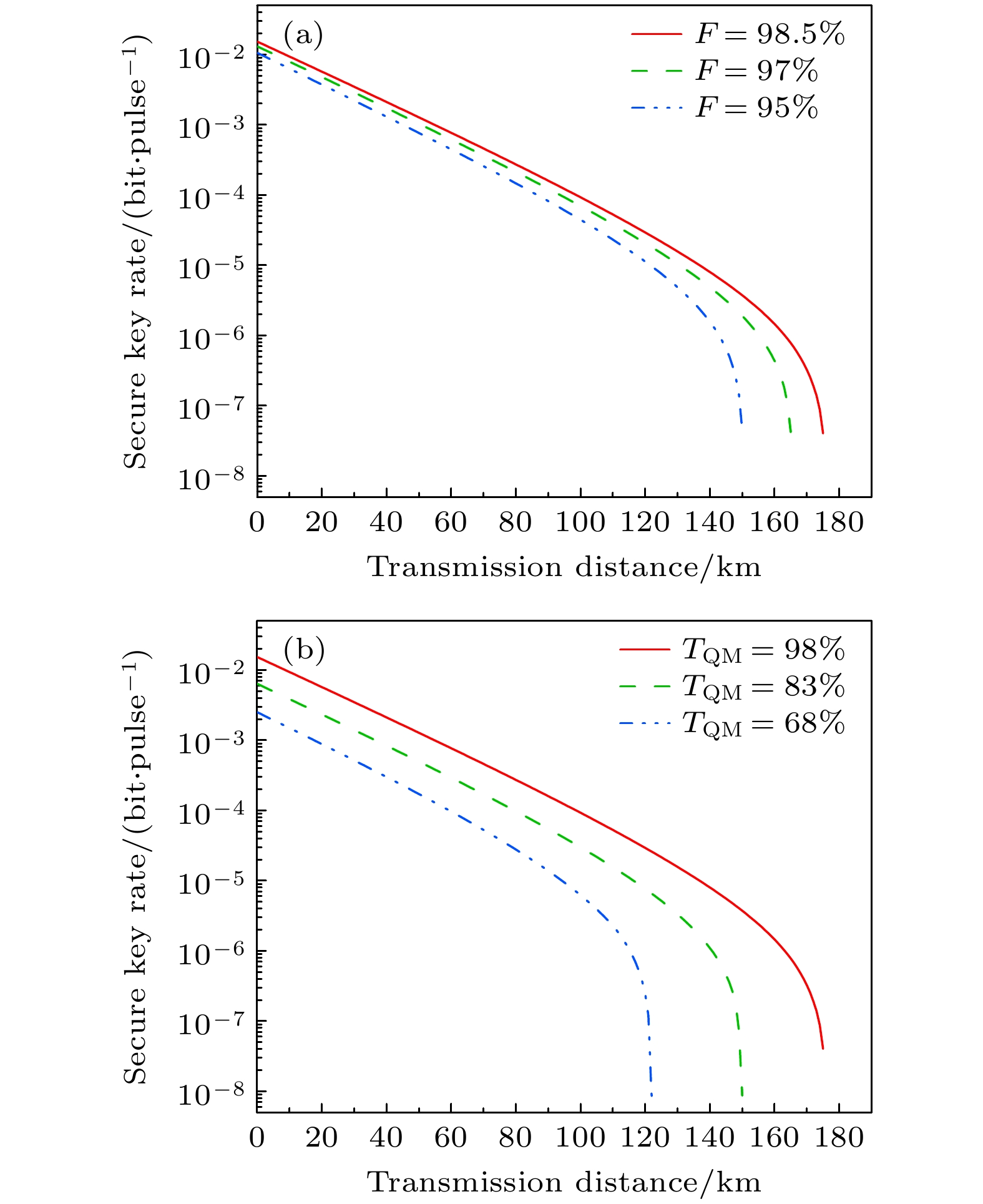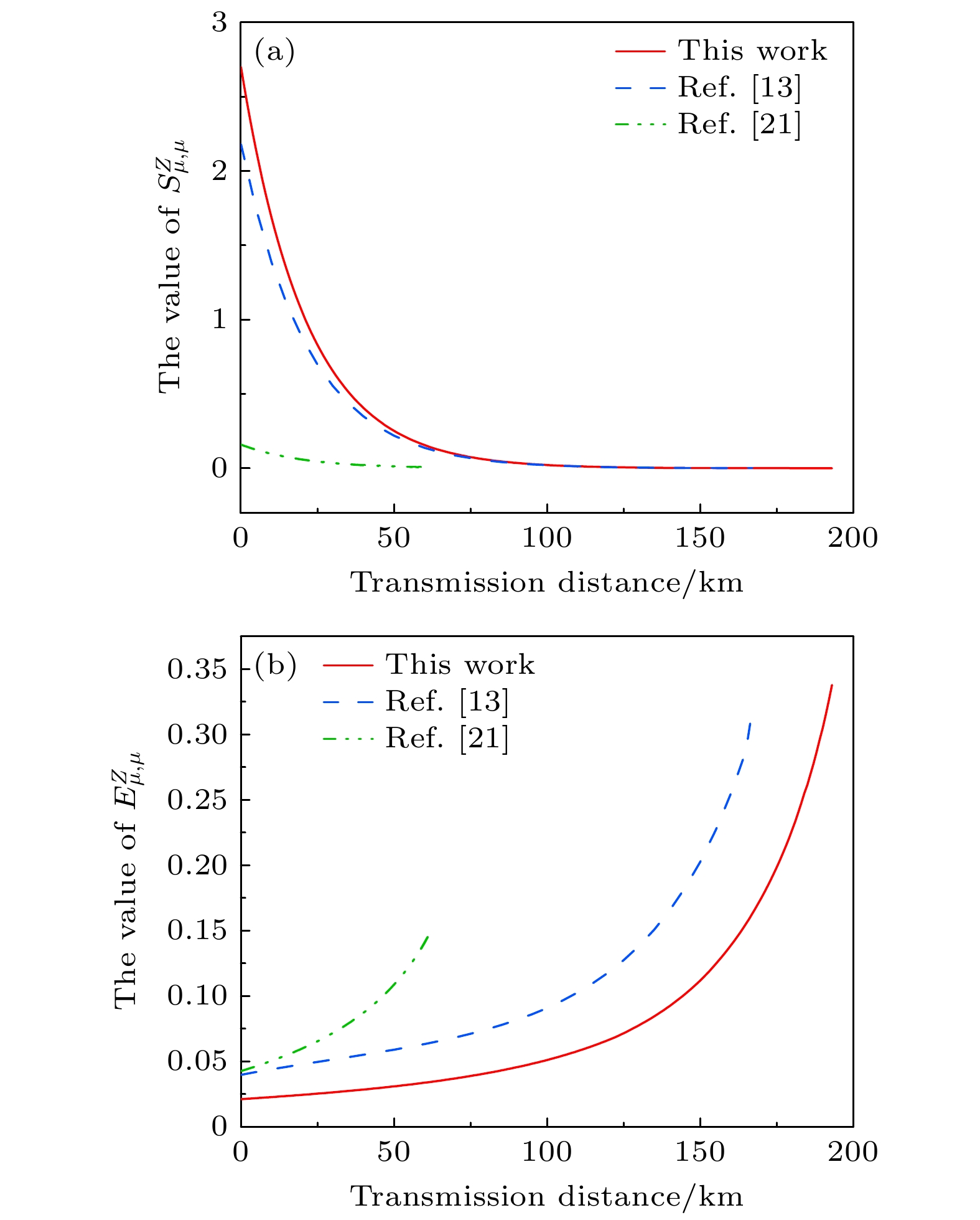 ${e_{\text{d}}}$ $Pd$ $P{d_{\text{t}}}$ ${\eta _{\text{d}}}$ ${\eta _{\text{t}}}$ $\xi $ $f$ $\alpha $/(dB·km–1) $0.015$ $ {10^{ - 7}} $ ${10^{ - 7}}$ $0.6$ $0.75$ ${10^{ - 10}}$ $1.16$ $0.2$ -