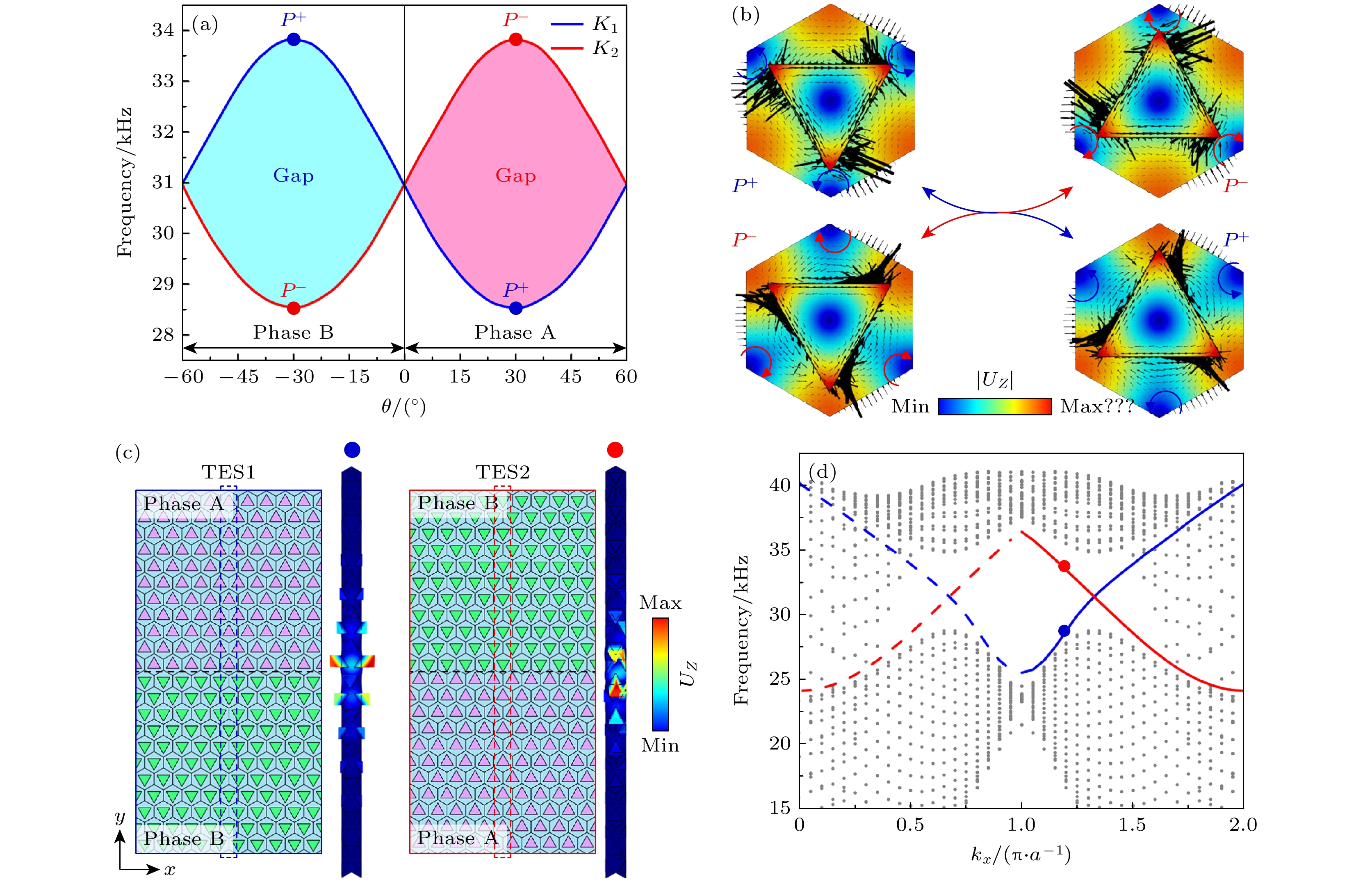 Fig. 2. (a) Topological phase transition at K-valley induced by rotation angle θ, showing variations of valley-specific frequencies at K1 and K2 with rotation angle; (b) energy flux distributions of the first and second bulk bands at K-valley for unit cells with θ=30° and θ=–30°; (c) two distinct supercell configurations composed of Phase A and Phase B, with corresponding displacement fields marked by blue and red dots. Here, PC with θ=30° constitute phase A, while those with θ=–30° form phase B; (d) projected band dispersion of topological edge states (TES) between two different topological phases. The blue curve denotes TES1 at the A-B interface, and the red curve represents TES2 at the B-A interface. Solid and dashed lines indicate TES projected from K and K' valleys, respectively.