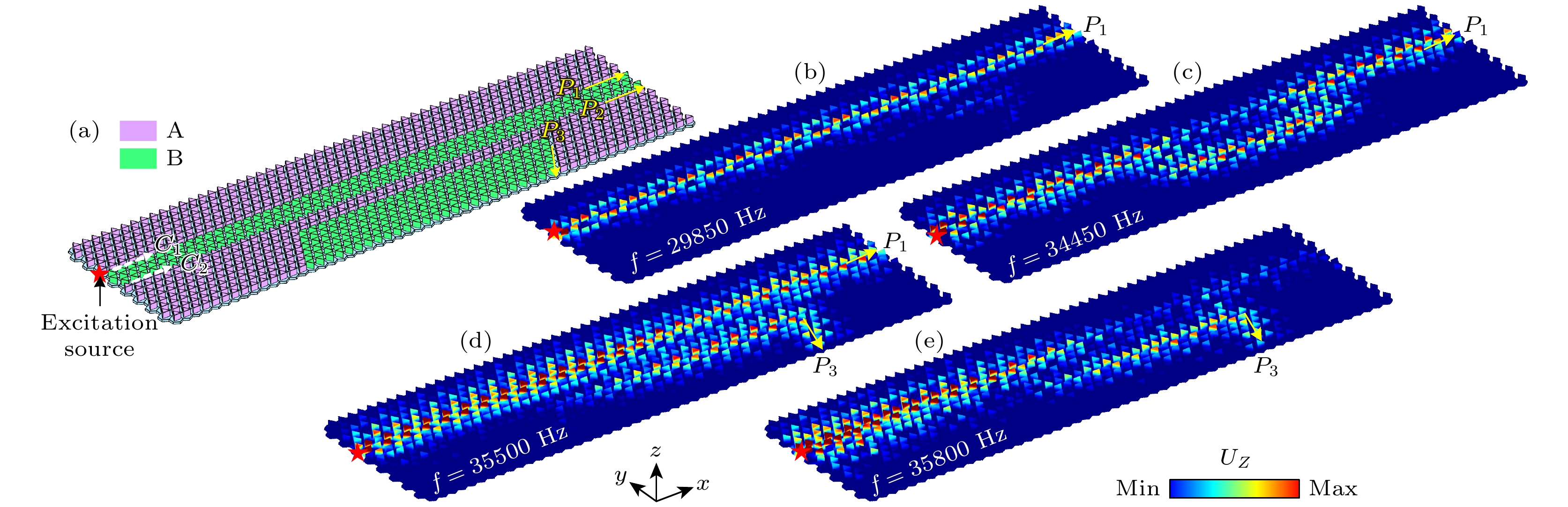 Fig. 7. (a) Structural model of the wavelength demultiplexer; (b)—(e) displacement field distributions showing elastic wave output through different ports at excitation frequencies f=29850, 34450, 35500 and 35800 Hz, respectively.