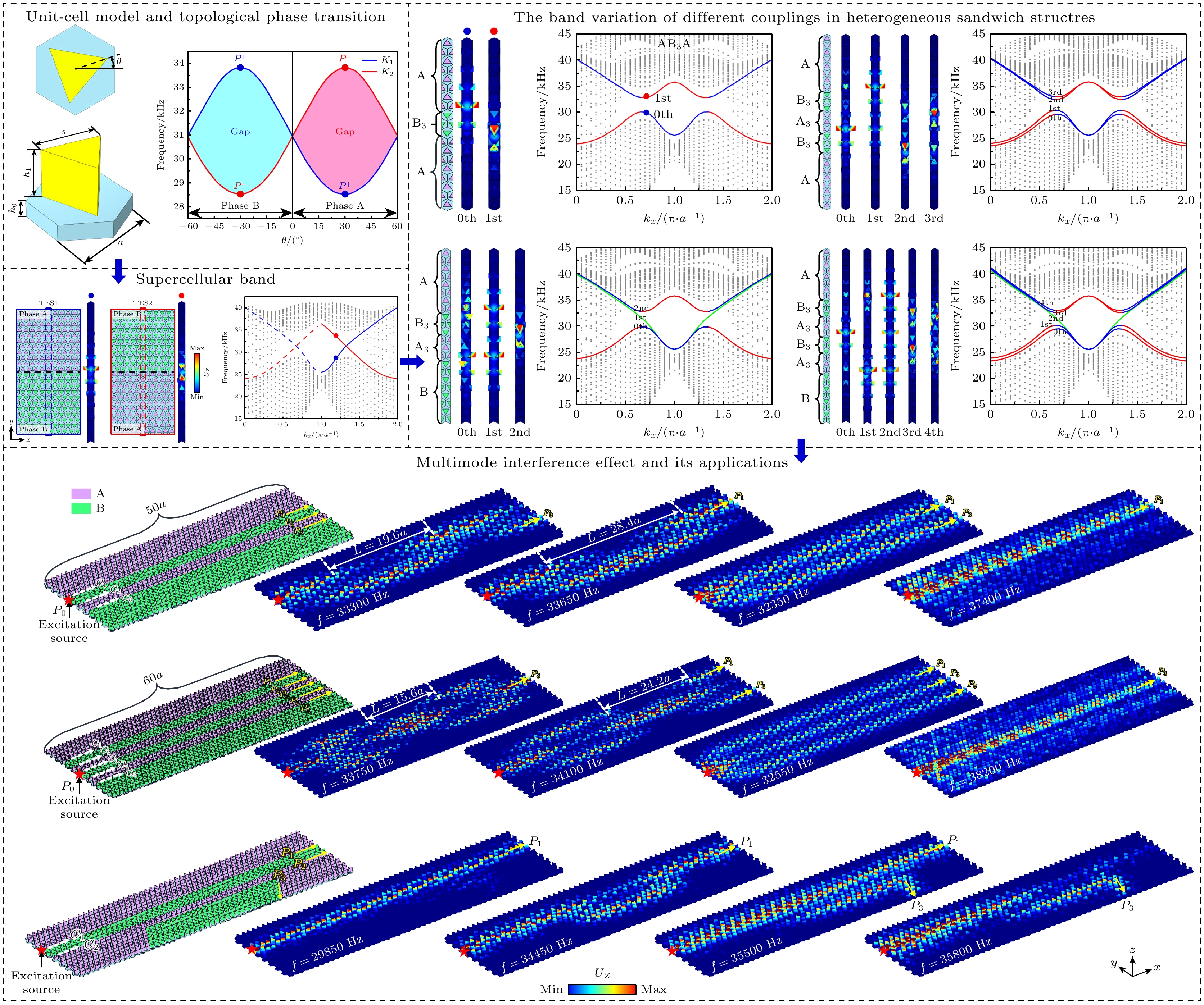 近年来, 具有谷赝自旋自由度的拓扑谷态物理备受关注. 声子晶体中的拓扑谷边界态因其背向散射免疫传输特性, 在高效声波和弹性波波导与传感方面具有重要的应用前景. 本文基于弹性波量子谷霍尔效应类比构建了一种三角晶格谷拓扑声子晶体板, 系统研究了面外偏振弹性波谷边缘态在多层拓扑异质超胞结构中耦合行为, 揭示了有限尺寸的多层异质结构对弹性波耦合谷边缘态的形成机理与调控规律. 进一步通过拓扑传输计算, 揭示了弹性波耦合谷边缘态的多模干涉效应并验证其传输鲁棒性. 最后, 作为一种应用示例, 基于谷边缘态多模干涉效应设计了一种弹性波拓扑波长解复用器. 利用不同耦合频率下边缘态的耦合波长差异, 实现入射弹性波在抗缺陷通道中的定向分离. 本文研究为弹性波拓扑传输调控提供了新范式, 有望推动新型多功能弹性波耦合与传感器件的实用化设计.In recent years, topological valley physics with the degrees of freedom of valley pseudospin has attracted great attention. The topological valley boundary states in phononic crystals have important application prospects in efficient guidance and sensing for acoustic and elastic wave due to their unique transmission characteristics with backscattering immunity. However, the coupling effect of the valley edge states in multi-layer topological heterostructure is still a challenge in the elastic system due to the complicated multi-mode polarization of elastic waves. In this work, a valley topological phononic crystal plate with a multi-layer heterostructure is constructed to explore the multi-mode interference characteristics of the valley edge states based on the analogy of elastic wave quantum valley Hall effect. The coupling behavior of valley edge states for the out-of-plane polarized elastic wave in multi-layer topological heterostructure is systematically studied. By adjusting the layer numbers of the topological heterostructures, the formation mechanism and regulation law of coupled valley edge states for elastic wave in finite size multi-layer heterogeneous structures are revealed. Furthermore, through topological transmission calculations, the multi-mode interference effect of coupled valley edge states for elastic wave is achieved and its transmission robustness is well verified. Finally, as an application example, an elastic topological wavelength demultiplexing device is designed based on the multi-mode interference effect of valley edge state. By utilizing the difference in coupling wavelengths of elastic valley edge states at different coupling frequencies, directional separation of incident elastic waves in defect resistant channels is achieved, which can be used as a prototype model for the novel application of elastic wavelength demultiplex device. This work provides a new paradigm for the manipulation of elastic wave topological transport, which is also expected to promote the practical design of new multifunctional elastic wave coupling and sensing devices.
