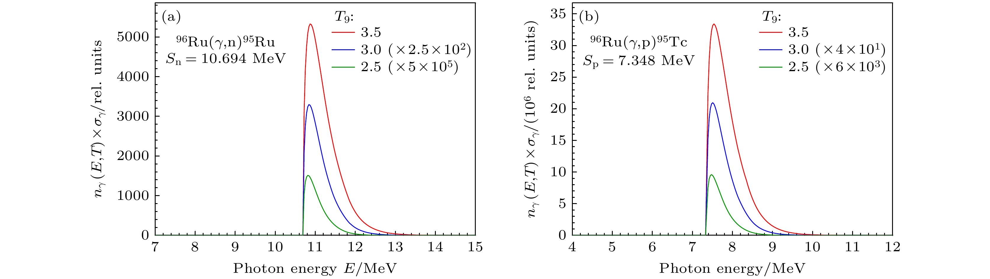 Fig. 7.  Gamow window on the ground state of target nucleus (a) $ ^{96} {\rm{Ru}}$(γ, n), (b) $ ^{96} {\rm{Ru}}$ (γ, p)