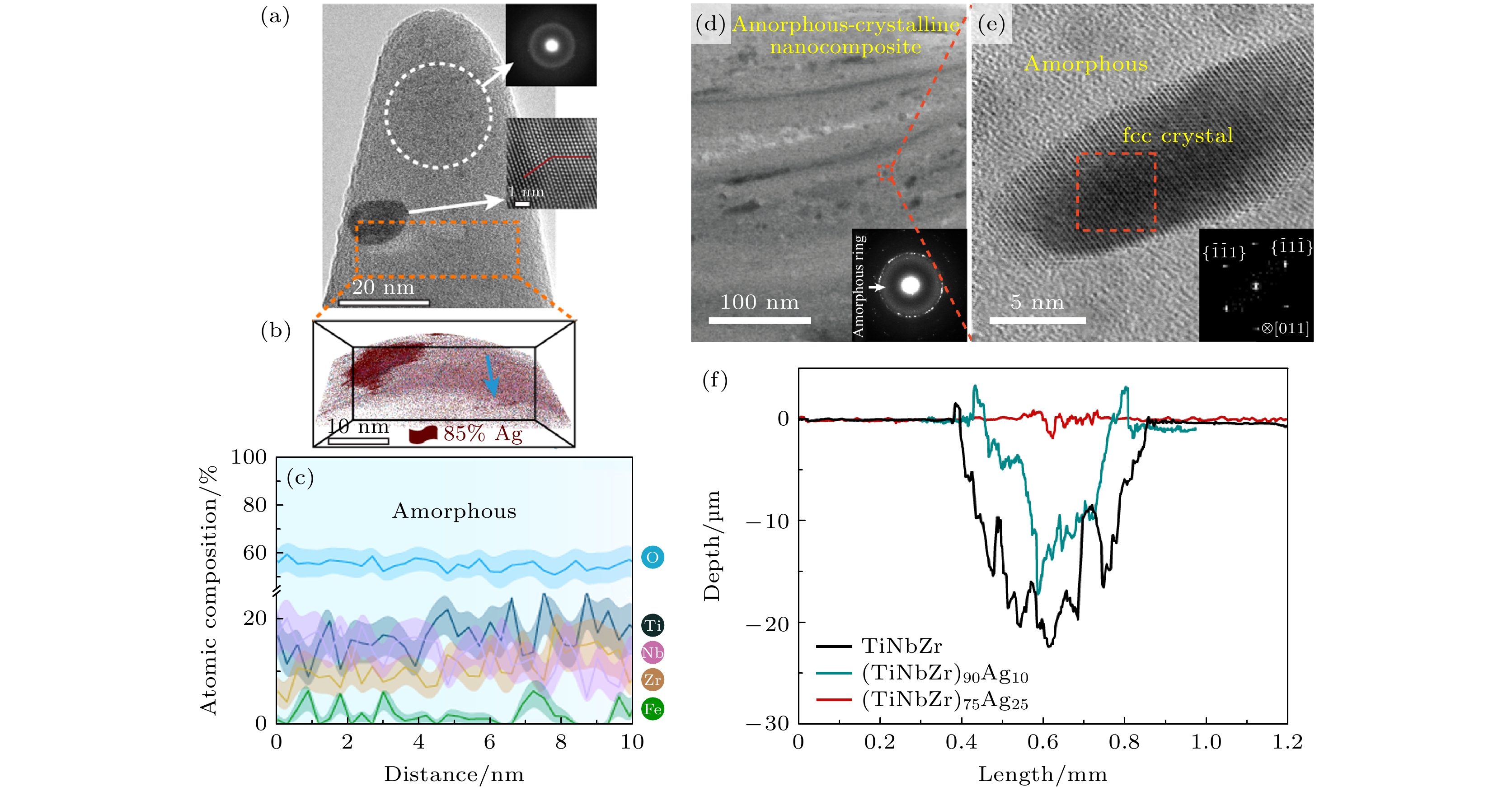 图 2 (NbTiZr)75Ag25合金薄膜在摩擦过程中原位构建的非晶-纳米晶双相结构 (a) 顶部的插图是白色虚线圆圈区域的选区电子衍射(SAED)图案, 显示了非晶相的晕环图案, 中间的插图是图(a)中纳米晶体的放大图[57]; (b) 图(a)中橘色虚线方框区域的APT数据集的3D重建[57]; (c) 沿图(b)中所示的箭头测量的1D成分分布[57]; (d) 环形明场扫描透射电子显微镜(ABF-STEM)图像, 显示纳米复合材料的结构[57]; (e) 纳米复合材料的原子分辨扫描透射电子显微镜(ABF-STEM)图像, 呈现嵌入无定形基质中的FCC结构化纳米晶体[57]; (f) 样品磨损痕迹的2D横截面轮廓[57]