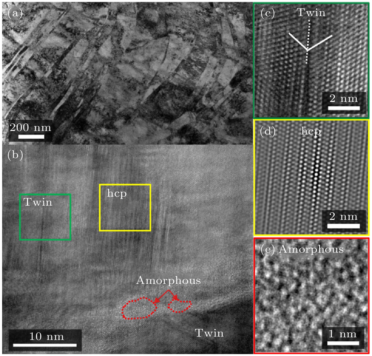 图 3 型锻Cr-Mn-Fe-Co-Ni HEA在准静态压缩下的变形微观组织 (a)透射电镜明场图像显示出大量的平面变形特征[52]; (b)严重变形区域的高分辨率透射电镜显微照片, 具有三个不同的变形孪生区域、HCP相和一个非晶区域, 相应的晶格图像分别以(c)—(e)给出, 图(d)中的HCP区域是傅里叶变换滤波以最大化相差[52]