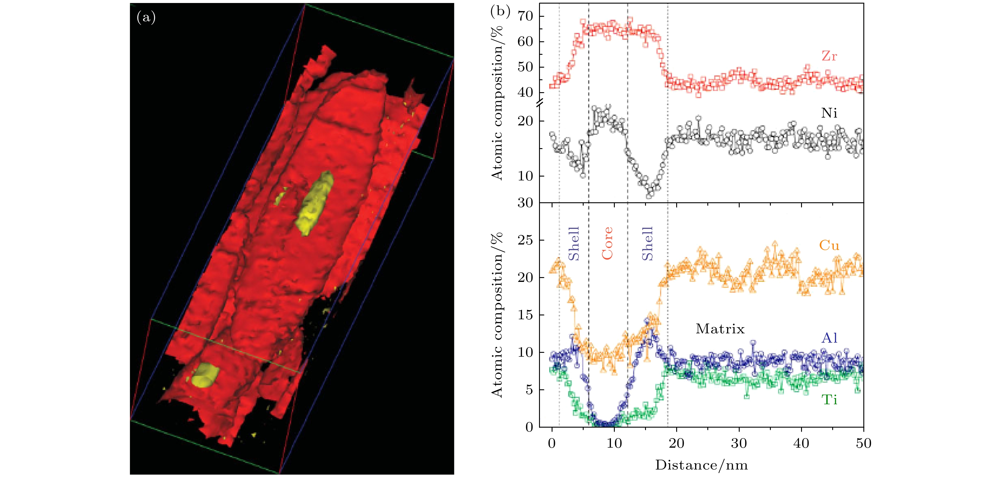 图 5 Zr-Cu-Ni-Al-Ti非晶-纳米晶的APT图像, 呈现出核-壳结构 (a) 由APT分析确定的等浓度面, 显示出富Zr析出相的透镜状形貌及其内部富Al核心区. 红色等浓度面(52% Zr, 原子百分比)和黄色等浓度面(5.4% Al, 原子百分比)分别对应析出相/基体界面和析出相/核心界面[71]; (b) 穿过透镜状析出相中心的线性成分分布曲线. Al原子被排斥出核心区, 而Ti原子则在核心区和包壳区均被排斥[71]