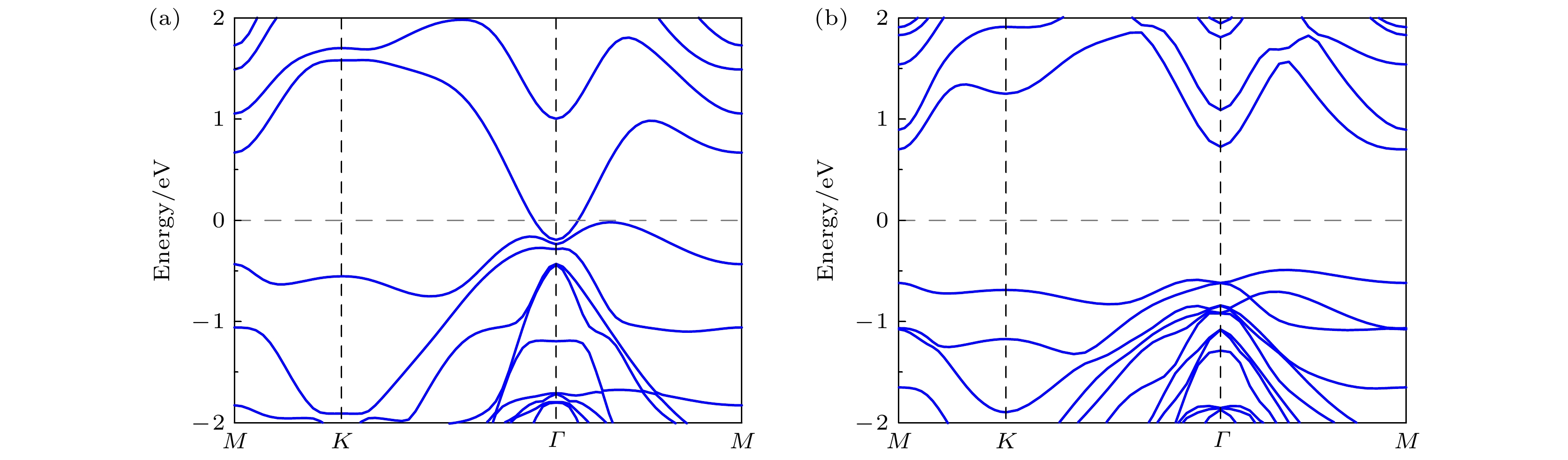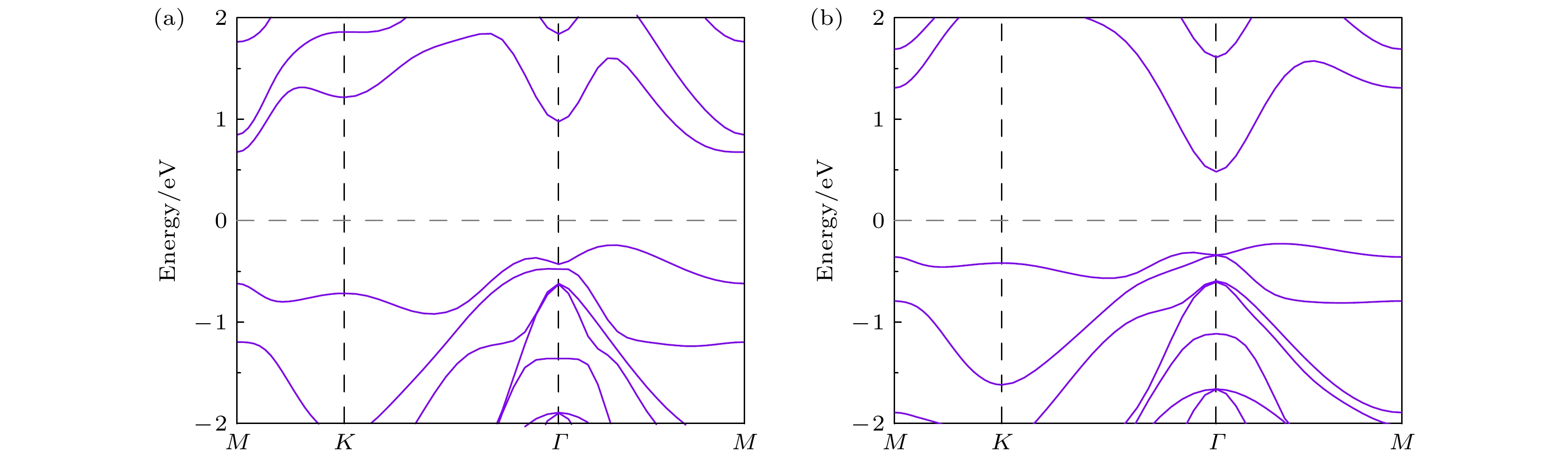 Fig. 7. The band structures of Al2Te3/In2Se3 heterostructure with HSE06 functional for the (a) ${P}_{\downarrow \downarrow } $ and (b) ${P}_{\uparrow \uparrow } $ state.