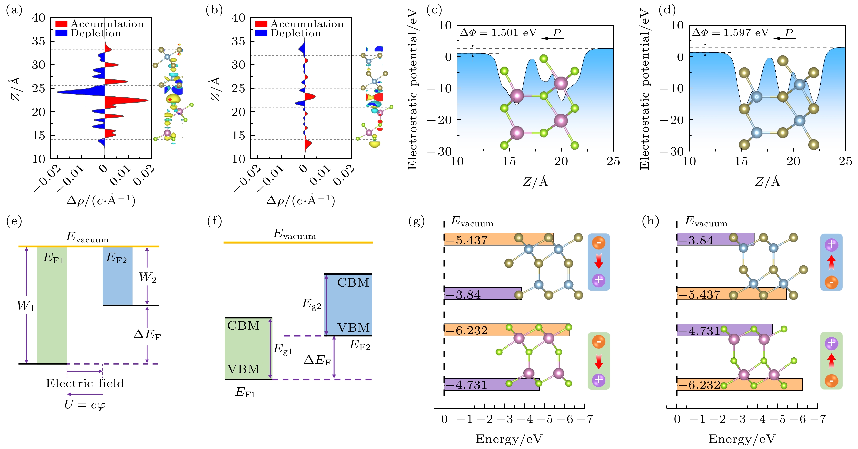 Fig. 3. The differential charge density diagrams along the z direction of Al2Te3/In2Se3 heterostructures with (a) ${P}_{\downarrow \downarrow } $ and (b) ${P}_{\uparrow \uparrow } $ states; plane-averaged electrostatic potential of (c) In2Se3 and (d) Al2Te3; (e) schematic diagram of the formation of contact potential and (f) band alignment between two different materials for two-dimensional van der Waals heterostructure; the work functions of Al2Te3 and In2Se3 in the (g) ${P}_{\downarrow \downarrow } $ state and the (h) ${P}_{\uparrow \uparrow } $ state for Al2Te3/In2Se3 heterostructures.