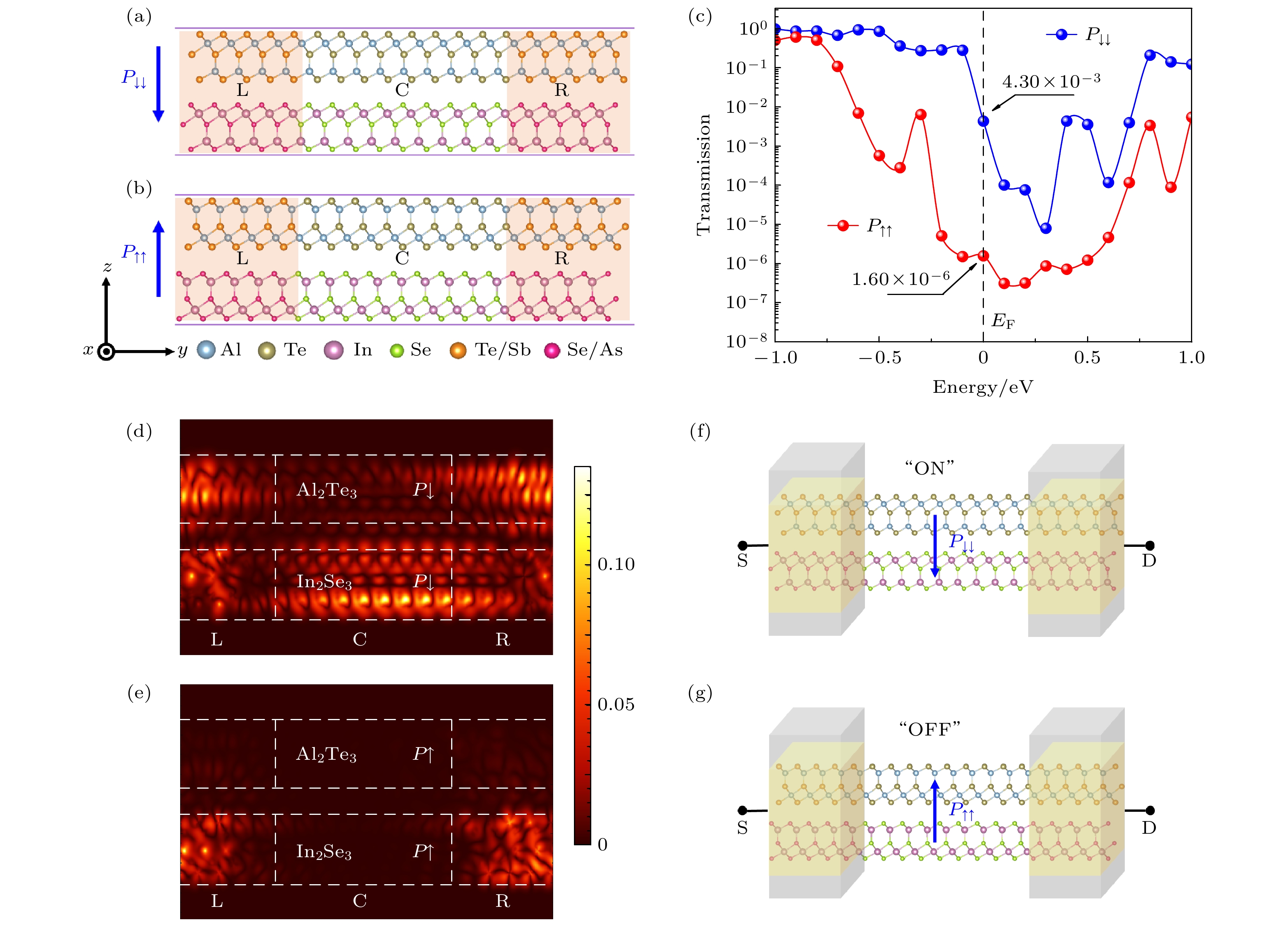 Fig. 5. The side views of atomic structures of Al2Te3/In2Se3-based FTJs with N=7 for the (a) ${P}_{\downarrow \downarrow } $ and (b) ${P}_{\uparrow \uparrow } $ states. (c) The transmission function of the FTJs in ${P}_{\downarrow \downarrow } $ and ${P}_{\uparrow \uparrow } $ states as a function of energy. The scattering states at Fermi level for Al2Te3/In2Se3-based FTJs when N=7 for the (d) ${P}_{\downarrow \downarrow } $ and (e) ${P}_{\uparrow \uparrow } $ states. The (f) “ON” state and (g) “OFF” state of the device prototype for FTJs applications.