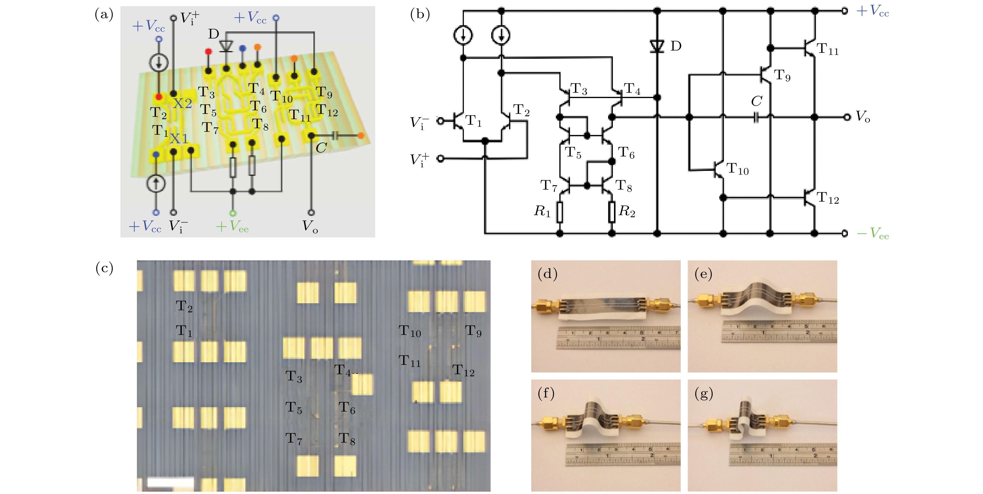 Fig. 11. (a) Experimental setup of the operational amplifier[95]; (b) corresponding equivalent circuit diagram of the operational amplifier[95]; (c) optical image of the operational amplifier[119]; (d) unbent CPW TL with an original length of 50 mm[119]; (e) bent CPW TL with a port-to-port distance of 40 mm[119]; (f) bent CPW TL with a port-to-port distance of 30 mm[119]; (g) bent CPW TL with a port-to-port distance of 20 mm[119].