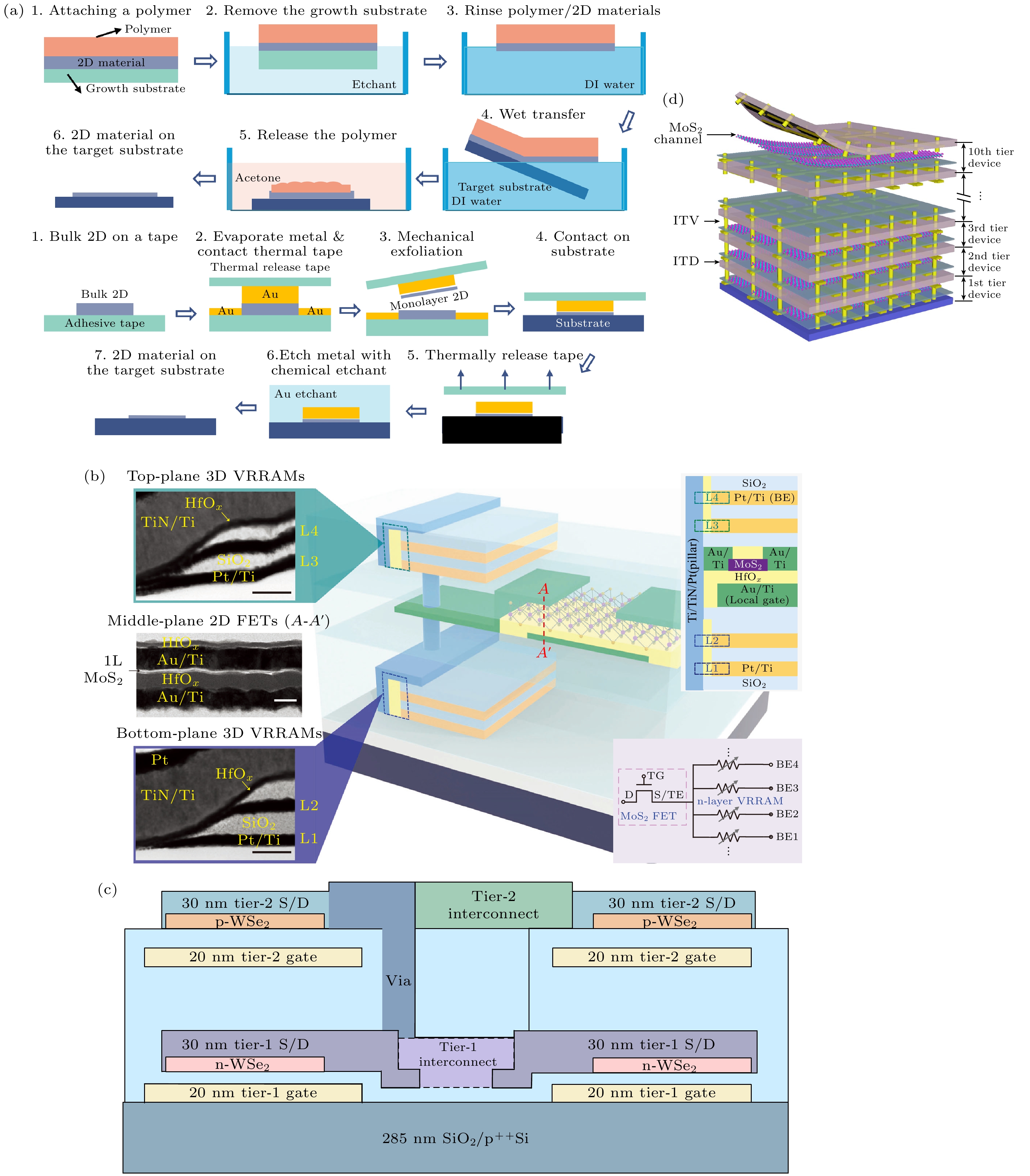 Fig. 12. (a) Polymer-assisted transfer[129]; (b) monolithic 3D integration of MoS2 transistors and VRRAMs into a 1T-4R structure[132]; (c) schematic of a monolithic 3D-integrated CMOS NAND circuit[133]; (d) schematic of a 10-tier monolithic 3D system integrated by van der Waals lamination[136].