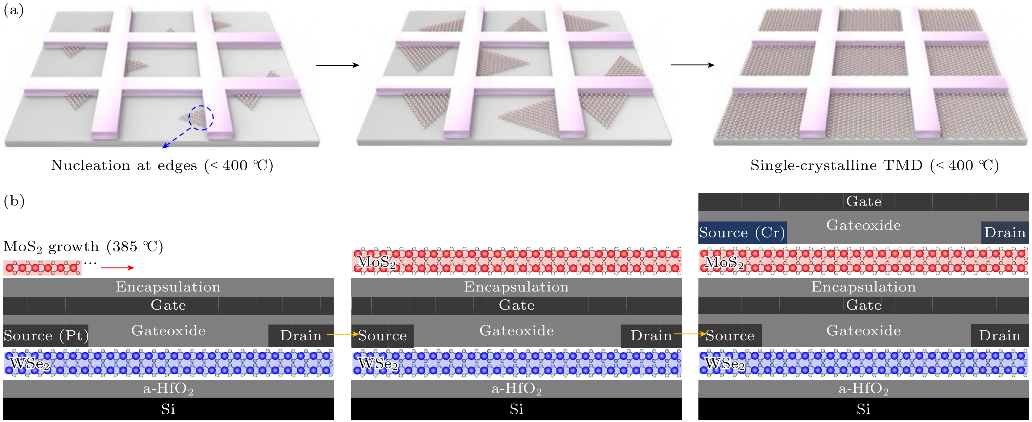 Fig. 13. (a) Schematic showing low-temperature growth of single-crystalline TMD array, highlighting the tendency of nuclei to form at edges or corners of the patterned structure[137]; (b) schematic of seamless monolithic 3D integration[137].