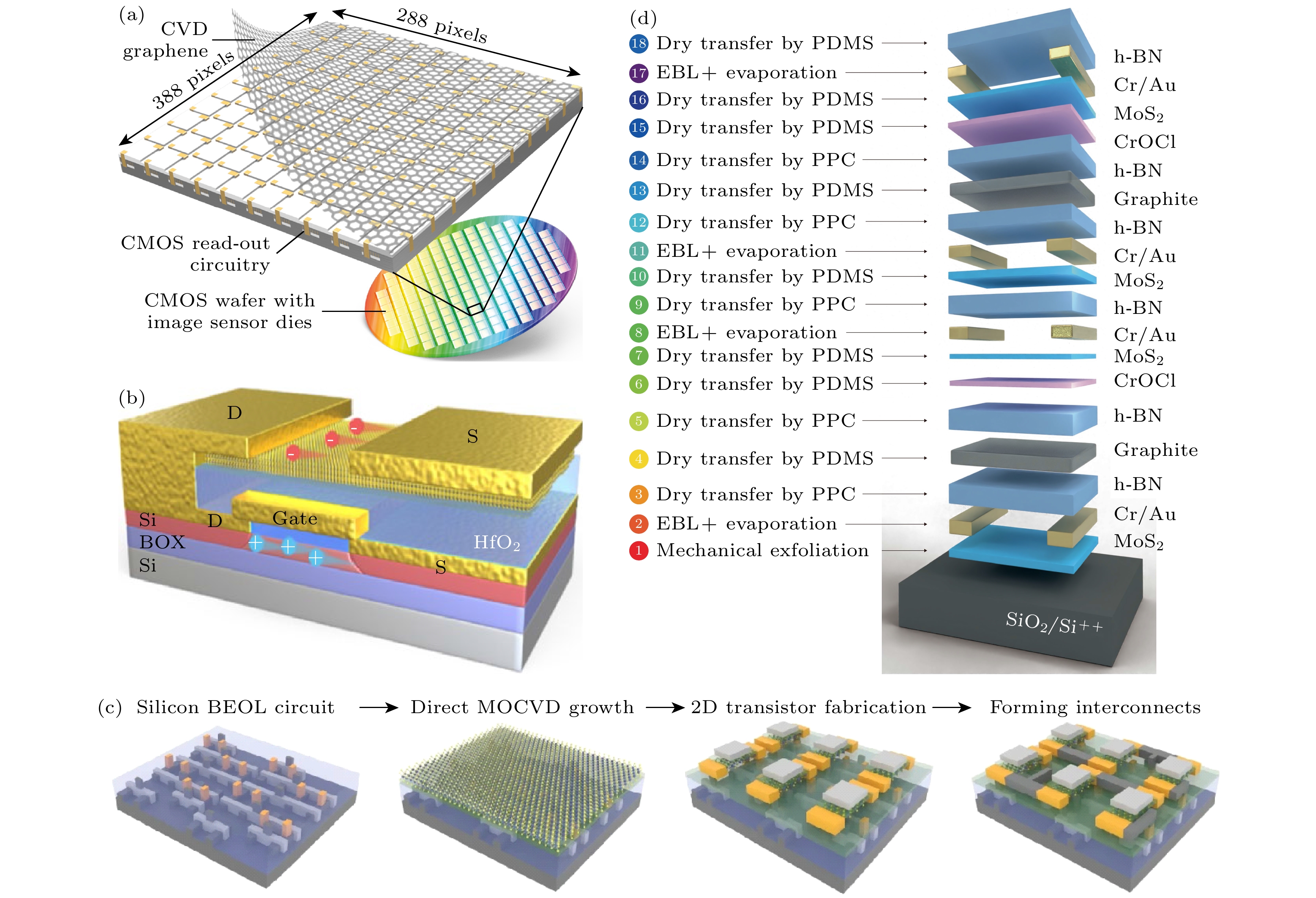 图 14 (a) 用于光电器件的二维材料与硅基CMOS电路的3D集成[139]; (b) SOI-MoS2异质3D堆叠CFET示意图[140]; (c) 二维材料-硅基电路异质3D集成流程图[140]; (d) 由14层vdW异质结构垂直堆叠搭建的3D与非逻辑门[145]