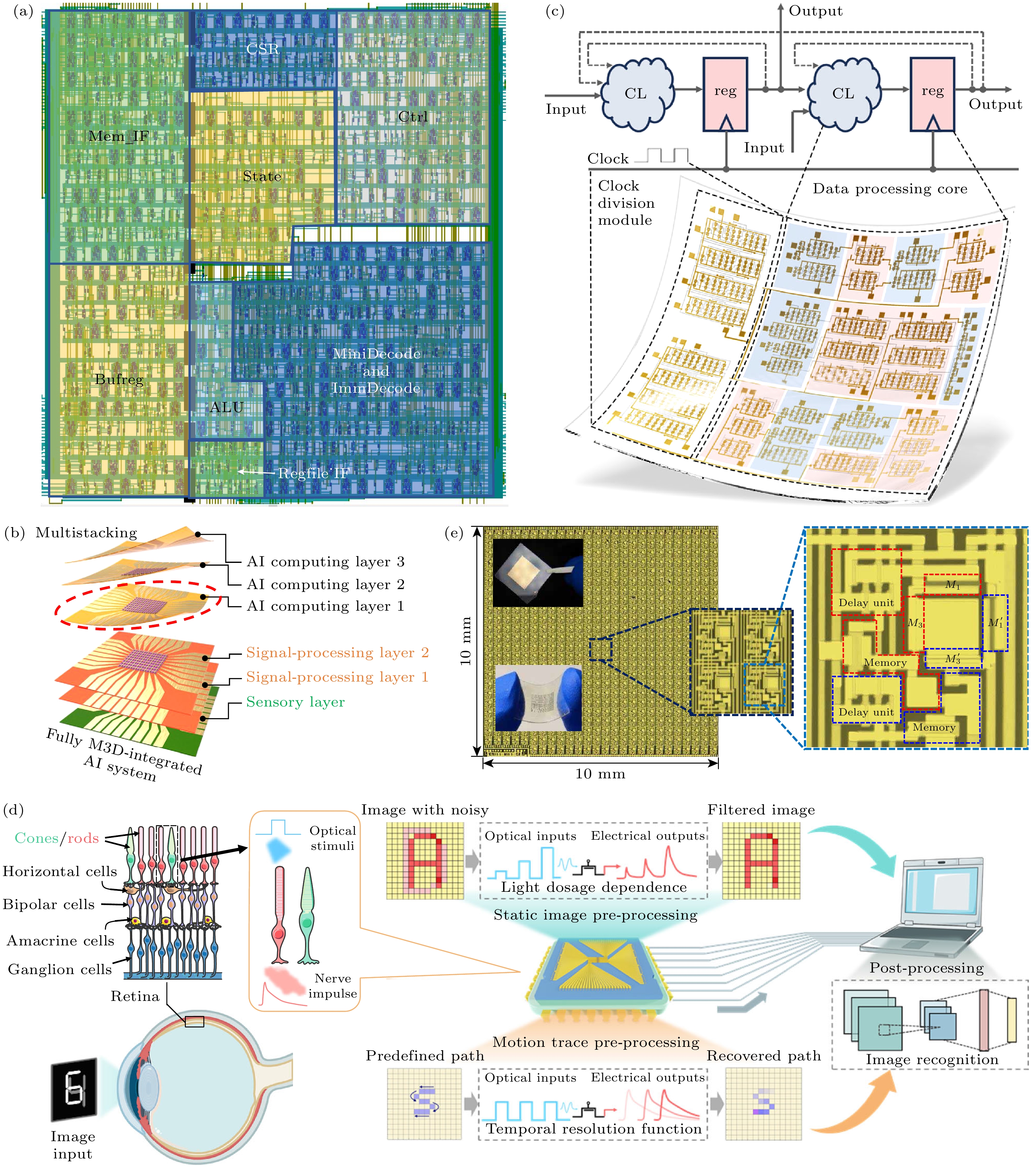 图 15 二维材料的集成应用 (a) 基于二维材料的逻辑芯片[151]; (b) 基于二维材料的边缘AI芯片[157]; (c) 基于二维材料的柔性电子[161]; (d) 基于二维材料的感算一体[169]; (e) 基于二维材料的光电芯片[171]
