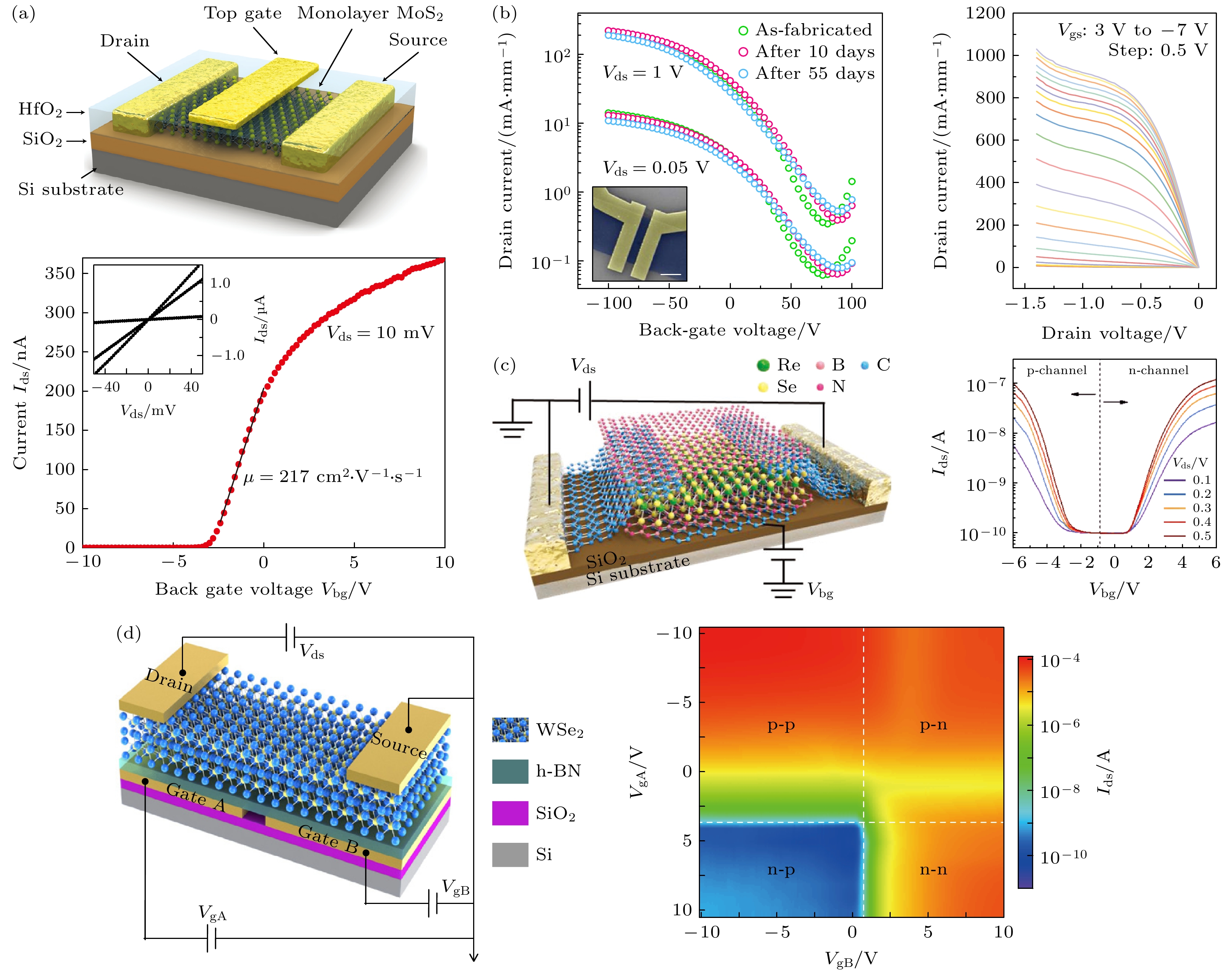 Fig. 3. Schematic diagram and electrical characteristics of logic devices: (a) MoS2 n-type transistor[52]; (b) WSe2 p-type transistor[56]; (c) ReSe2 bipolar transistor[59]; (d) WSe2 Homojunction transistor[60].