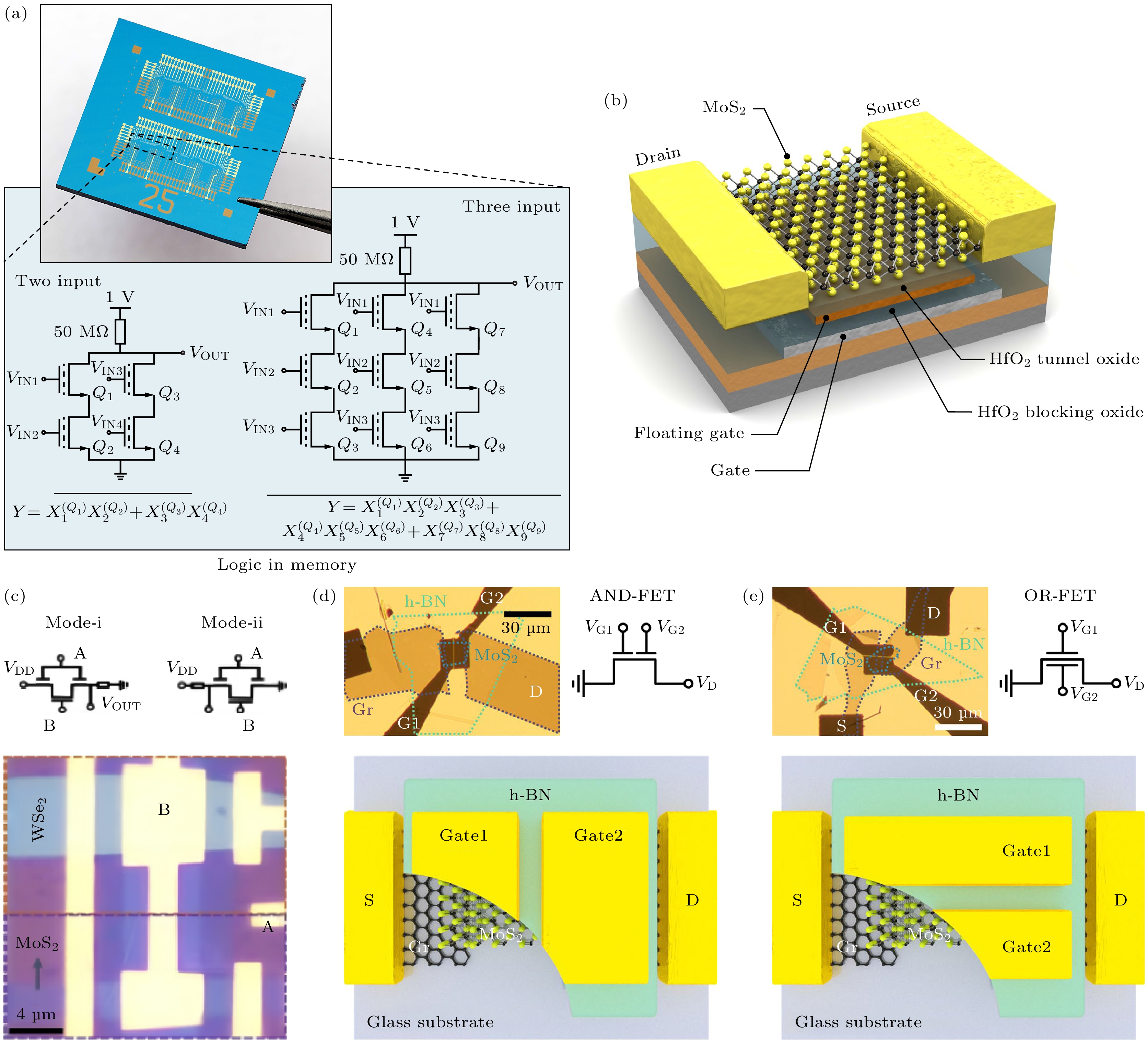 Fig. 8. (a) Photograph of a fabricated 12 mm×12 mm die with logic-in-memory cell arrays [114]; (b) 3D view of a floating gate memory device based on monolayer MoS2 grown by MOCVD[115]; (c) NAND FET[115]; (d) OR-FET[115]; (e) OR-FET [115].