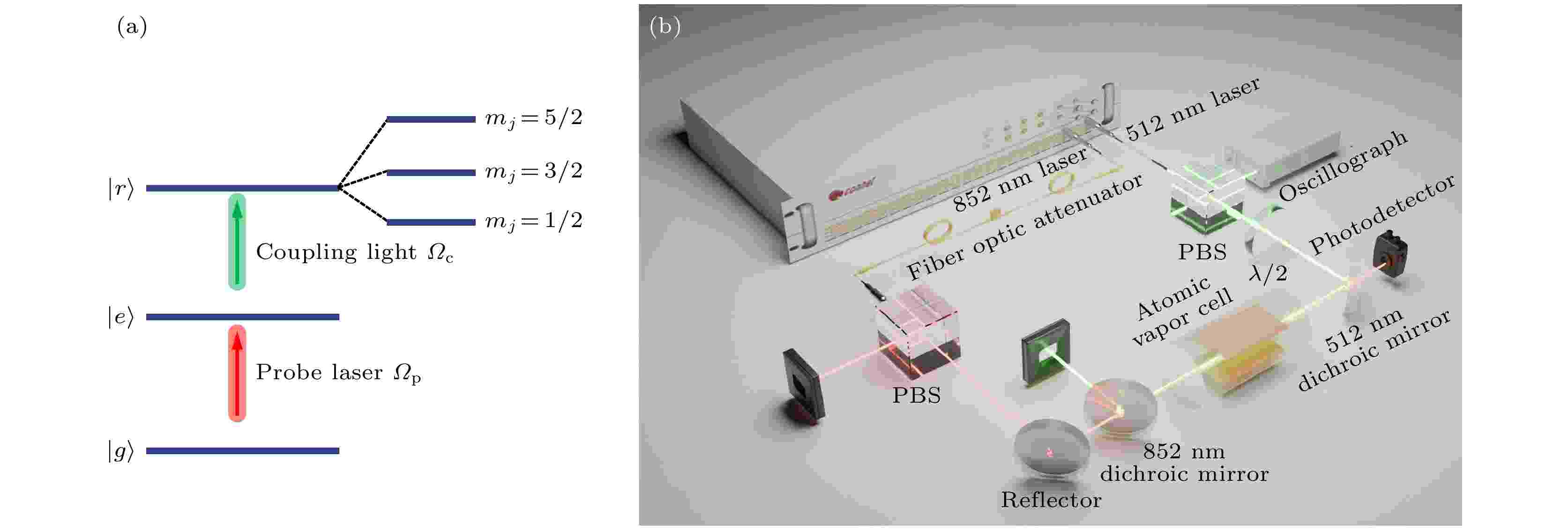 里德伯原子会敏感地响应外部电场作用并发生量子相干效应, 这是基于里德伯原子测量精确电场的基本原理. 本文首先采用双光子三能级系统生成铯里德伯原子并形成电磁诱导透明(electromagnetically induced transparency, EIT)效应, 以EIT-Stark光谱为宏观表征, 通过实验分别探讨了不同强度的直流电场和交流电场对里德伯原子Stark效应的调控作用, 揭示了强场测量受限的原因. 本文以电力系统工频强电场测量为目标, 提出了直流场调控扩大交流电场测量范围的方案, 建立了交直流电场共同作用于里德伯原子的动力学模型, 推导出解调后的直流和交流电场分量表达式. 在激光器扫频范围1 GHz的条件下, 施加8 V/cm的直流调控场, 采用28D3/2里德伯态可测到交流电场峰值可达32 V/cm, 较直接测量方法提升了33.3%; 设置不同强度的直流调控场进行实验, 解调后得到的交流场误差在0.8%以下. 本研究为基于里德伯原子的强场测量提供了一种有效的解决方案.