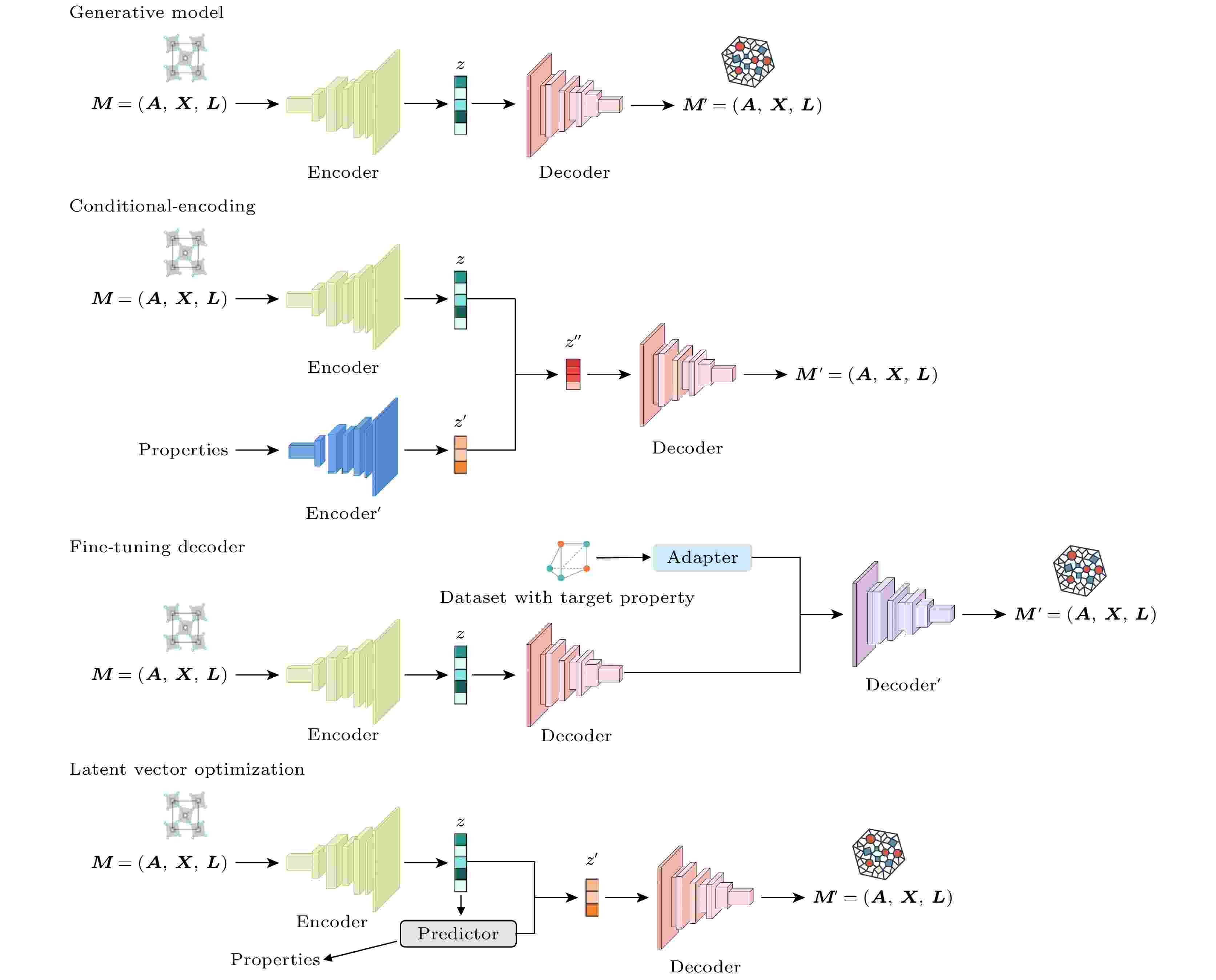 近年来, 机器学习在材料科学中的应用显著加快了新材料的发现, 特别是在结合第一性原理计算等传统方法后, 能够高效筛选已有数据库中的潜在高性能材料. 然而, 此类方法大多局限于已有化学空间, 难以实现对全新材料结构的主动设计. 为突破这一瓶颈, 基于生成模型的材料逆向设计方法逐渐兴起, 成为探索未知结构与性质空间的重要手段. 尽管当前生成模型在晶体结构生成方面取得了初步进展, 但如何实现目标性质导向的材料生成仍面临显著挑战. 本文首先介绍了近年来在材料生成领域中具有代表性的生成模型, 包括CDVAE, MatGAN以及MatterGen, 分析其在结构生成上的基本能力与局限. 随后重点探讨如何将目标性质有效引入生成模型, 实现性质导向的结构生成, 具体包括基于目标性质向量的Con-CDVAE、融合结构约束与引导机制的SCIGEN、通过适配器实现性质调控的微调版MatterGen以及结合隐空间搜索优化的CDVAE隐变量优化策略. 最后总结当前性质导向生成机制面临的挑战, 并展望其未来的发展方向. 本文旨在为研究者深入理解和拓展性质驱动的材料生成方法提供系统性参考和启发.