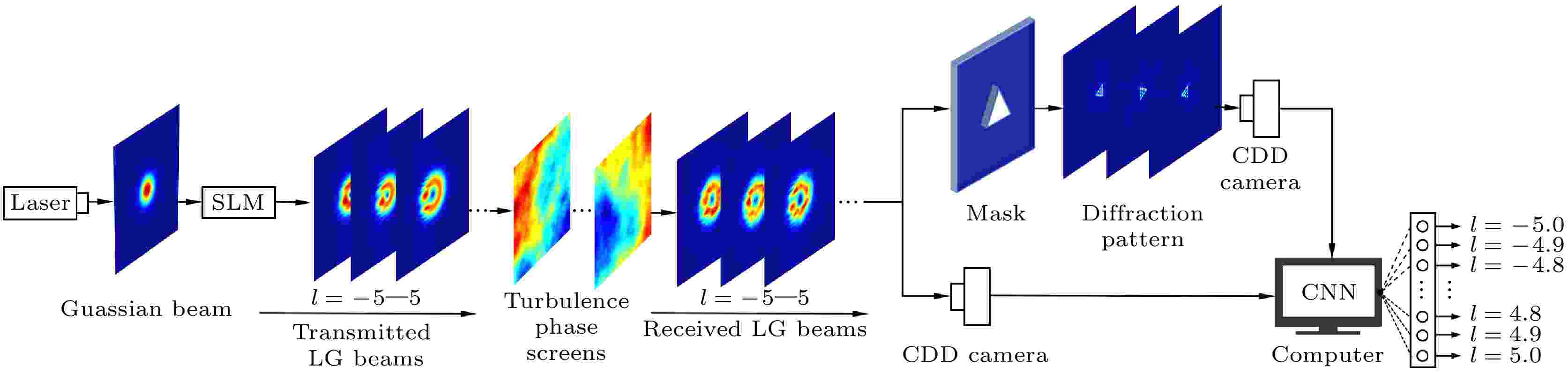 利用分数阶涡旋光束(fractional vortex beams, FVBs)作为信息载体可显著提高通信系统容量, 但由于相邻分数阶轨道角动量(fractional orbital angular momentum, FOAM)模态之间的间隔差异较小, 使得FVBs极易受到大气湍流影响, 因此精确地测量失真的FOAM模态对实际基于FVBs的通信系统而言至关重要. 本文提出了一种基于卷积神经网络-Transformer混合架构的双通道深度学习模型, 通过学习并融合FVBs光强分布与其衍射图样的互补特征信息, 实现对大气湍流环境下FOAM模态的有效识别. 结果表明, 在1000 m传输距离之内, 本文构建模型在弱、中湍流强度下识别101个FOAM模态的准确率可达100%, 强湍流时也能达到98.12%, 并且在未知湍流强度下也表现出良好的泛化能力, 为准确识别FOAM模态提供了一种新方法.
