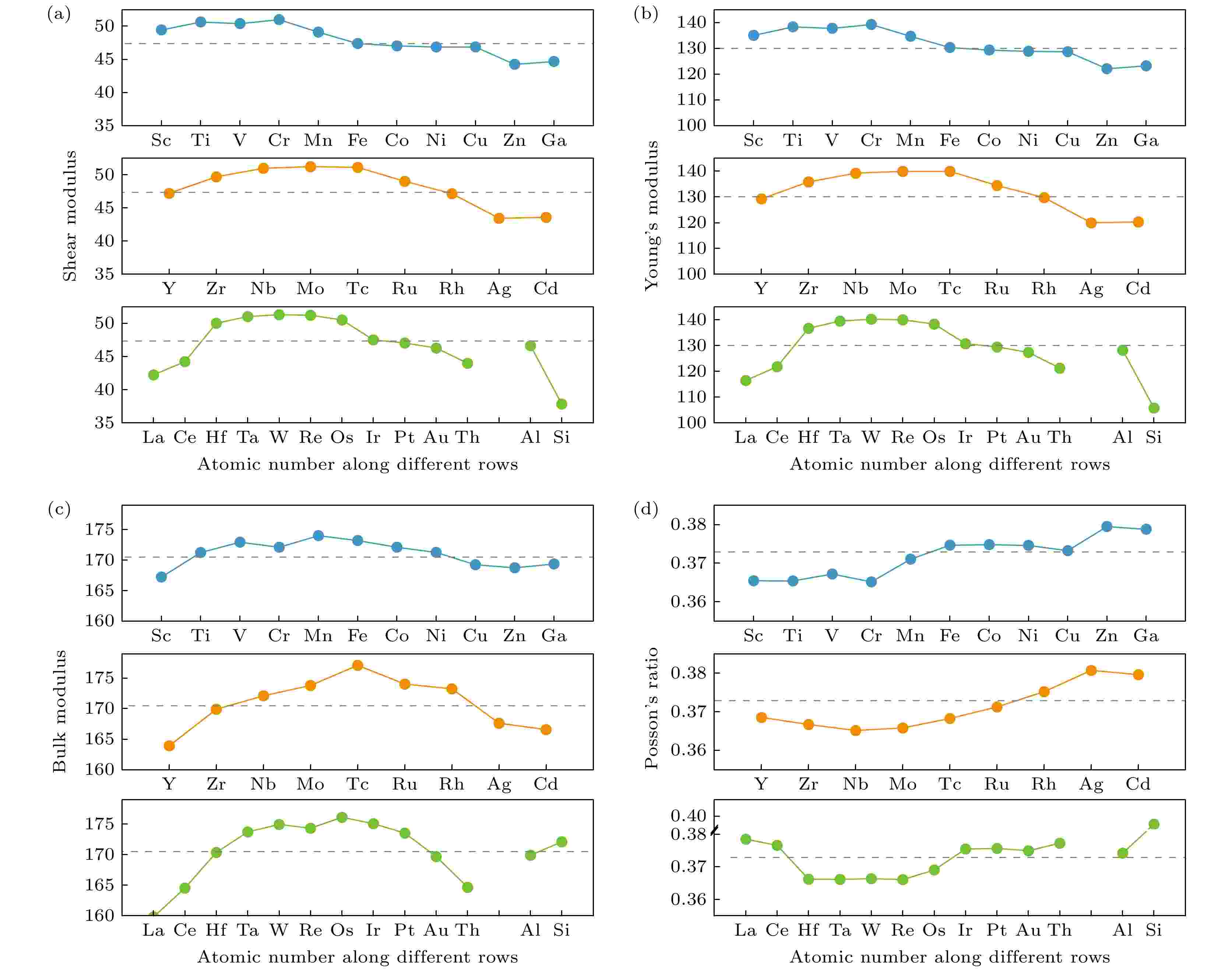 钯(Pd)合金较低的摩擦系数和较好的力学性能使得其在用于长时间稳定工作的高精度仪器仪表中具备潜在优势, 但是因为高昂的原料和实验成本导致基础数据缺乏, 无法进行高性能Pd合金的设计. 因此, 本研究利用第一性原理计算了Pd的晶格常数和弹性模量, 并建立Pd与Al, Si, Sc, Ti, V, Cr, Mn, Fe, Co, Ni等33种合金元素形成的稀固溶体模型, 计算了混合焓、弹性常数和弹性模量. 研究结果表明, 除Mn, Fe, Co, Ni, Ru, Rh, Os和Ir外, 其他合金元素都可以固溶到Pd中, 元素周期表两侧的合金元素能提高Pd固溶体的延展性, 其中La, Ag和Zn的作用最明显. 通过差分电荷密度分析, Ag掺杂后形成的电子云呈球形分布, 造成延展性提高, Hf掺杂后周围的离域程度最大, 表明Hf与Pd的键合存在较强的离子性, 导致Pd31Hf硬度较高. 本文数据集可在https://www.doi.org/10.57760/sciencedb.j00213.00186 中访问获取.