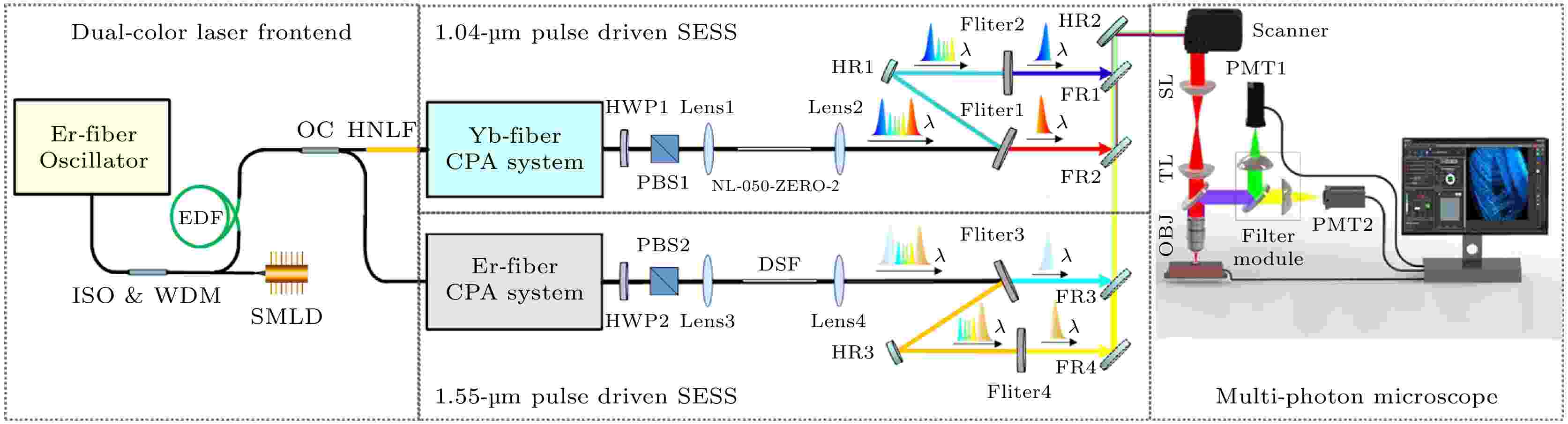 多光子显微镜(multiphoton microscopy, MPM)已成为生物医学领域的重要研究工具. 目前, MPM的驱动激光基于钛蓝宝石激光器, 可提供720—950 nm的波长可调谐飞秒脉冲. 为覆盖1000—1350 nm的第二生物透射窗口, 通常需要引入复杂的光学参量振荡器. 而为增加成像深度, 位于1600—1750 nm 的第三生物透射窗口的光源同样也得到了广泛的关注. 然而, 迄今为止还没有能够同时覆盖三个透射窗口的超快激光源, 这阻碍了MPM在生医领域的广泛应用. 本文发展了一种基于双波长光纤激光器的超快光源, 输出波长在800—1650 nm之间可调谐的四色飞秒脉冲, 覆盖了适合驱动MPM的全部波段. 利用该超倍频程的超快光源驱动MPM, 我们成功地实现了对多种生物医学样品的无标记多模态成像.