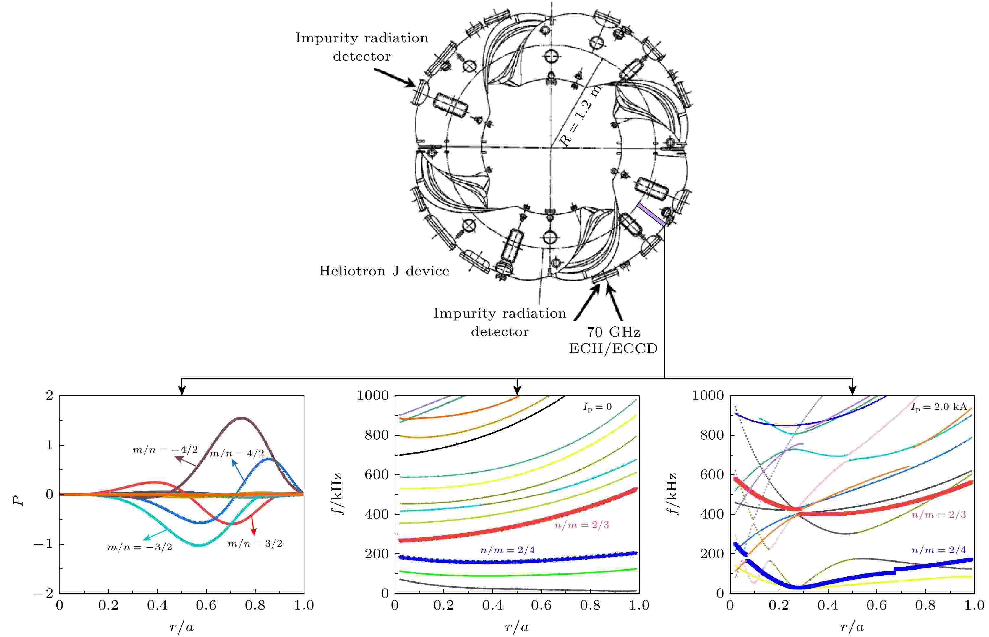 高能粒子(energetic particles, EP)驱动的不稳定性及其调控规律, 是受控核聚变研究中亟需解决的关键科学问题之一. 本文以京都大学Heliotron J装置为实验平台, 系统研究了电子回旋加热(electron cyclotron heating, ECH)与中性束注入(neutral beam injection, NBI)对EP驱动不稳定性的影响. 研究采用实验诊断与数值模拟相结合的方式, 揭示了典型等离子体参数在不稳定性激发与抑制中的作用机制, 以及磁场位型和等离子体参数耦合作用在ECH加热系统影响不稳定性中发挥的作用. 文章通过FAR3D程序分析了随着ECH功率的变化, 高能离子比压、热比压、电子温度以及电阻率对模态驱动和阻尼过程的影响规律. 模拟结果与实验观测在模数和径向结构上高度一致, 证实了增长率对快粒子比压的敏感性, 以及电子温度对朗道阻尼和连续谱阻尼的增强效应. 模拟结果表明高能离子慢化时间的改变在模态演化中发挥重要作用. 研究结果不仅为理解不同磁场位型下ECH加热系统对不稳定性的差异化作用提供了物理依据, 也为未来螺旋器/仿星器类装置中优化加热方式、提升等离子体运行稳定性提供了重要参考.
