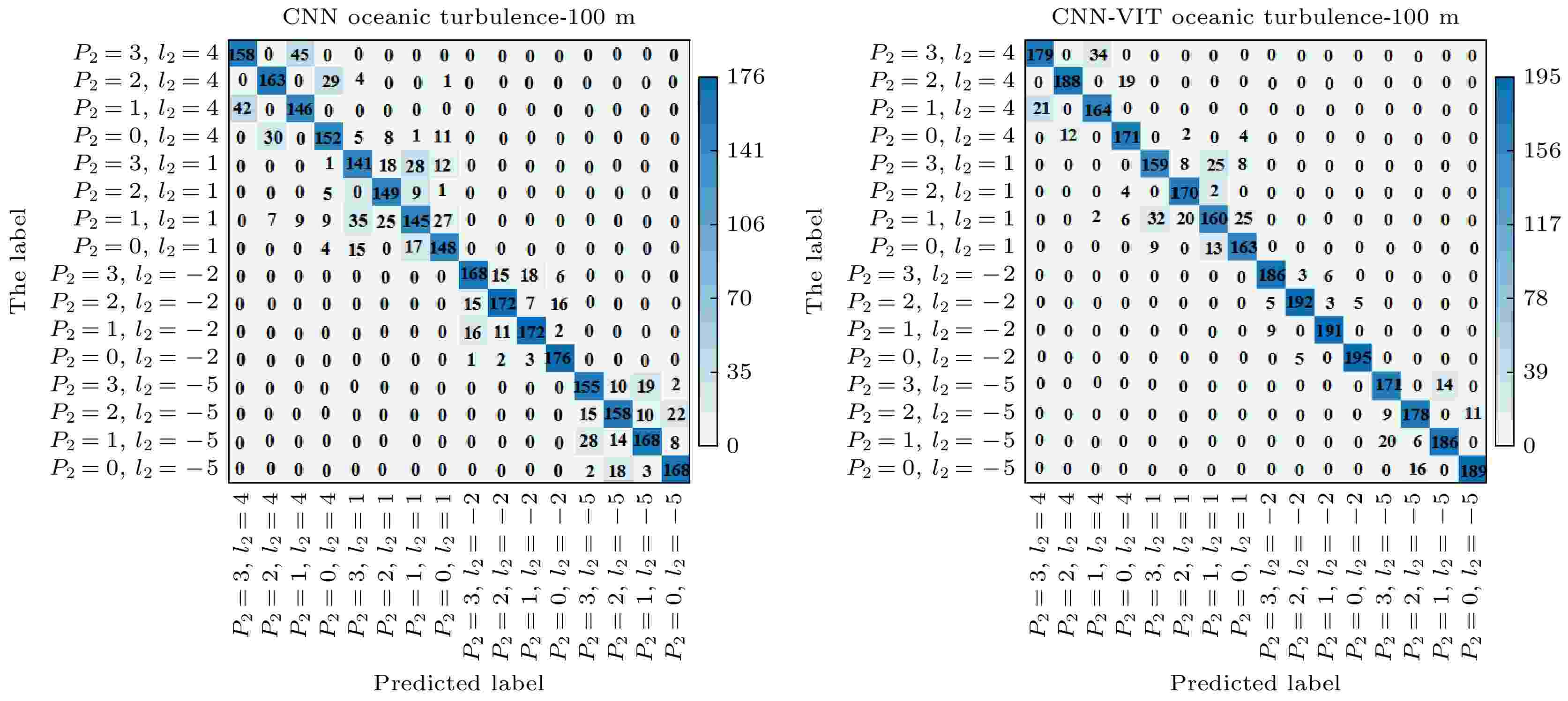 本文提出了一种基于卷积神经网络(convolutional neural network, CNN)与改进视觉变换器(vision transformer, VIT)的涡旋光束叠加态轨道角动量(orbital angular momentum, OAM)模式识别方法. 以海洋湍流畸变的三组拉盖尔-高斯光束模式叠加光场强度分布图为输入, 有机整合了CNN的局部特征提取优势与稀疏注意力机制驱动的VIT的全局快速分类能力, 实现端到端的波前畸变高效精准识别. 通过数值仿真模拟海洋湍流环境叠加态OAM模式, 利用功率谱反演法模拟海洋湍流, 以识别准确率和混淆矩阵作为OAM模式识别的评估指标. 实验结果表明, CNN-VIT模型在不同海洋湍流强度、波长、传输距离和模式间隔条件下均展现出优异的OAM模式识别准确率性能. 与现有的CNN和VIT相比, 本文模型在强海洋湍流条件下识别准确率分别提升了23.5%和9.65%. 这证明了CNN-VIT模型在涡旋光叠加态OAM模式识别的应用潜力.