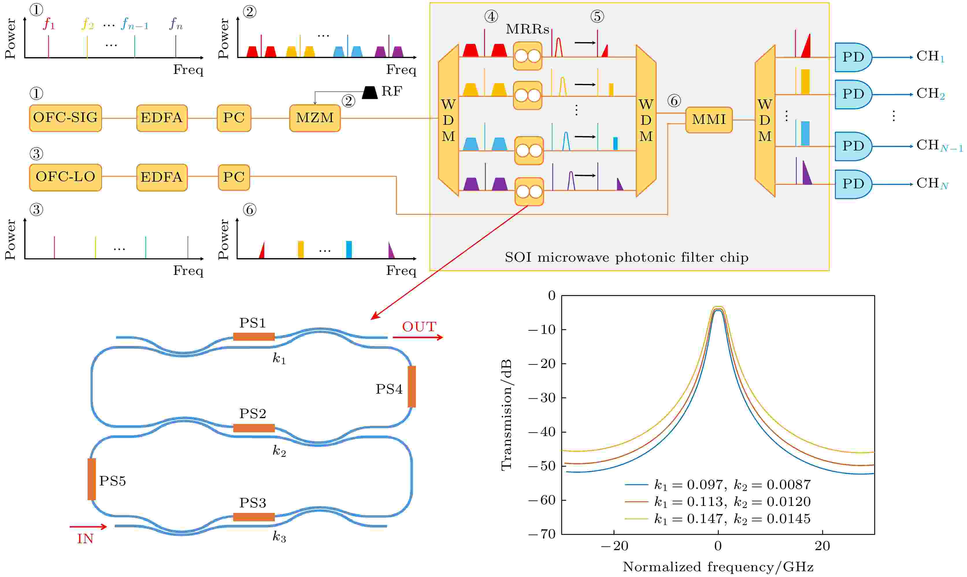 为应对未来多变电磁环境对高频宽带信号处理的需求, 突破传统电子器件的带宽限制, 本文提出了一种基于硅基光电子集成平台的可重构微波光子信道化接收芯片. 该芯片采用双级光学处理架构, 前端级联马赫-曾德尔干涉型波分复用器实现粗粒度光谱划分, 规避自由光谱范围严格对齐的复杂性; 核心集成耦合谐振器光波导滤波器阵列作为可调谐带通滤波器, 通过热调耦合系数动态重构带宽(2.25—3.12 GHz), 其20 dB/3 dB形状因子达3.08, 显著提升滚降特性. 仿真验证表明: 该系统支持8—28 GHz或8—36 GHz射频信号的信道化处理, 分割为8个中频子带(1.4—3.6 GHz或2—5 GHz), 聚合带宽覆盖X—K波段; 并通过5 GHz带宽线性调频信号的接收和重构实验证实其宽带信号实时处理能力. 该芯片的高集成度设计与带宽动态重构功能, 为微波光子雷达、多频段射频系统等应用提供了软件定义解决方案, 推动超宽带信号处理向多功能、低功耗方向发展.
