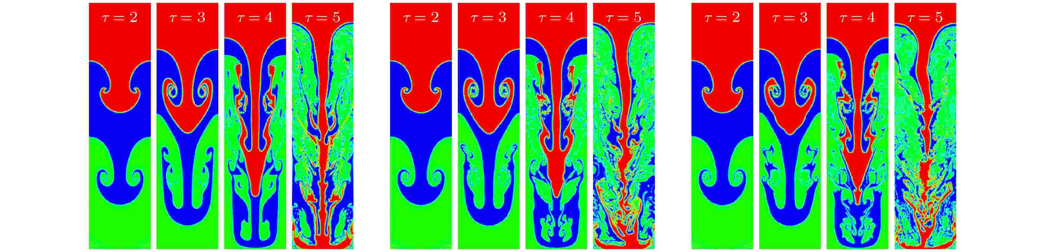基于具有守恒性与相容性的N相相场模型, 发展了一种用于高效模拟N相非混溶不可压流体流动的正则化格子Boltzmann方法. 通过设计辅助矩, 该方法能够精确恢复二阶Allen-Cahn方程与修正的动量方程. 通过数值模拟三相液滴透镜铺展与三相Kelvin-Helmholtz不稳定性现象, 验证了所发展的N相正则化格子Boltzmann方法的正确性与有效性. 最后, 对三相Rayleigh-Taylor不稳定性进行了数值模拟与分析, 重点探究了雷诺数在$500\leqslant Re \leqslant 20000$范围内(特别是高雷诺数$Re=20000$工况下)相界面的演化过程, 定量分析了两个界面处气泡与尖钉的振幅以及无量纲化速度的变化规律.