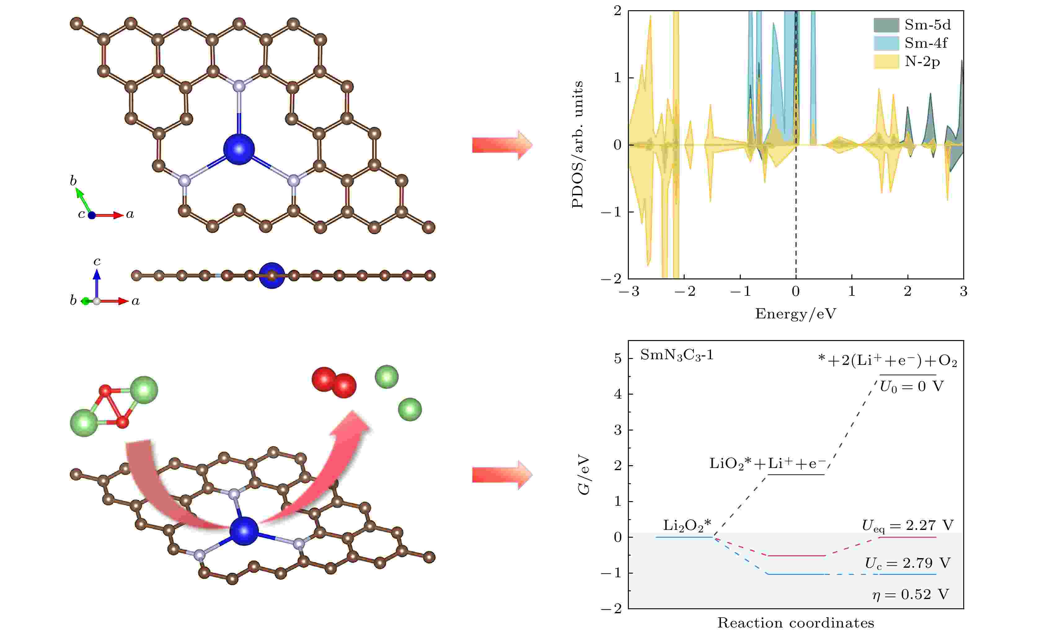 锂-氧电池虽有超高的理论能量密度, 但实际应用仍面临氧化反应动力学缓慢、充电过电位高等严峻问题. 大多数应用于锂-氧电池的单原子催化剂主要是基于过渡金属不饱和配位的d轨道, 而稀土元素Sm有丰富的4f轨道电子. 最近研究表明Sm单原子催化剂在锂-硫电池中能提升多硫化物的转化, 并在全电池实验中实现超稳定的循环性能. 因此, 本研究设计并优化了17种Sm单原子催化剂SmNxCy (x+ y = 4, 6), 通过稳定性和催化活性筛选出SmN3C3-1催化剂应用于锂-氧电池. 通过研究对Li2O2分子的催化氧化, 发现Li2O2分子氧化的速率决定步为第2步, 充电过电位为0.52 V. 机理分析表明SmN3C3-1催化剂的d-f-p轨道杂化消除了对Sm原子4f轨道的屏蔽, 促进了界面电荷转移, 从而增强了对Li2O2分子的催化氧化. 本工作为稀土单原子催化剂在锂-氧电池中的应用提供了新视角.