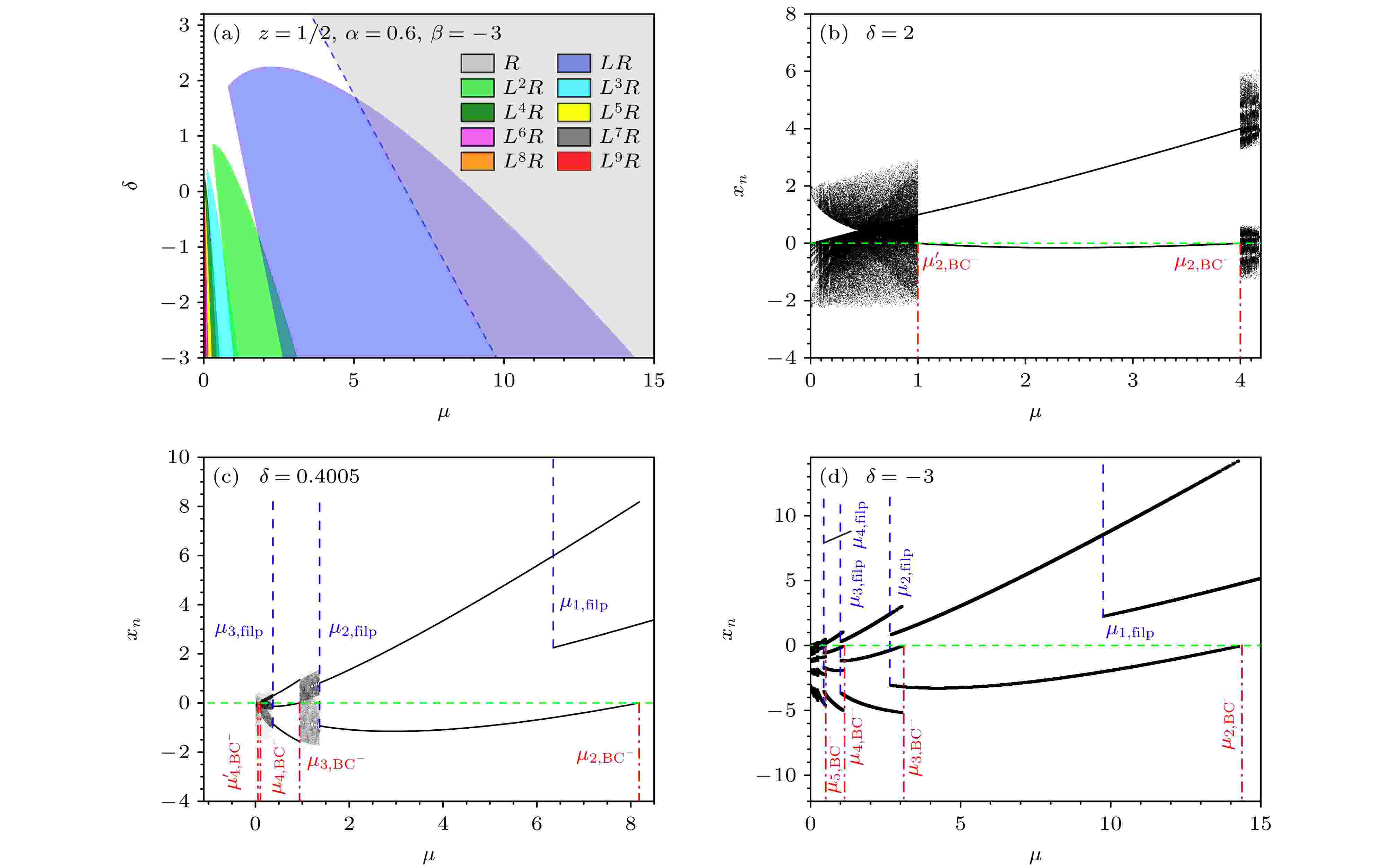 本文研究了一类分段光滑不连续一维映像的动力学, 该映像左支是一线性函数, 右支是指数为z的幂律函数. 在$x=0$处存在间断$[\mu,\mu+\delta]$, 其中μ为控制参数. 当周期轨道失稳时, 系统会进入混沌状态. 而不连续性的出现导致了边界碰撞分岔的发生, 可以使稳定的周期轨道转变为混沌状态或者另外一个稳定的周期状态. 在这类转变点的附近, 常常伴随着吸引子共存现象. 此外, 随控制参数减小出现周期递增现象. 得到了求解这类不连续映像在任意参数z和δ下边界碰撞分岔临界控制参数的一般方法, 将其归结为求解无量纲控制参数($\mu/\mu_0$, 其中$\mu_0$为$\delta=0$时的控制参数)的代数方程, 该方程对于简单的有理数或者较小的整数z, 可以解析求解; 对于任意实数z, 可以数值求解. 据此, 解析得到了$L^{n-1}R$周期轨道的稳定性和边界碰撞分岔的临界控制参数. 基于稳定性和边界碰撞分岔的解析分析, 获得了双参数$\mu\text{-}\delta$平面中系统动力学的相平面, 讨论了系统的动力学行为, 发现了三类余维-2分岔点, 并给出了坐标通式. 同时, 在相平面中还发现了余维分岔点的融合, 构成一类特殊的三相点, 并解析得到其存在的条件.