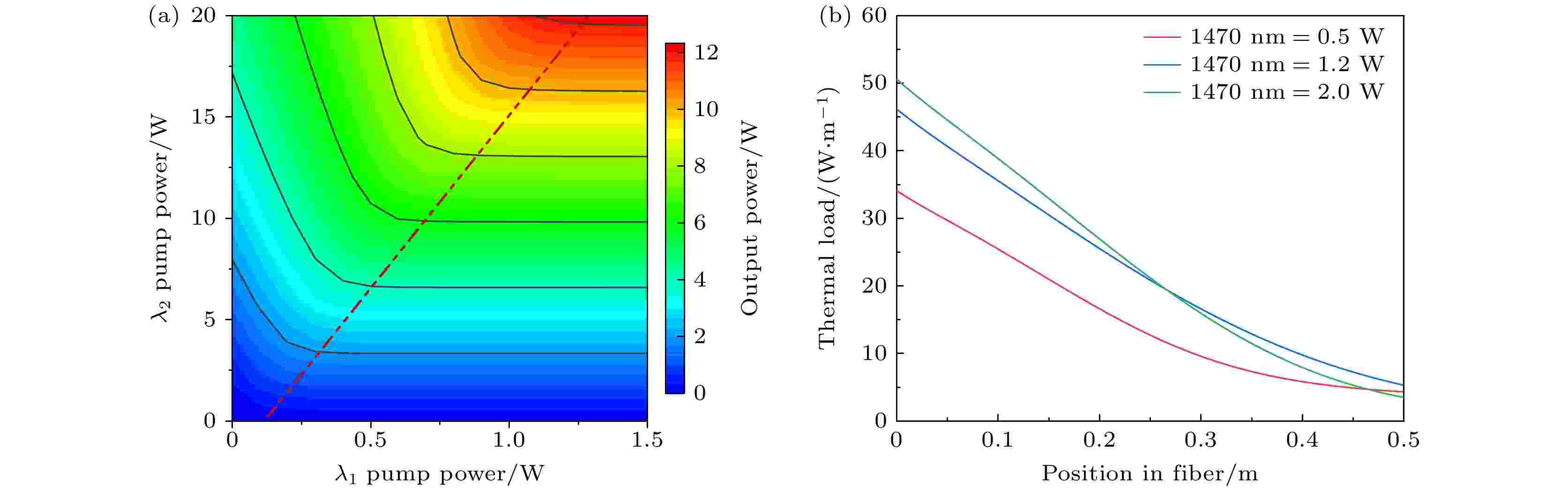 1.5 μm和1.7 μm双波长泵浦方案, 可以在实现高效率2.8 μm激光产生的同时解决1.7 μm单波长泵浦由于基态吸收较弱需要较长掺铒氟化物光纤的问题. 建立了基于双波长泵浦低掺铒氟化物光纤的2.8 μm光纤激光器仿真模型, 系统分析了不同泵浦波长组合对2.8 μm激光输出功率和光光转换效率的影响. 仿真结果表明选取1470 nm和1680 nm的双波长泵浦组合, 可以高效地将粒子由基态能级4I15/2搬运至激光上能级4I9/2, 实现粒子数反转, 达到使用米级低掺铒氟化物光纤实现高效率2.8 μm波段激光输出的目标.