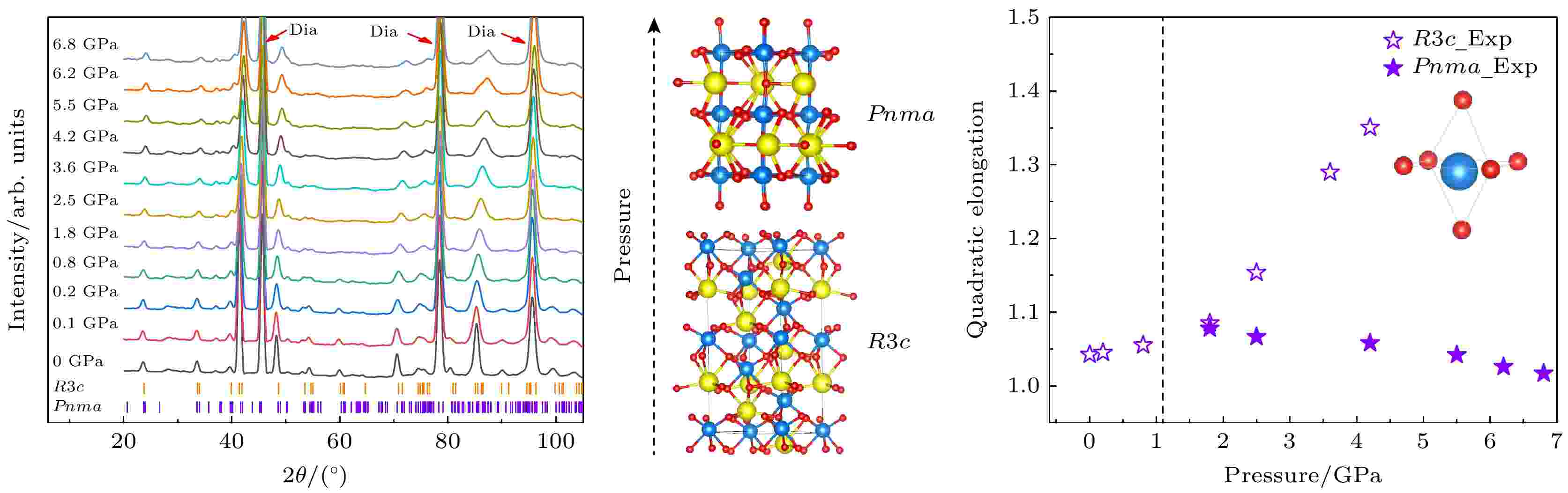 弛豫铁电体钛酸铋钠(Na0.5Bi0.5TiO3, NBT)具有优异的铁电性能, 被广泛认为是极具应用前景的无铅铁电材料. 深入阐明其在高压下的结构演化规律与相变机理, 对于推动这类环境友好型铁电材料的应用至关重要. 本研究结合原位高压中子衍射实验与第一性原理计算, 研究了NBT在高压下的结构演化规律. 高压中子衍射实验结果表明, NBT的常压相R3c相和高压相Pnma相的共存压力区间为1.1—4.6 GPa, 其体积模量分别为89.3 GPa和108.6 GPa. 通过分析压力诱导的微观结构演变, 本研究阐明了NBT高压相与常压相在微观结构特征上的差异及对体积模量的影响, 建立了高压下NBT的微观结构响应与宏观物理性能的内在联系. 获得的相关结论为无铅压电材料的高压性能调控提供了重要的实验依据与参考.