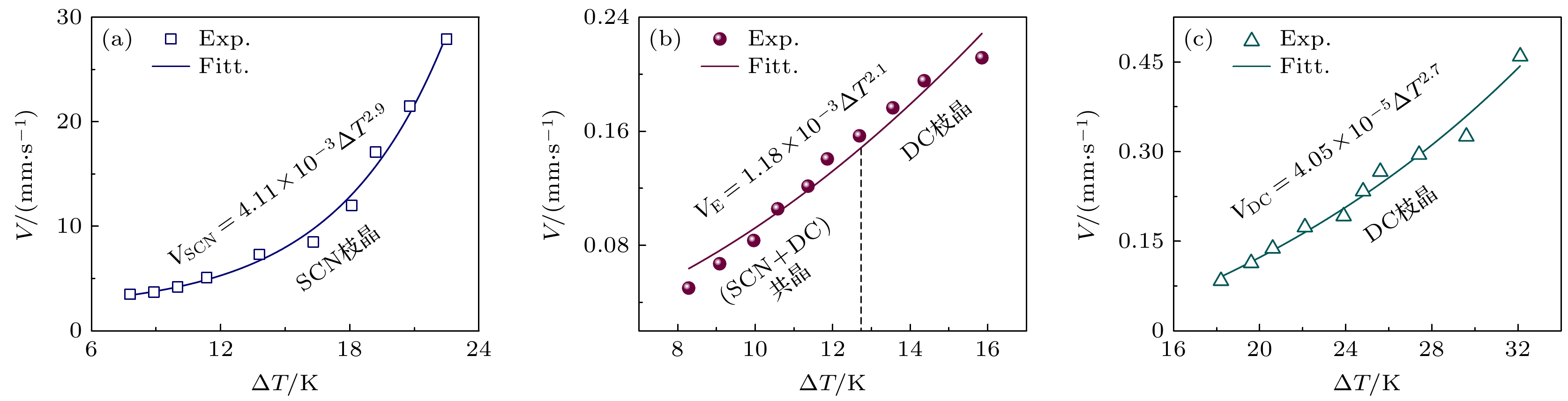 As an important and promising experimental method of simulating the containerless state in outer space, acoustic levitation provides excellent contact-free condition for investigating solidification process. Meanwhile, the radiation pressure and acoustic streaming caused by nonlinear effects bring various kinds of novel phenomena to crystallization kinetics. In this work, high-speed charge coupled device (CCD), low-speed camera and infrared thermal imager are used simultaneously to observe the crystallization process of acoustically levitated SCN-DC transparent alloys. The undercooling ability and solidification process of alloy droplets with different aspect ratios are explored in acoustic levitation state. For hypoeutectic SCN-10%DC, eutectic SCN-23.6%DC and hypereutectic SCN-40%DC alloys, the experimental maximum undercoolings reach 22.5 K (0.07TL), 16 K (0.05TE) and 32.5 K (0.1TL) and the corresponding crystal growth velocities are 27.91, 0.21 and 0.45 mm/s, respectively. In SCN-10%DC hypoeutectic alloy, the nucleation mode of SCN dendrite changes from edge nucleation into random nucleation with the increase of undercooling. For SCN-23.6%DC eutectic alloy, when the undercooling exceeds 12.6 K, DC dendrites preferentially nucleate and grow, and then the (SCN+DC) eutectic adheres to and grows on DC dendrites. Moreover, the growth interface of DC dendrites gradually changes from sharp into smooth within SCN-40%DC hypereutectic alloy as the undercooling degree rises. The undercooling distribution curve and nucleation probability variation trend versus aspect ratio are analyzed. It is found that as the aspect ratio increases, undercooling of alloy droplet first increases, then decreases, and finally remains almost unchanged. Further analysis shows that with the increase of aspect ratio, the cooling rate will rise and thus enhance the undercooling. However, the increase in surface nucleation rate and the droplet oscillation inhibits deep undercooling of alloy droplet. Therefore, the coupled effects of cooling rate, surface nucleation rate, and droplet oscillation determine the undercooling of the alloy. In the case of SCN-40% DC hypereutectic alloy, the acoustic streaming and surface oscillation arising from acoustic field are the main factors intensifying surface nucleation.