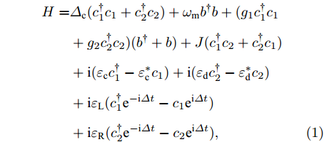 $\varepsilon_{\rm c}$ and$\varepsilon_{\rm d}$ ($\varepsilon_{\rm L}$ and$\varepsilon _{\rm R}$ ) are used to drive cavity$c_{1}$ and$c_{2}$ respectively. Meanwhile, the two cavities are linearly coupled to each other with coupling strength J图 2 传输振幅