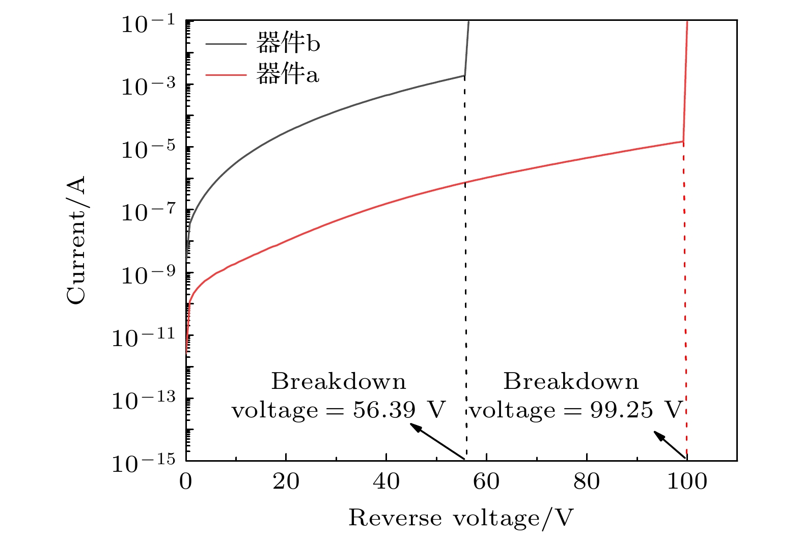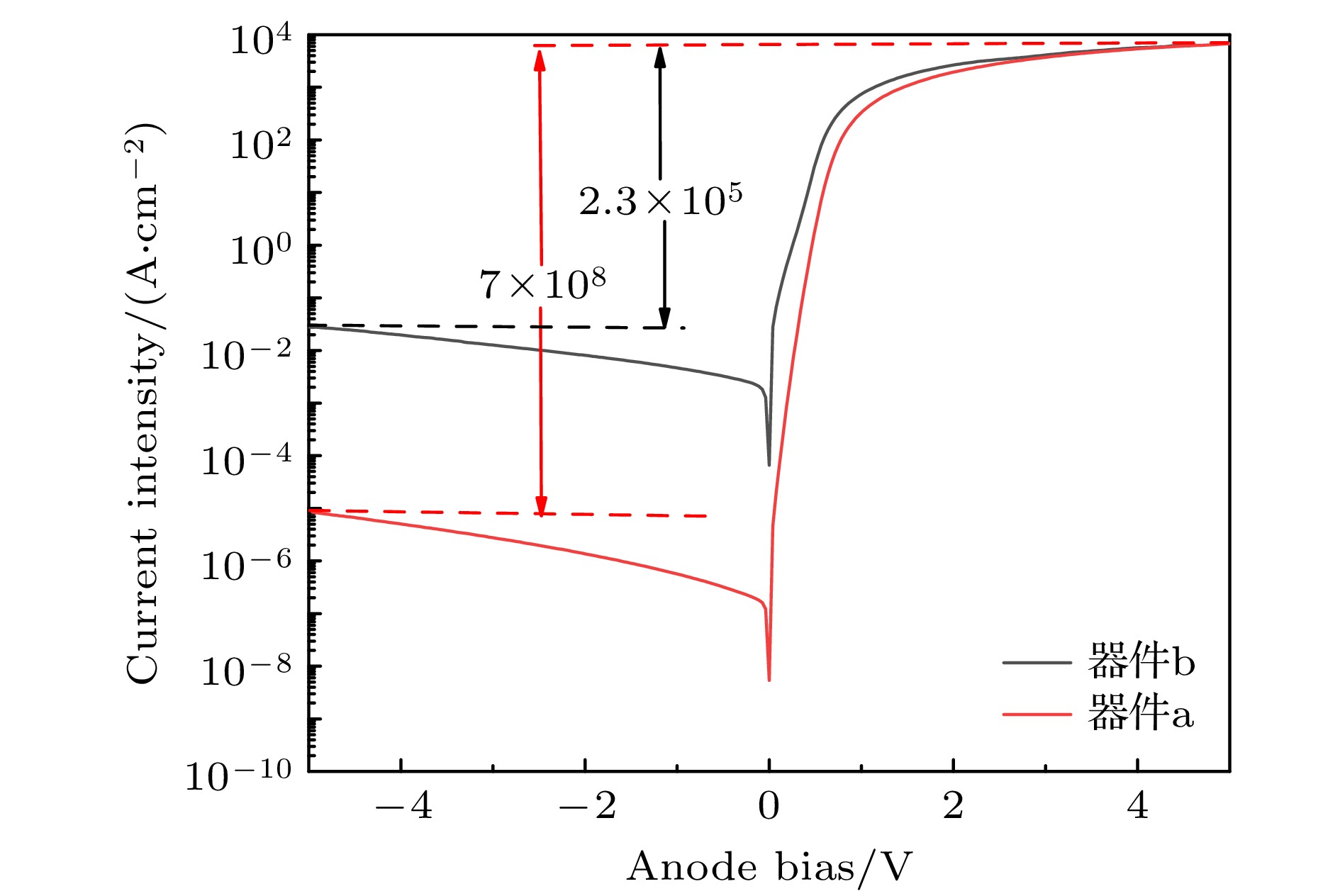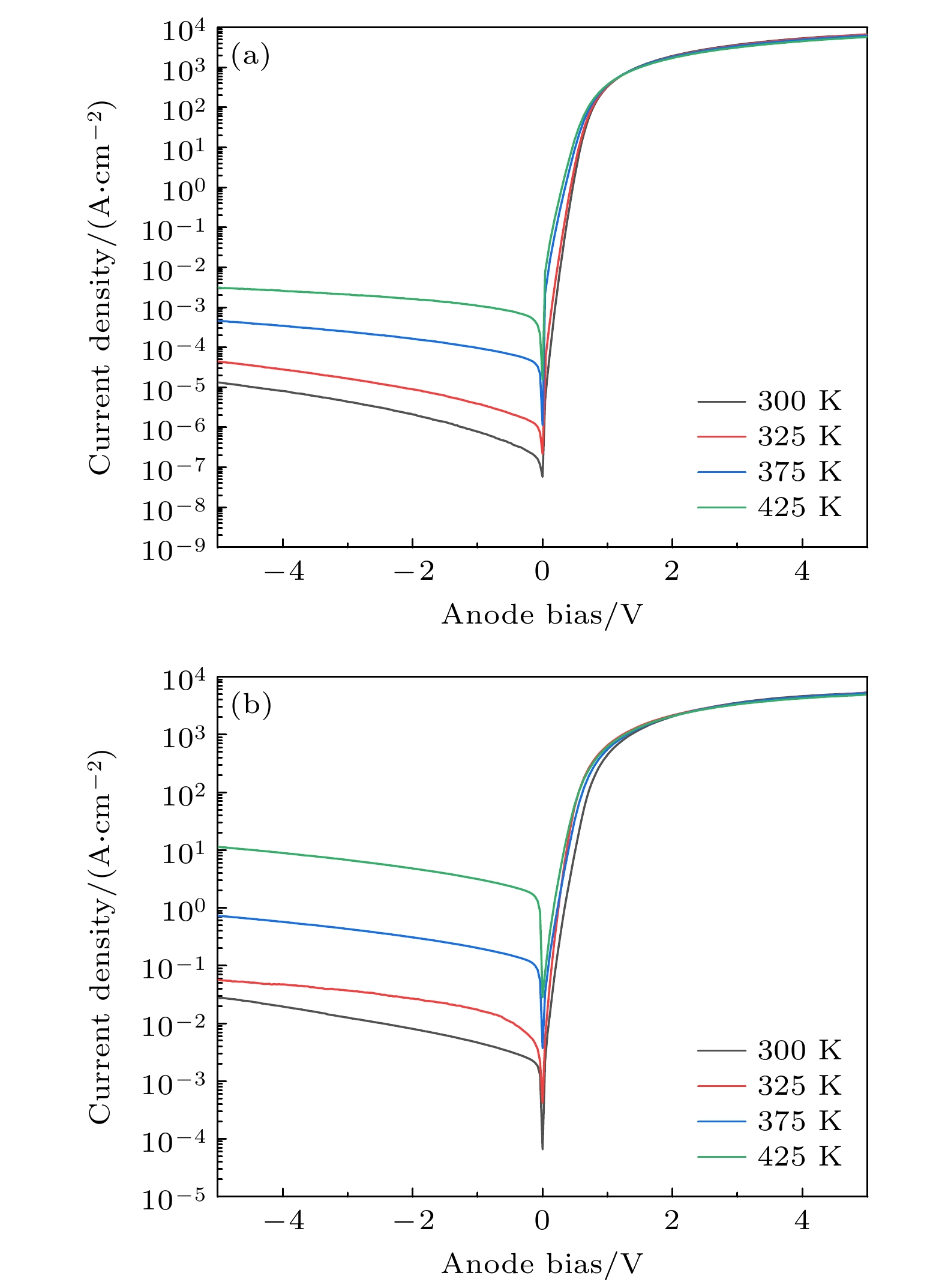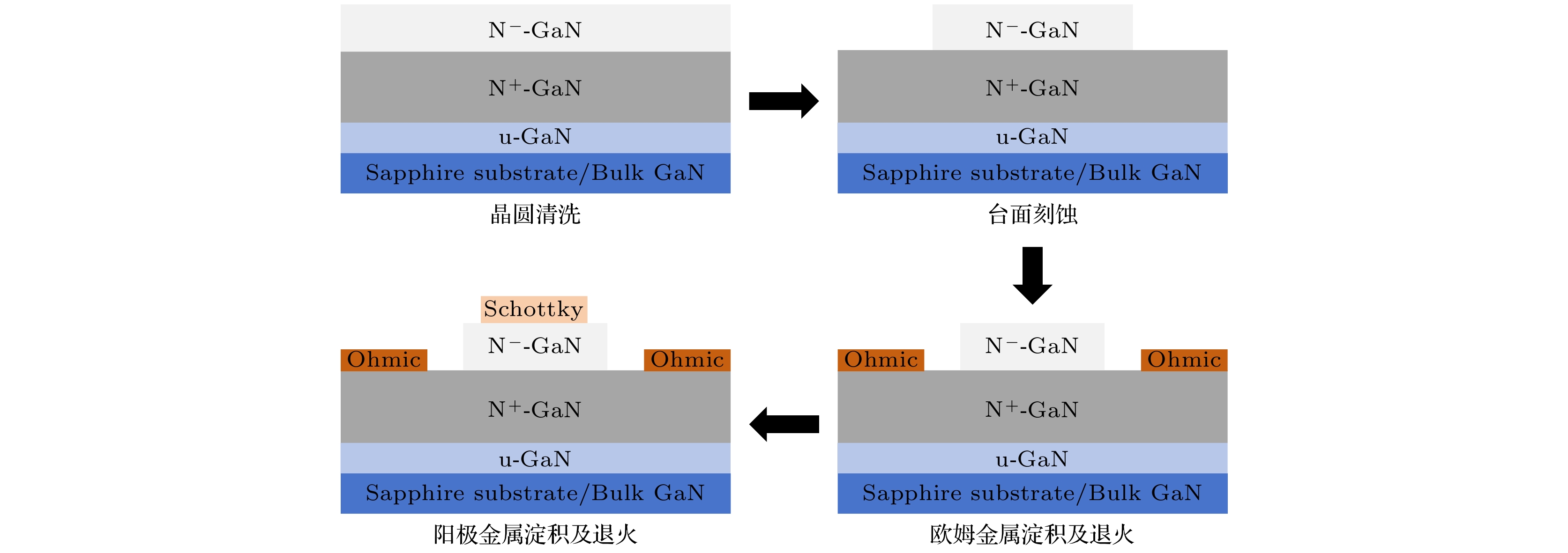 GaN based Schottky barrier diode (SBD) possesses advantages including high power density, high conversion efficiency, and excellent switching characteristics. During heteroepitaxial growth of GaN, a high density of threading dislocations is inevitably introduced, which can degrade device reliability. This paper reports a low dislocation density N+/N– GaN quasi-vertical SBD fabricated on a freestanding GaN substrate. The characterization results of high-resolution X-ray diffraction and atomic force microscopy demonstrate that the high-quality epitaxial layer with a total dislocation density of 1.01 × 108 cm–2 and a root mean square surface roughness of 0.149 nm is achieved on a freestanding GaN substrate. The device prepared based on a high-quality epitaxial layer exhibits an ultra-low leakage current density of 10–5 A/cm2 at a reverse voltage of –5 V, without employing any edge termination structures or field plates or plasma treatment. Compared with the devices prepared on sapphire substrates using identical processes, the device prepared in this work reduces the reverse leakage current by four orders of magnitude. The experimental results show that the quasi-vertical GaN based SBD fabricated on a freestanding GaN substrate significantly reduces reverse leakage current and substantially enhances the overall electrical performance of the device. By employing emission-microscope (EMMI), leakage current in quasi-vertical SBD is identified to be primarily localized at the anode edge, and the underlying leakage mechanism is elucidated. Finally, temperature-dependent measurements demonstrate that the device maintains a leakage current below 10–3 A/cm2 at 100 ℃, confirming the potential of quasi-vertical SBD on freestanding GaN substrate for practical applications.