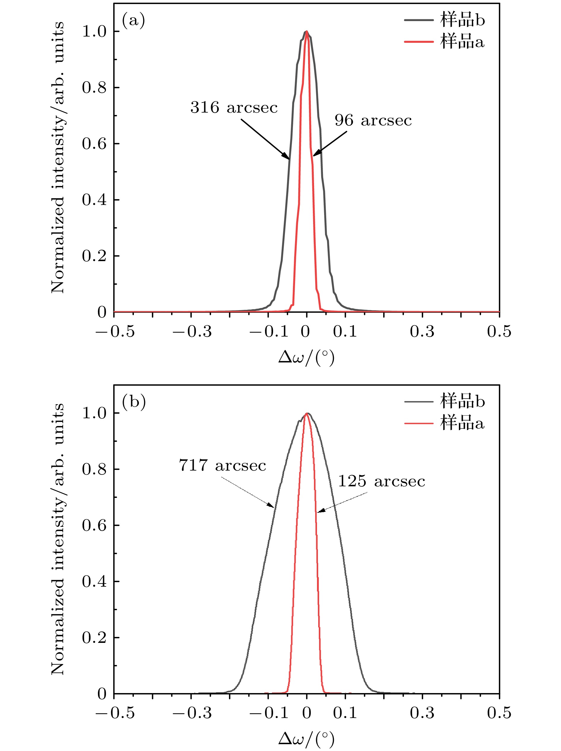 表 1 两组样品在(002)和(102)晶面的半高宽和位错密度