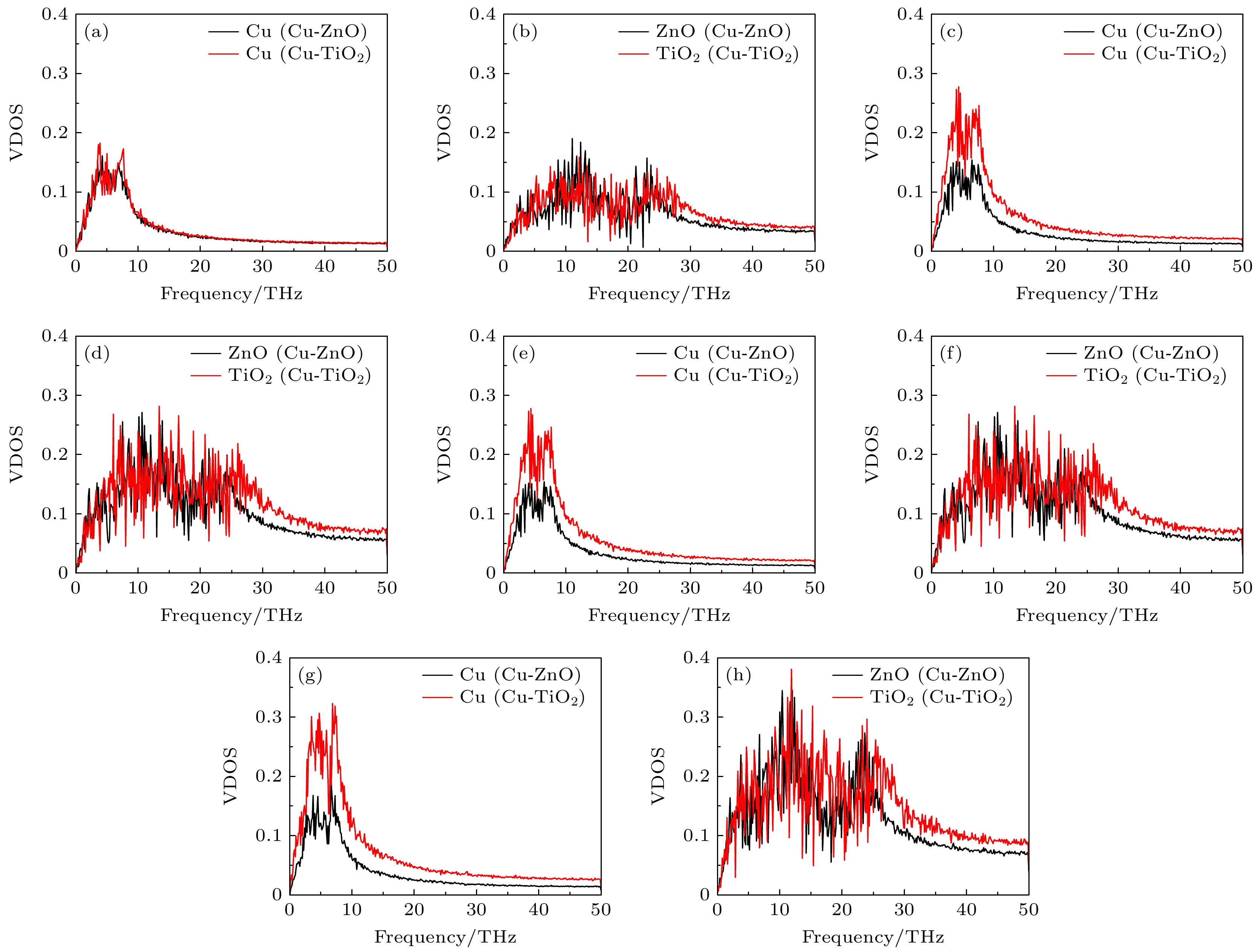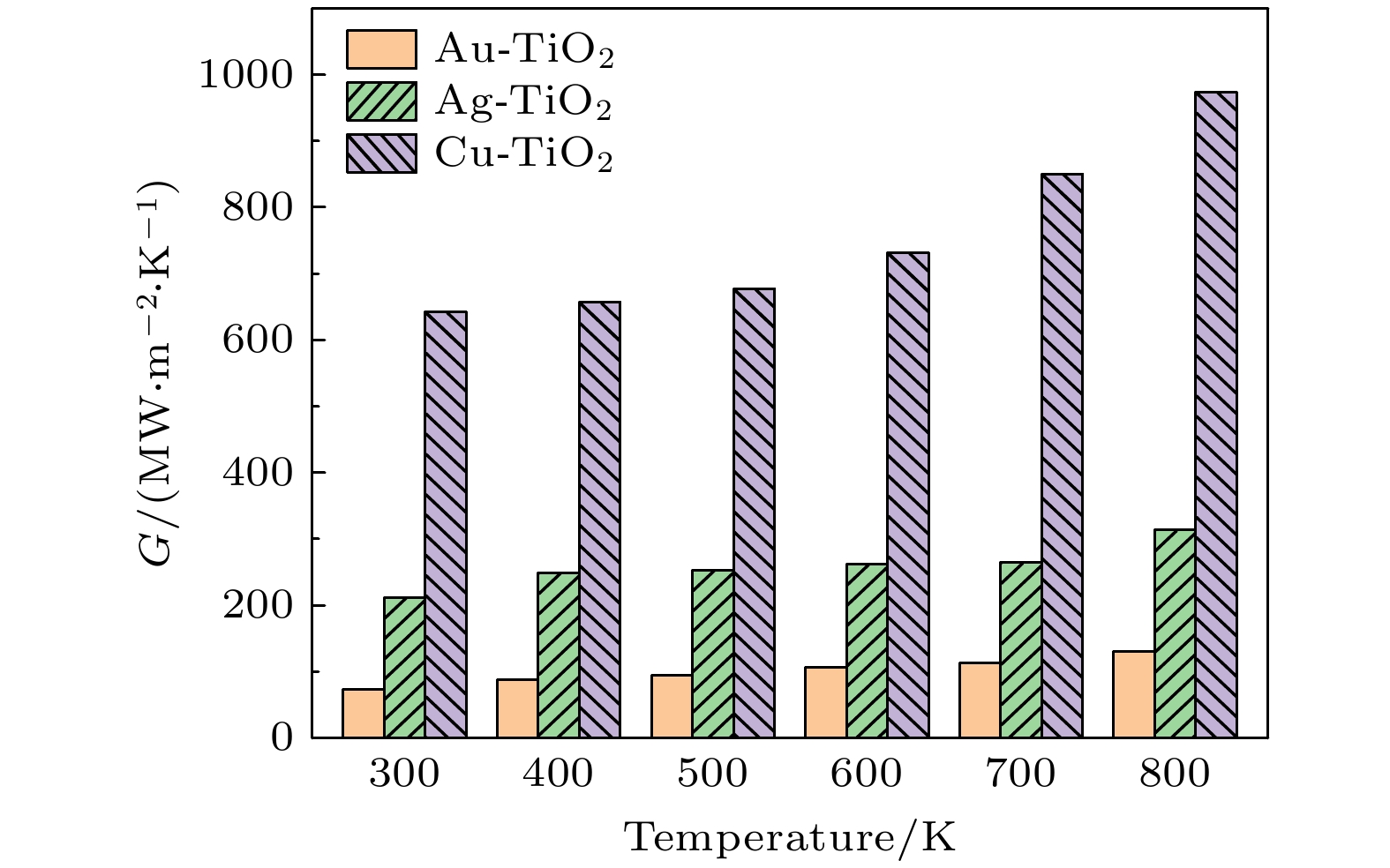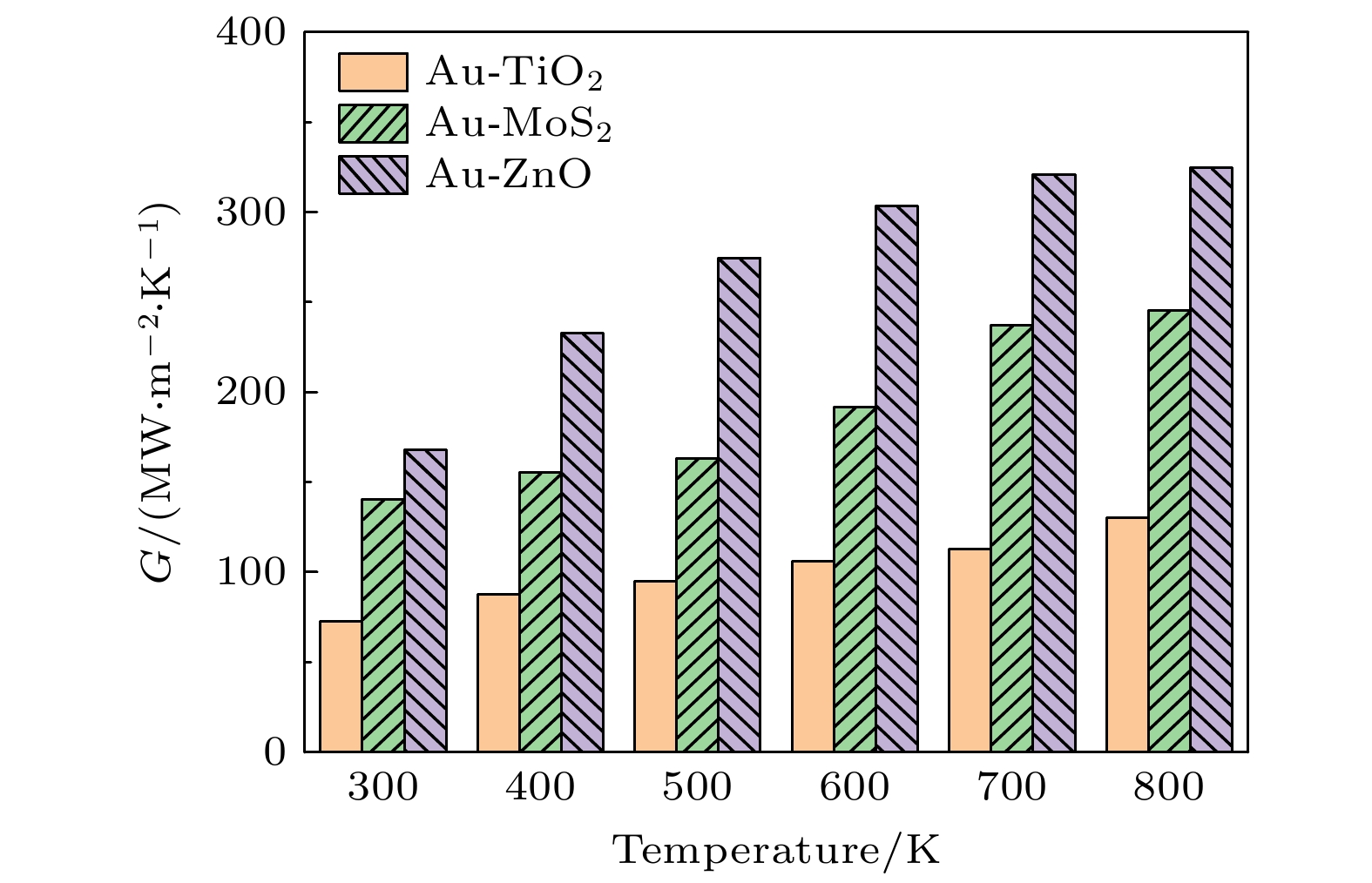 Plasmonic solar water splitting is produced on the composite electrode with plasmonic metal nanoparticles loaded on semiconductor, where the localized heating generated by relaxation of the metal’s localized surface plasmon resonance (LSPR) under light excitation enhances hydrogen production efficiency. To optimize composite photoanodes for photoelectrochemical water splitting system, the non-equilibrium molecular dynamics simulations are conducted to obtain the interfacial thermal conductivity between plasmonic metals (Cu, Ag, Au) and semiconductors (TiO2, ZnO, MoS2) at varying temperatures. The relationship between interfacial thermal conductivity and phonons at different frequencies is investigated via vibrational density of states which is calculated from the velocity autocorrelation functions and subsequent phonon participation ratio. The results indicate that as he temperature increases, the interfacial thermal conductivity of all composite electrode configurations is enhanced. When Cu and Ag are combined with TiO2 into Cu-TiO2 and Ag-TiO2, respectively, the thermal transport performances of Cu-TiO2 and Ag-TiO2 are superior to Au-TiO2, and the interfacial thermal conductivity of Cu-TiO2 reaches 973.56 MW·m–2·K–1 at 800 K. With Au as the fixed plasmonic component, Au-ZnO shows that its interfacial thermal conductivity reaches 324.44 MW·m–2·K–1 at 800 K, which is higher than those of Au-MoS2 and Au-TiO2. Based on the obtained interfacial thermal conductivity of different composite photoanodes, it is predicted that Cu-ZnO is the optimal composite, but its interfacial thermal conductivity is 547.69 MW·m–2·K–1 at 800 K, second only to Cu-TiO2. The analysis of vibrational density of states and phonon participation ratio shows that the low-frequency region (0—10 THz) is the main region for thermal transport, and both interfaces exhibit a high phonon participation ratio range of 0.7—0.8. However, the Cu-TiO2 possesses much higher vibrational density of states than Cu-ZnO within this critical band. Although Cu-ZnO exhibits a higher phonon participation ratio range in the high-frequency range, its lower overall interfacial thermal conductivity is attributed to the minimal contribution of high-frequency phonons to interfacial thermal conductance. The findings provide optimization strategies based on interfacial thermal transport mechanisms for constructing efficient photoanodes for solar water splitting.