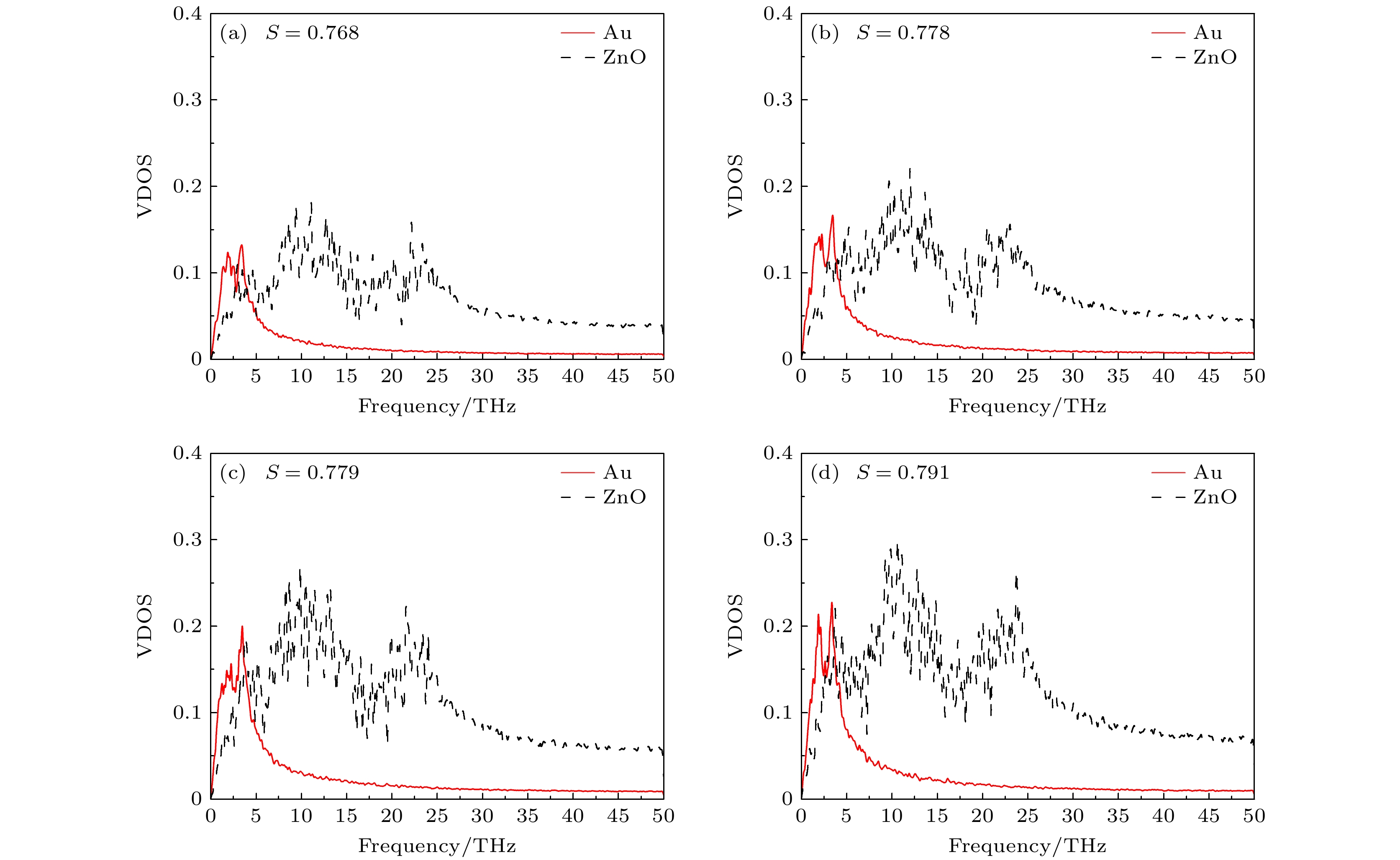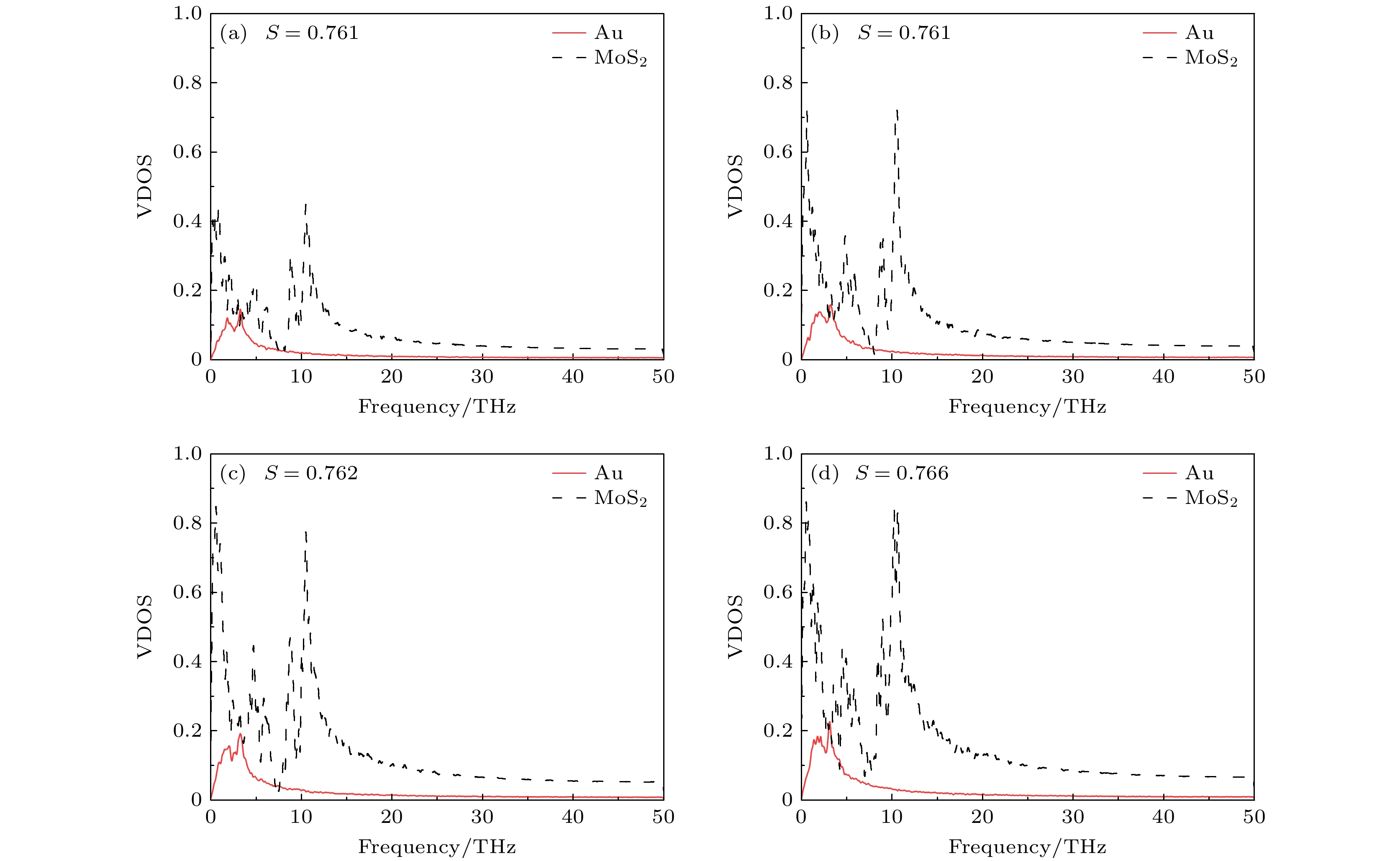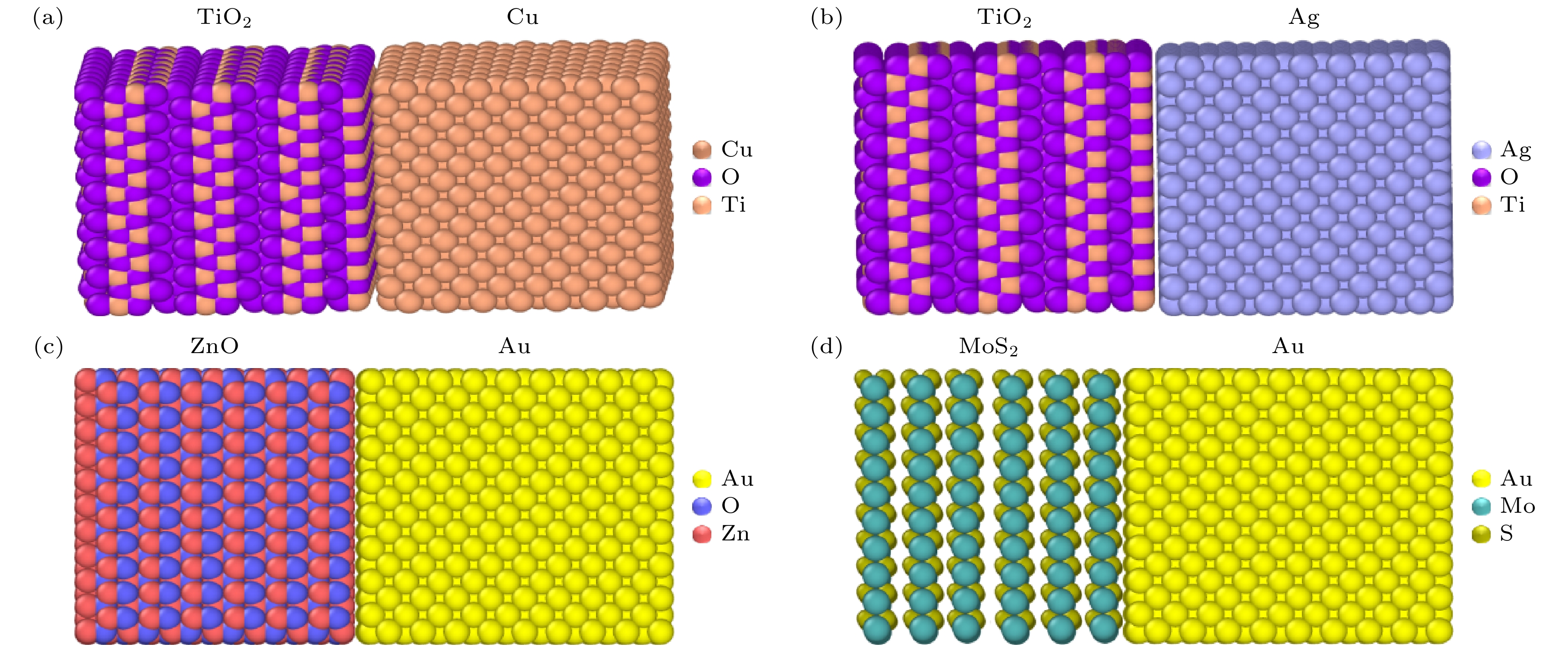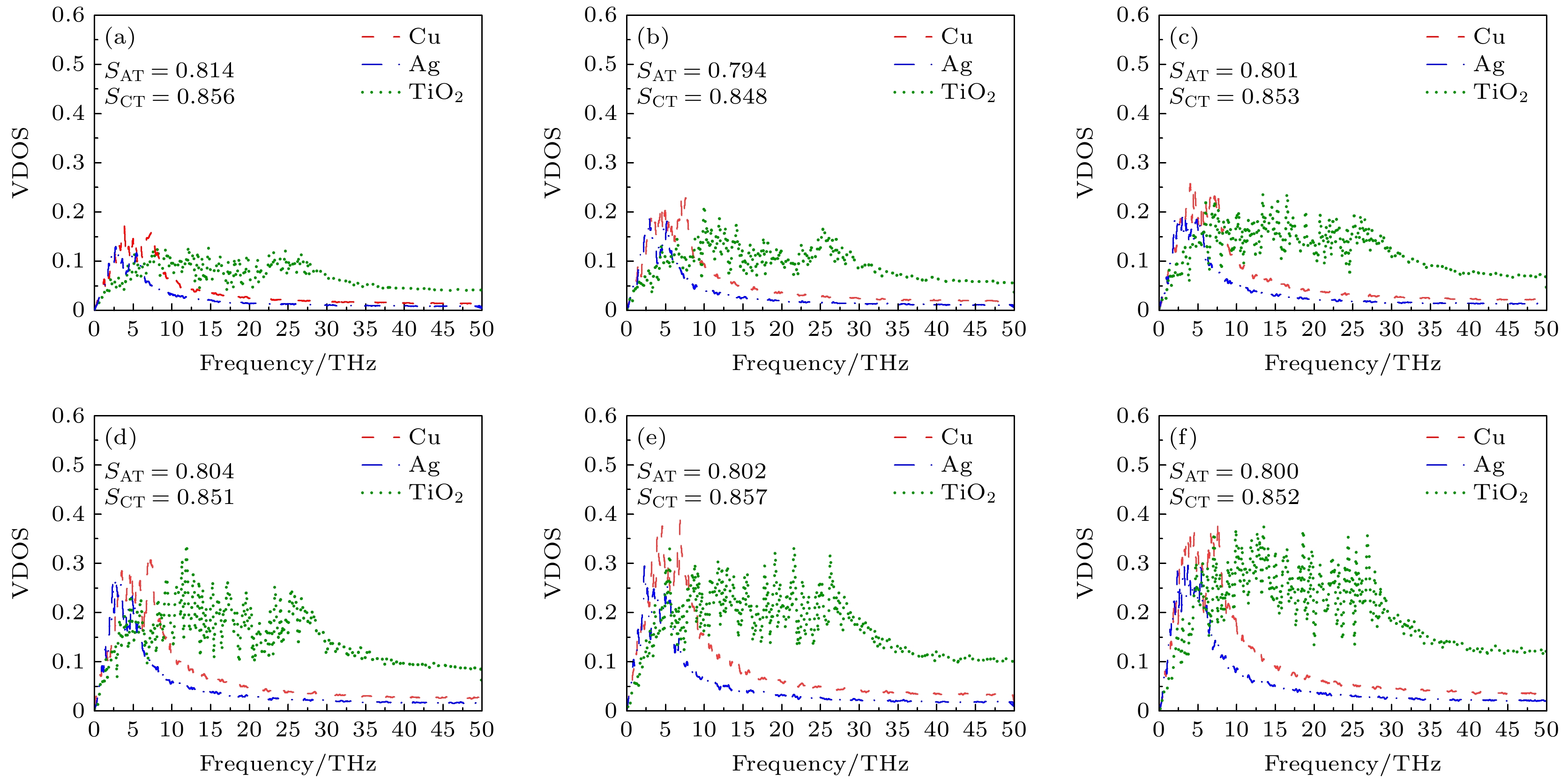Plasmonic solar water splitting is produced on the composite electrode with plasmonic metal nanoparticles loaded on semiconductor, where the localized heating generated by relaxation of the metal’s localized surface plasmon resonance (LSPR) under light excitation enhances hydrogen production efficiency. To optimize composite photoanodes for photoelectrochemical water splitting system, the non-equilibrium molecular dynamics simulations are conducted to obtain the interfacial thermal conductivity between plasmonic metals (Cu, Ag, Au) and semiconductors (TiO2, ZnO, MoS2) at varying temperatures. The relationship between interfacial thermal conductivity and phonons at different frequencies is investigated via vibrational density of states which is calculated from the velocity autocorrelation functions and subsequent phonon participation ratio. The results indicate that as he temperature increases, the interfacial thermal conductivity of all composite electrode configurations is enhanced. When Cu and Ag are combined with TiO2 into Cu-TiO2 and Ag-TiO2, respectively, the thermal transport performances of Cu-TiO2 and Ag-TiO2 are superior to Au-TiO2, and the interfacial thermal conductivity of Cu-TiO2 reaches 973.56 MW·m–2·K–1 at 800 K. With Au as the fixed plasmonic component, Au-ZnO shows that its interfacial thermal conductivity reaches 324.44 MW·m–2·K–1 at 800 K, which is higher than those of Au-MoS2 and Au-TiO2. Based on the obtained interfacial thermal conductivity of different composite photoanodes, it is predicted that Cu-ZnO is the optimal composite, but its interfacial thermal conductivity is 547.69 MW·m–2·K–1 at 800 K, second only to Cu-TiO2. The analysis of vibrational density of states and phonon participation ratio shows that the low-frequency region (0—10 THz) is the main region for thermal transport, and both interfaces exhibit a high phonon participation ratio range of 0.7—0.8. However, the Cu-TiO2 possesses much higher vibrational density of states than Cu-ZnO within this critical band. Although Cu-ZnO exhibits a higher phonon participation ratio range in the high-frequency range, its lower overall interfacial thermal conductivity is attributed to the minimal contribution of high-frequency phonons to interfacial thermal conductance. The findings provide optimization strategies based on interfacial thermal transport mechanisms for constructing efficient photoanodes for solar water splitting.