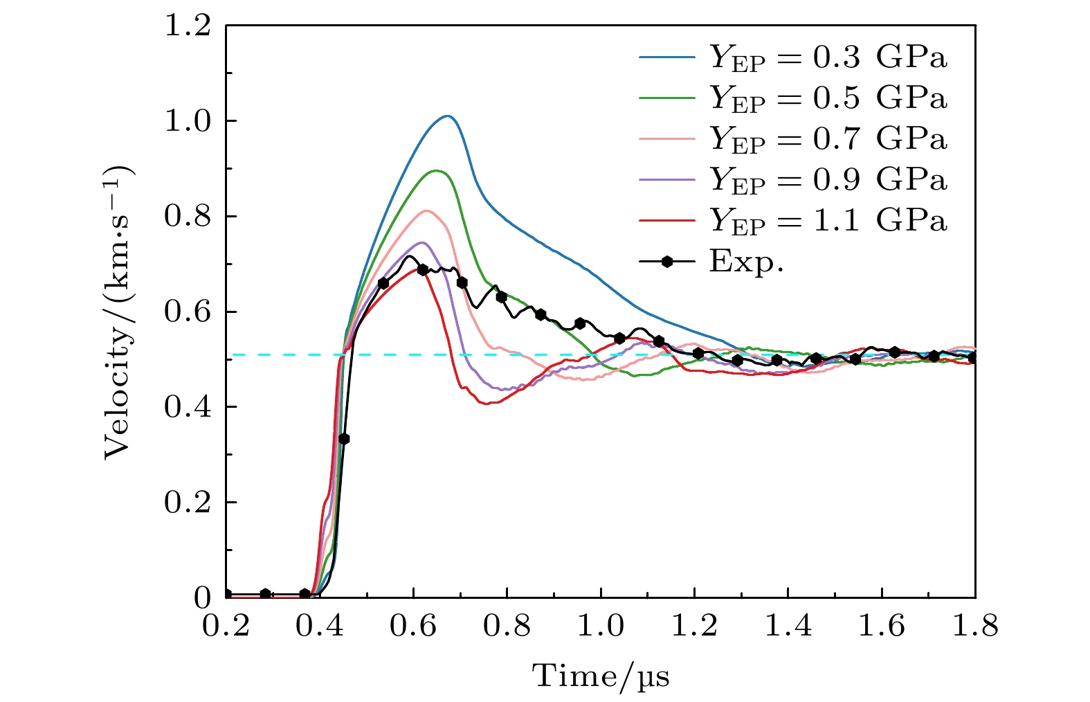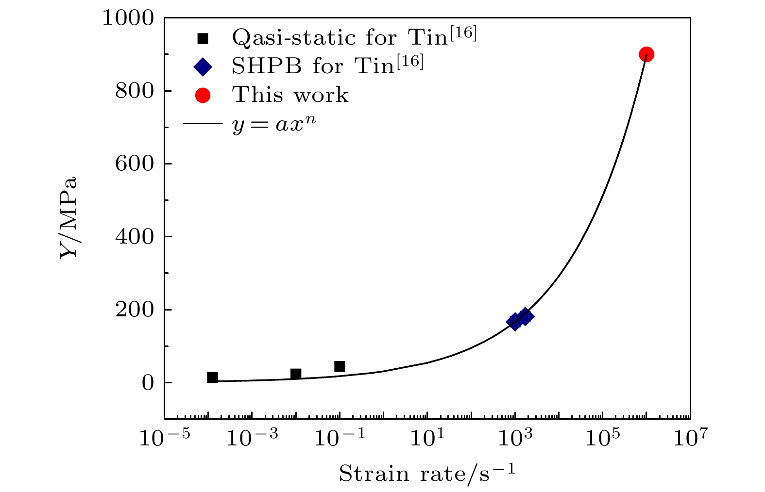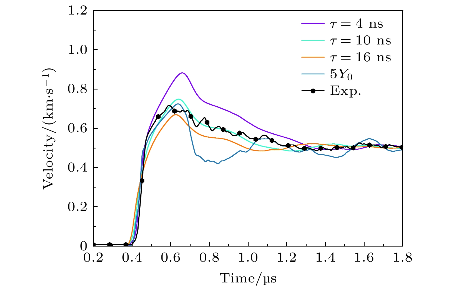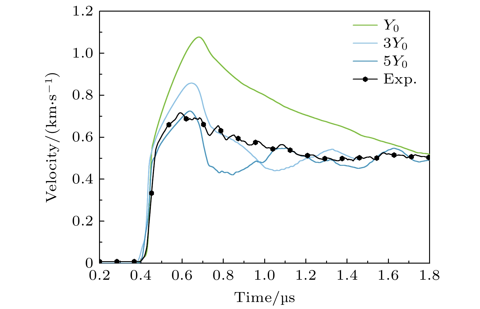 The strain rate effect on strength is a key issue in the study of dynamic constitutive models, and the Richtmyer-Meshkov instability experiment on the free surface of metal reflects the strength behavior under extremely high strain rates. After the shock wave propagates to the free surface and undergoes unloading, the metal enters a near-ambient pressure state and its strain rate exceeds 106 s–1. The initial sinusoidal perturbation exhibits the phase inversion trend of forming spike and bubble structure, while the development of the perturbation gradually stabilizes under the suppression effect of material strength. In the initial research, equivalent strength of metal under high strain rate is usually estimated by total spike growth for perturbation evolutions. Subsequent studies show that the maximum value of the spike velocity which can be directly measured can be the metric to determine equivalent strength. However, the influence of the non-uniformity of strength on the development of spike velocity has not been investigated. Tin is a critical material in the study of dynamic mechanical behavior under extreme conditions. Currently, the experiments of dynamic strength on tin usually combine various effects such as strain rate, pressure, and phase transitions. So far, no research has been found on the Richtmyer-Meshkov (RM) instability experiment, which is a method to separate high strain rate effect on tin free surface. The characteristics of tin dynamic strength behavior under extremely high strain rates are still unclear. This study conducts numerical simulations on the Richtmyer-Meshkov instability experiment of a tin sample with a pre-imposed sinusoidal perturbation with an amplitude 0.15 mm and a wavelength 0.8 mm under a shock pressure of 5.5 GPa. Using our developed two-dimensional explicit finite element program for elastoplastic hydrodynamics, the simulation results of three constitutive models, including elastic-perfectly plastic model, Steinberg-Cochran-Guinan model, and stress relaxation model, on the spike velocity curves are compared with the measurements. The equivalent strength of tin can be evaluated by obtaining a consistent maximum spike velocity of free surface perturbation between the calculation with elastic-perfectly plastic model and measurements. It is found that the strength increases by about 64 times at a strain rate of ~106 s–1 compared with that at a quasi-static strain rate of ~10–4 s–1, indicating that the strain rate hardening is extraordinarily significant. By adjusting model parameters, both the elastic-perfectly plastic model and Steinberg-Cochran-Guinan model can capture the maximum spike velocity but fail to reproduce the unloading process observed in experiment. Compared with the experimental results, the calculated spike velocity decreases too rapidly. In contrast, stress relaxation model due to considering strain rate effects achieves excellent agreement with the entire experimental spike velocity evolution, not only capturing the peak velocity but also solving the problem of overly rapid velocity decay. This demonstrates that the strain rate effect on material strength not only suppresses the maximum spike velocity but also affects the deceleration stage, revealing that the influence of strain rate effect persists throughout different stages of perturbation development. This study indicates that the experiment data available for dynamic constitutive model research extend from a single peak velocity value to the complete velocity evolution. The utilization efficiency of experimental data is greatly improved, providing important values for studying the dynamic constitutive models under extremely high strain rates.