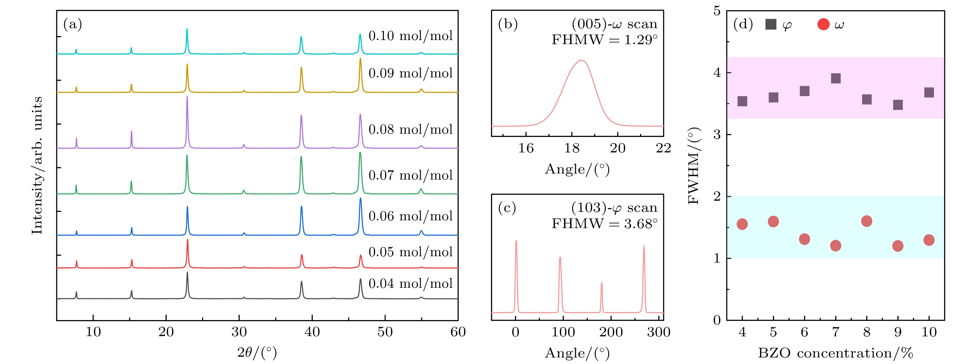 图 2 (a) 不同BZO浓度下BZO-YBCO膜的XRD谱图; (b) 添加摩尔百分比浓度为10% BZO纳米晶的YBCO膜的(005)-ω扫描图和(c) (103)-φ扫描图; (d) 添加不同BZO浓度下面外ω-(005)扫描图和面内φ-(103) YBCO膜的FWHM图