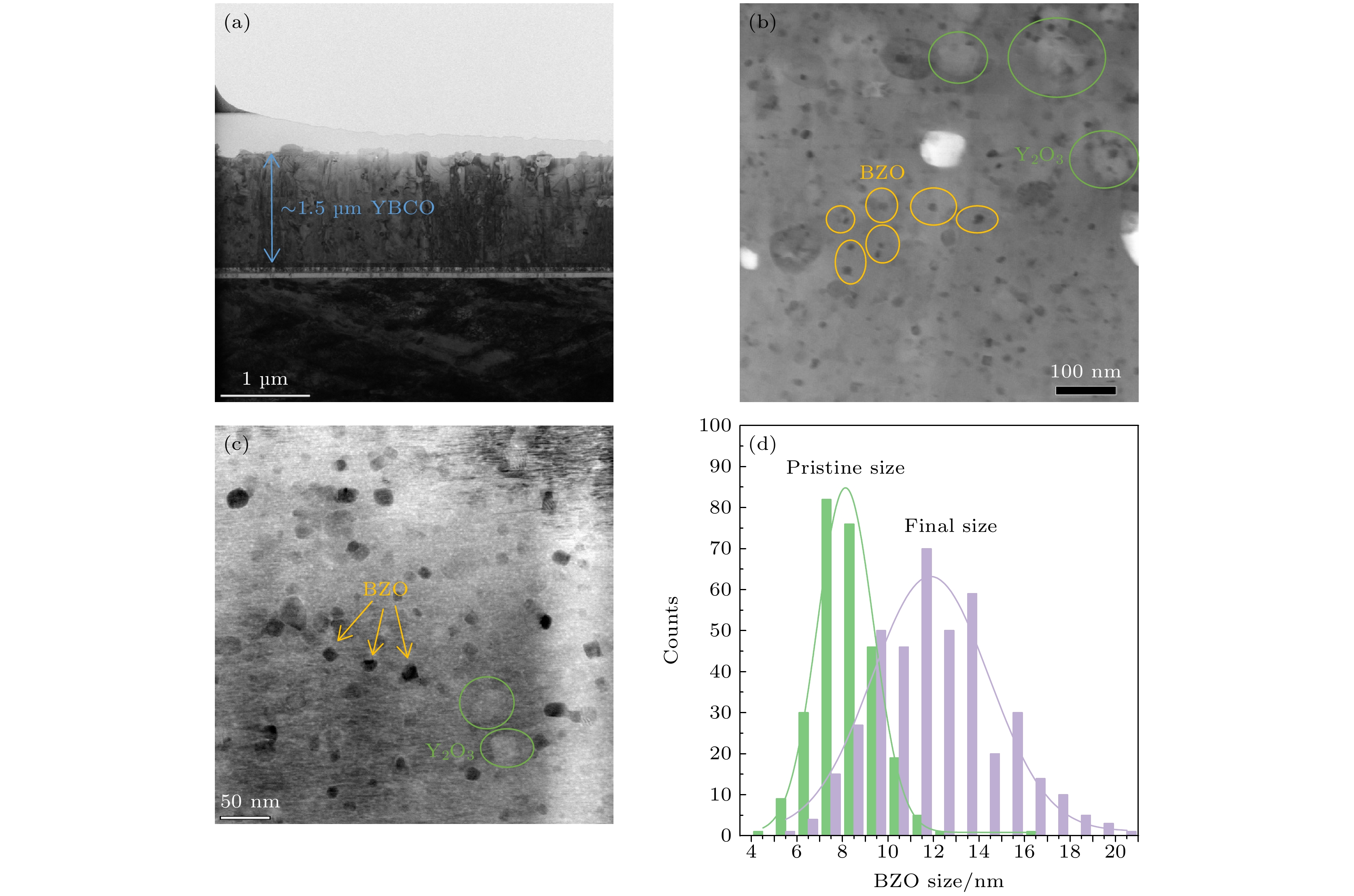 图 3 YBCO纳米复合膜的组成与微观结构 (a) TEM横截面图; (b), (c) 高分辨率TEM图像(显示YBCO基体内孤立的、随机取向的BZO颗粒); (d) 粗化前后BZO纳米晶的粒径分布