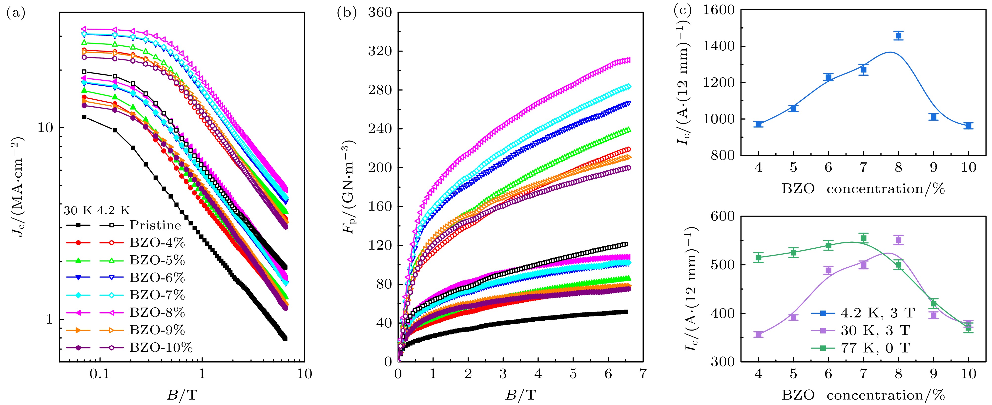 Figure 5. Variation of critical current density (Jc) and pinning force (Fp) with magnetic field for YBCO films with different concentrations of BZO nanocrystals at various temperatures: (a) 4.2 K; (b) 30 K; (c) the variation trend of critical current (Ic) for YBCO films with different concentrations of BZO addition under various temperatures and magnetic field conditions.